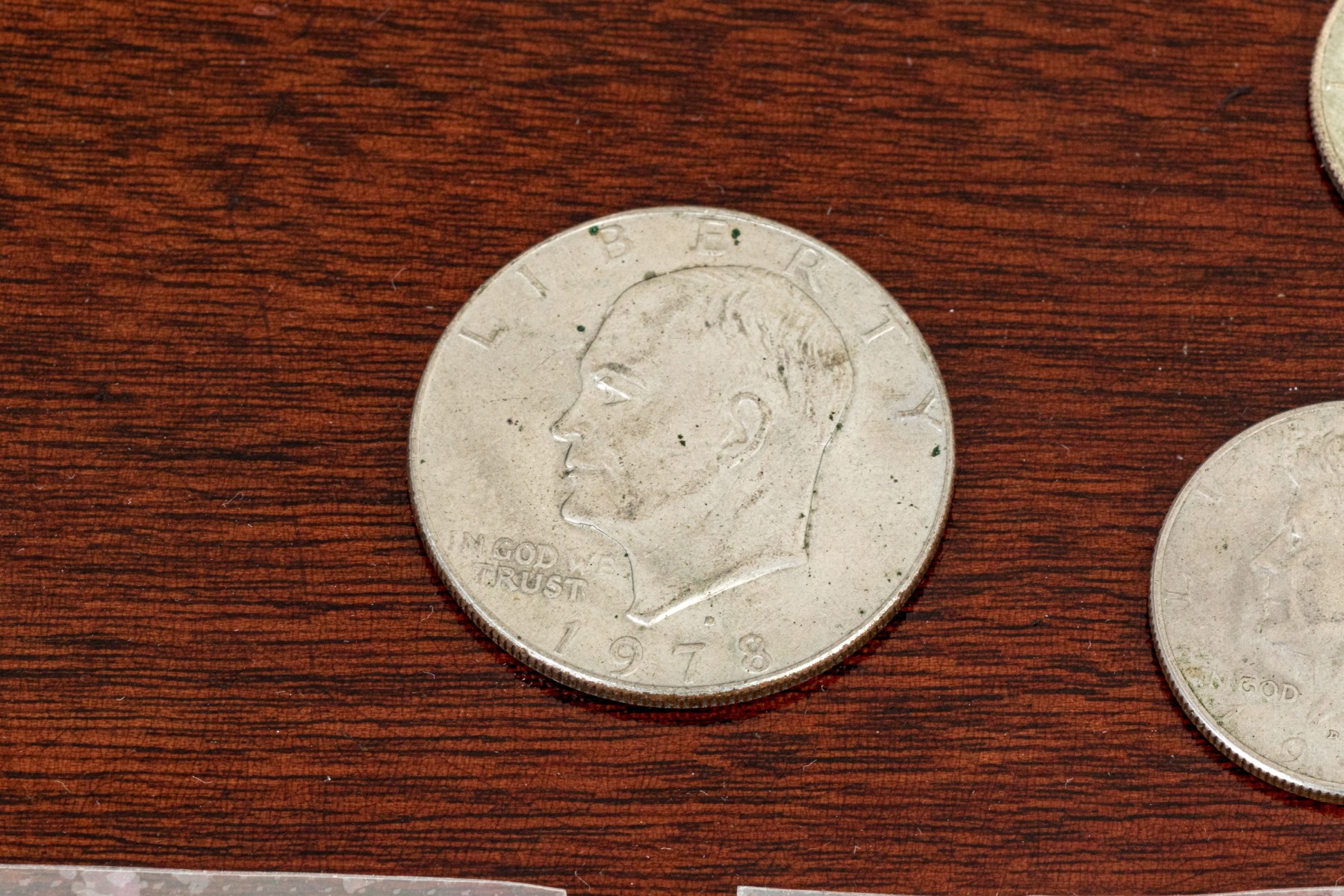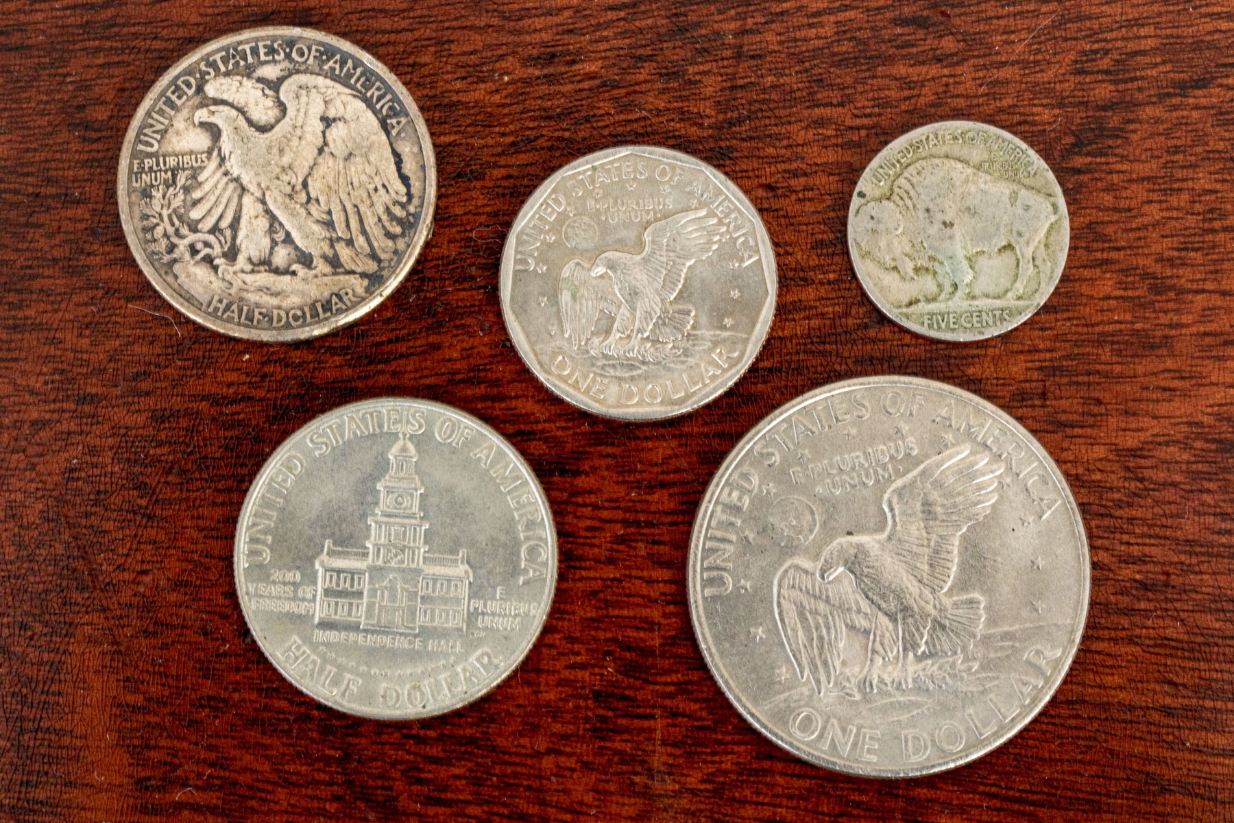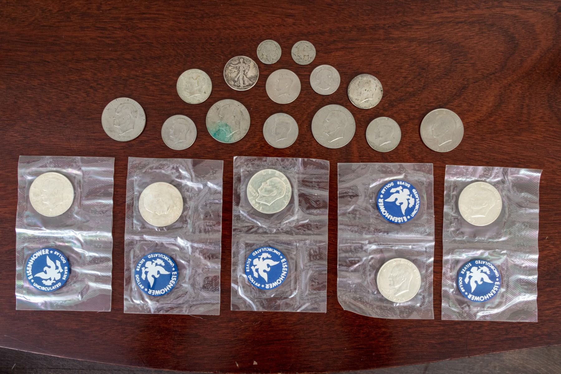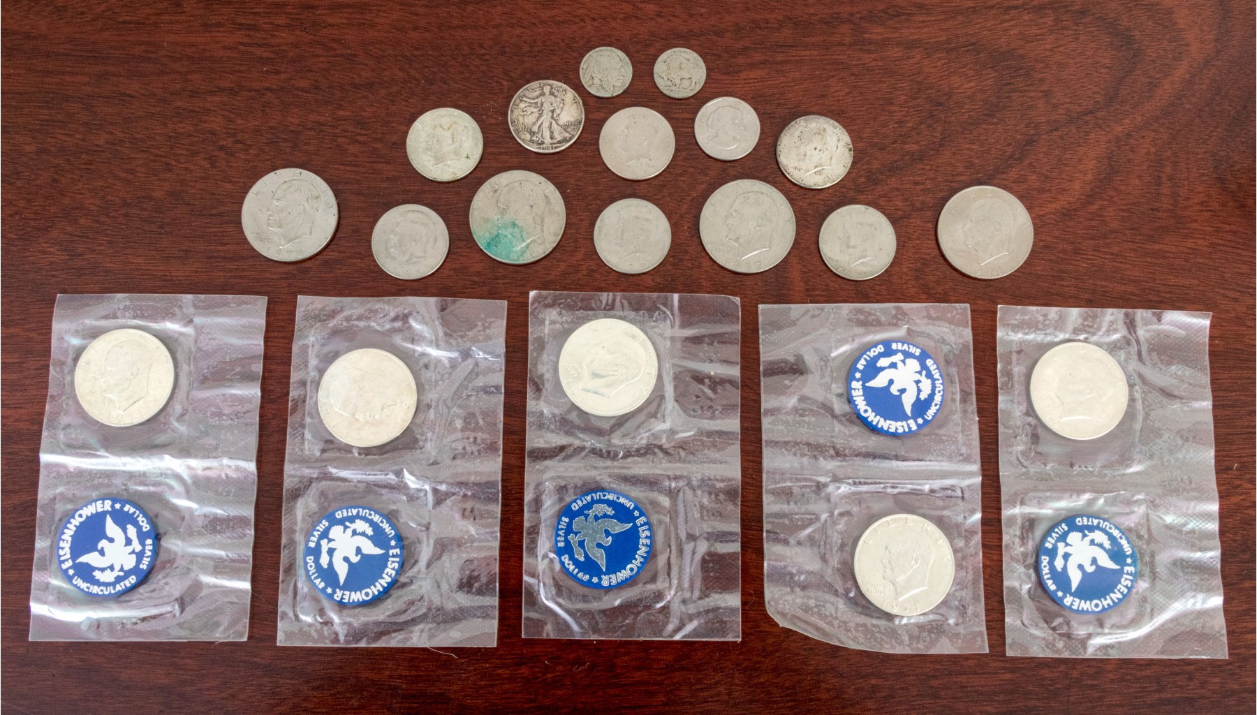 Five uncirculated 40% silver dollars, three 90% half dollars, plus $7 face value