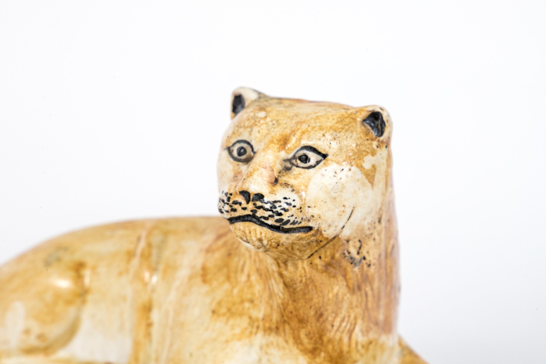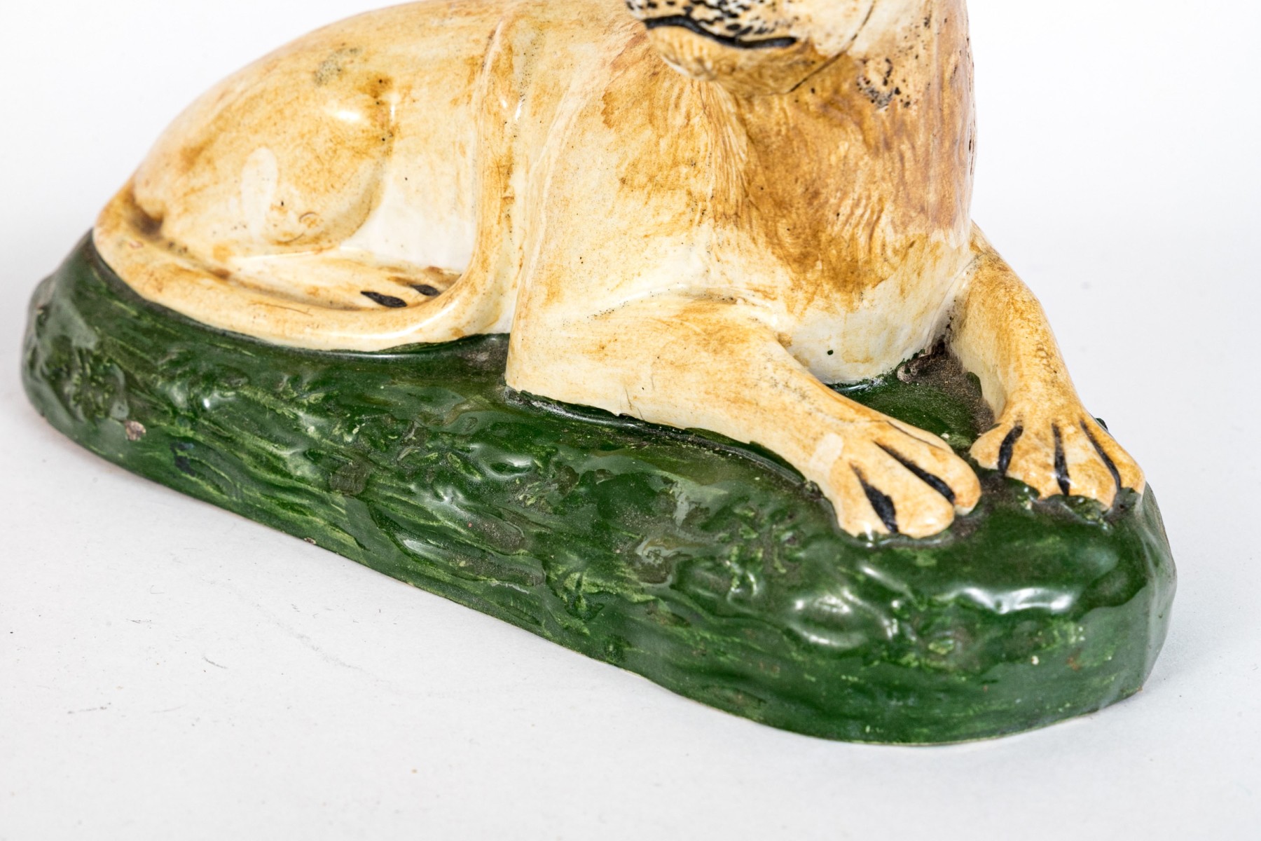 Including a recumbent lion on a grassy base. The lion while posed in recumbent position has its head up and turned to the right as if watching to potentially strike. The lion is wonderfully painted as is the grassy base it lays upon.
