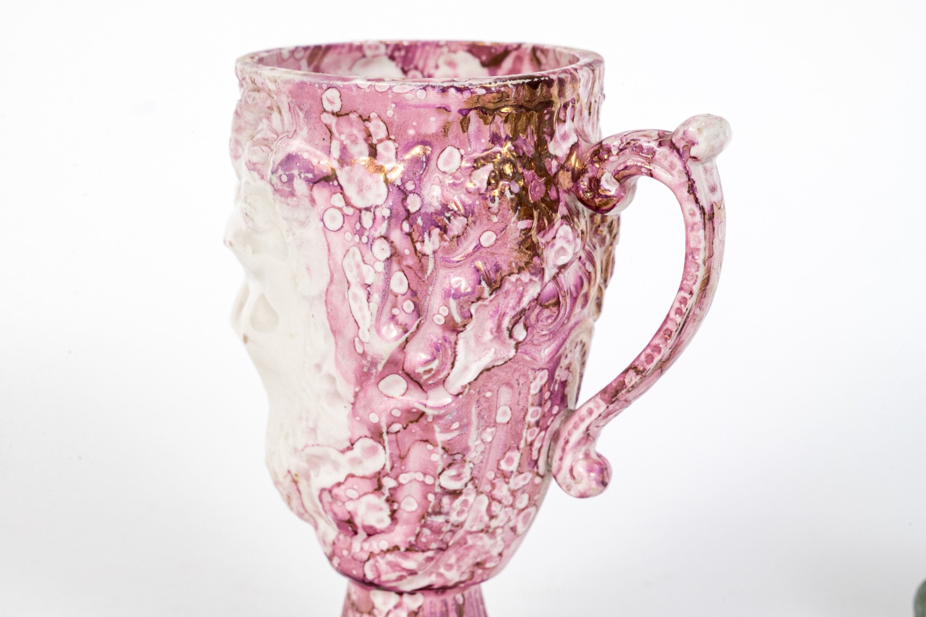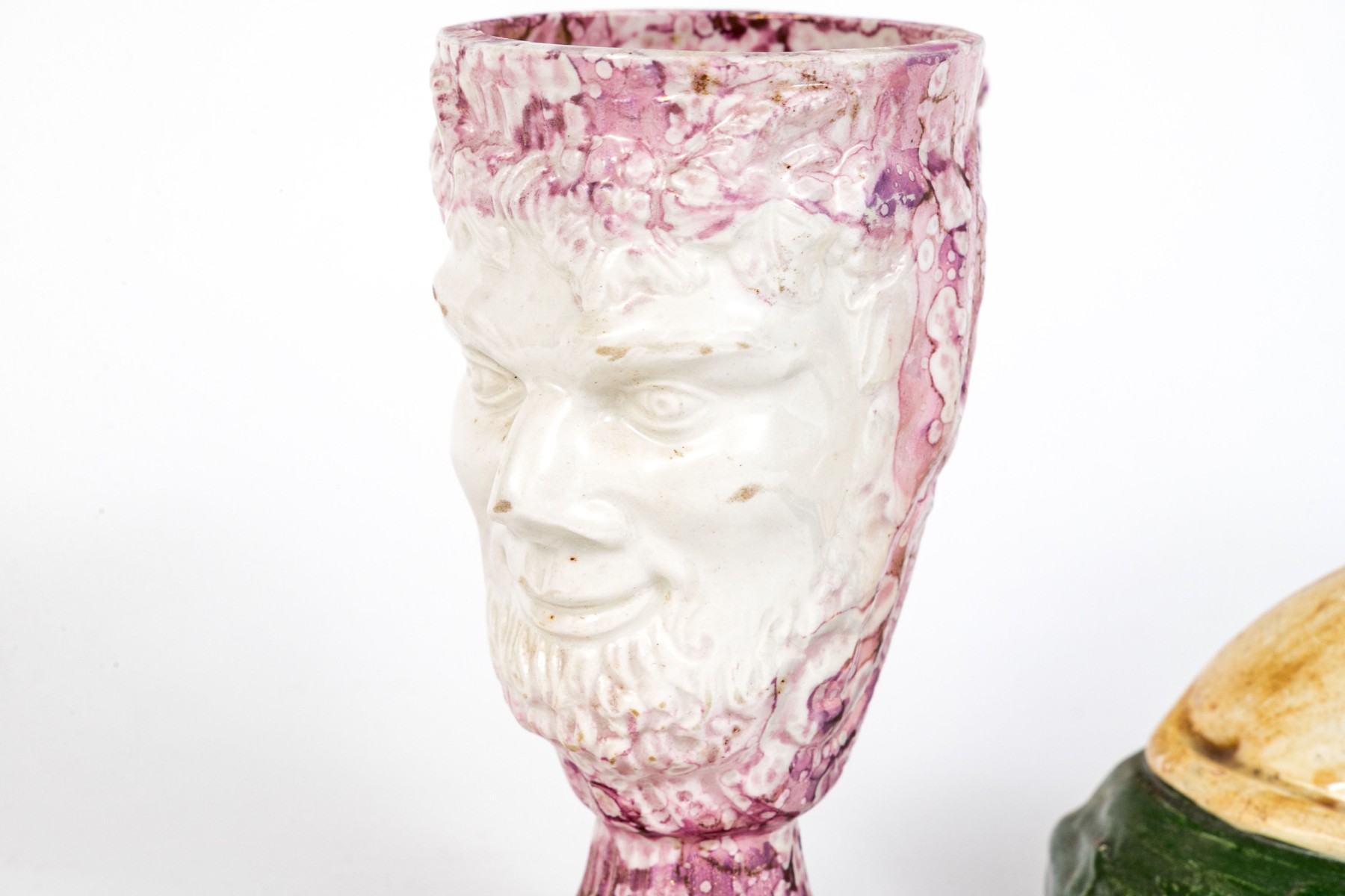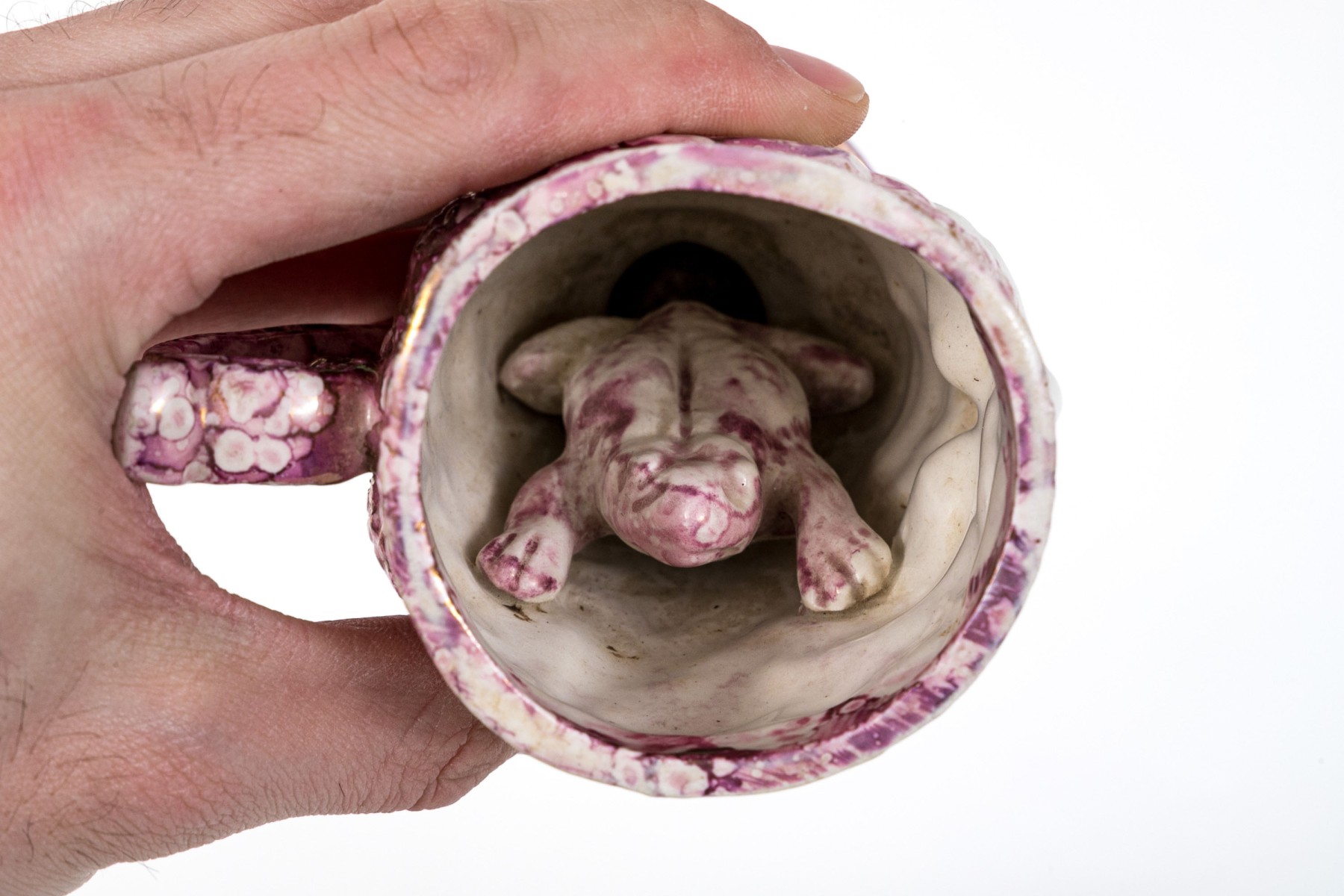 Together with a footed goblet with handle. The hand painted and moulded goblet has a human face to the front with nose that projects outward and well delineated beard. There is a moulded frog inside the cup that appears to be attempting to jump upwards. The cup is painted with a rouge and gilt finish.