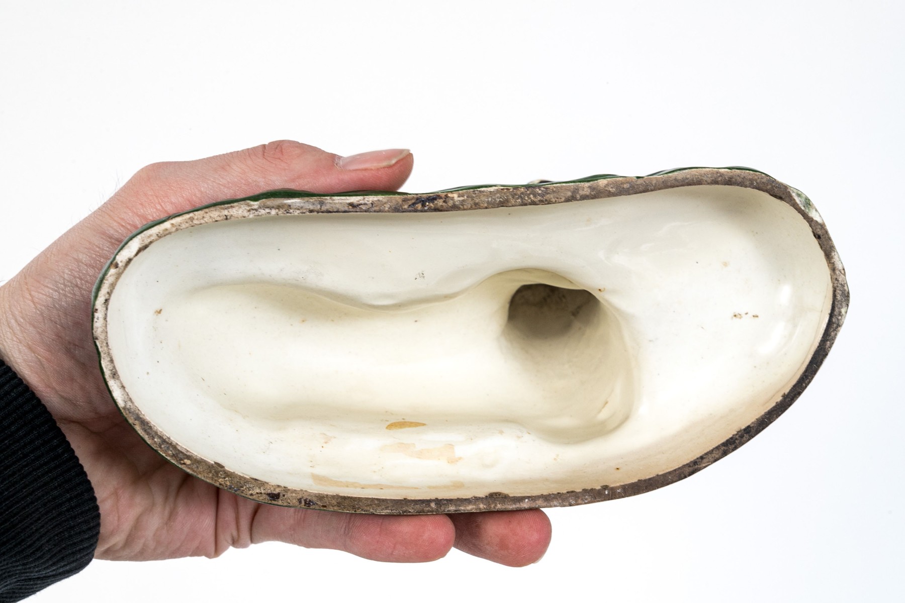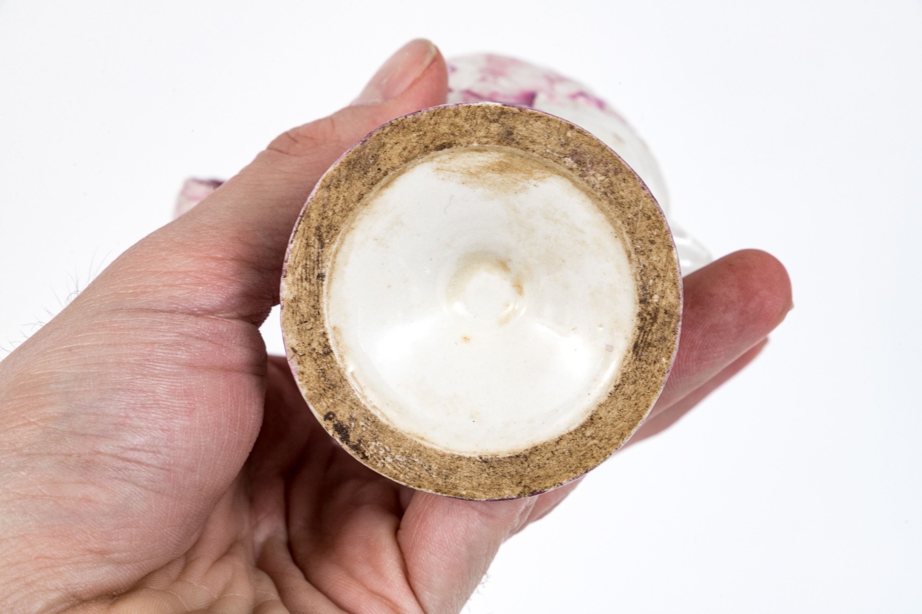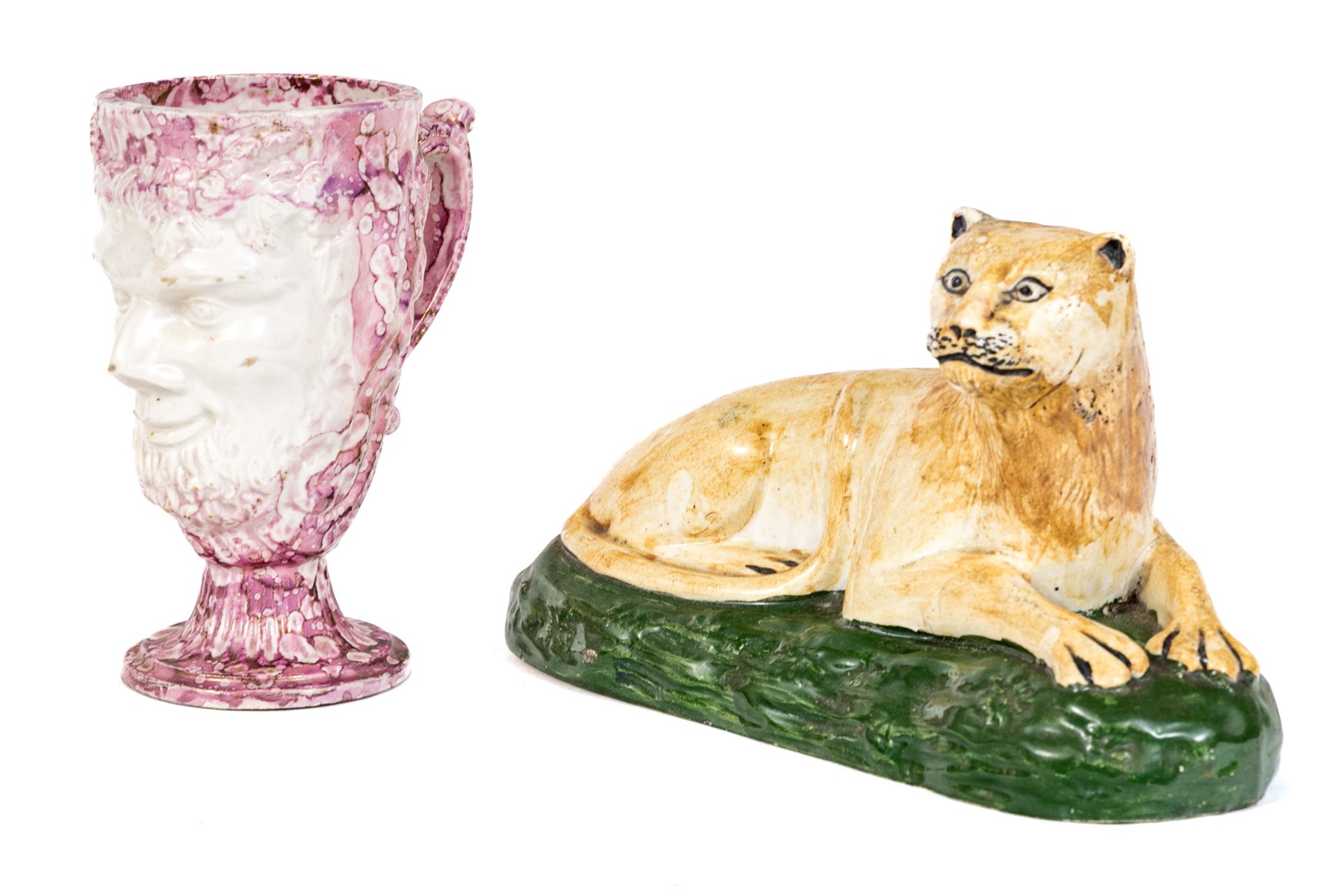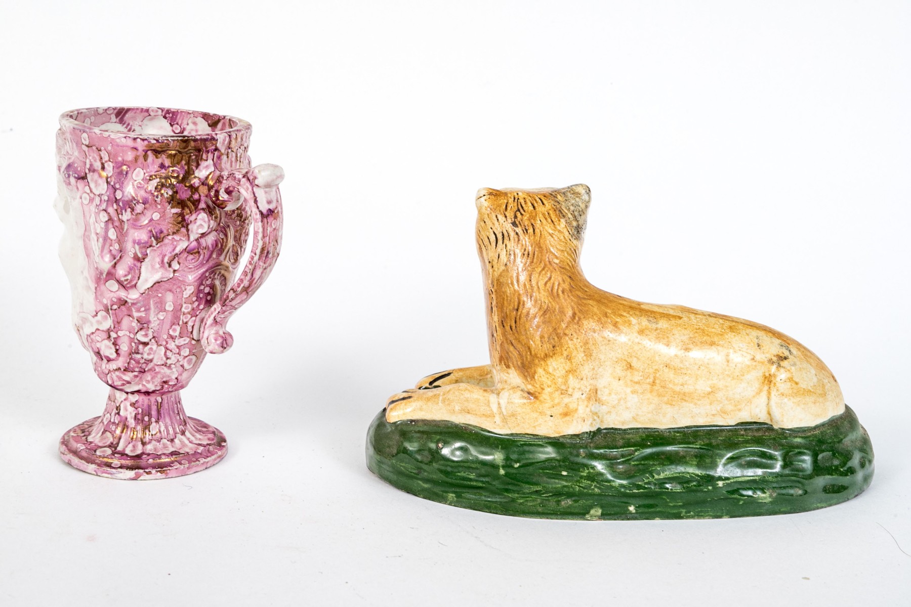 Together with a footed goblet with handle. The hand painted and moulded goblet has a human face to the front with nose that projects outward and well delineated beard. There is a moulded frog inside the cup that appears to be attempting to jump upwards. The cup is painted with a rouge and gilt finish.
