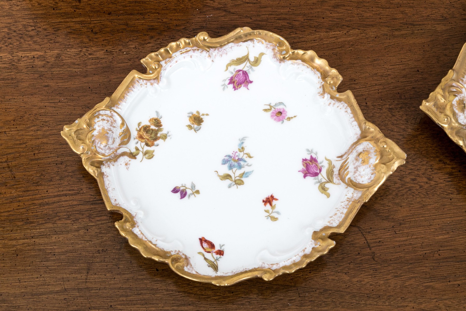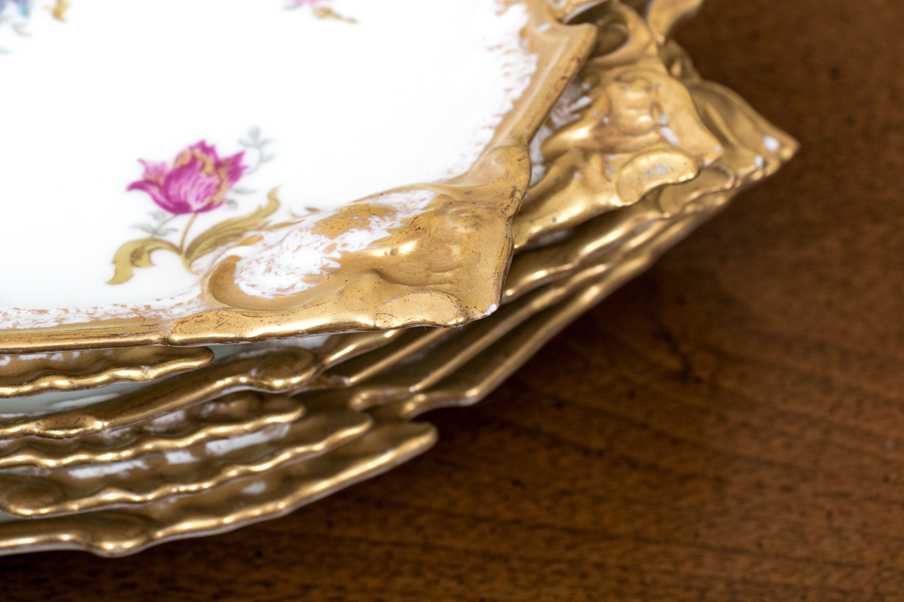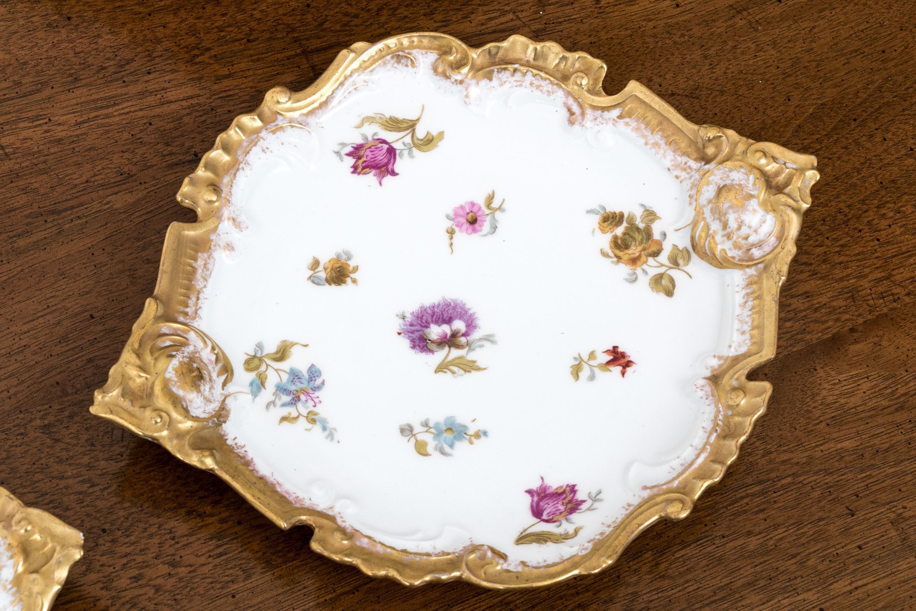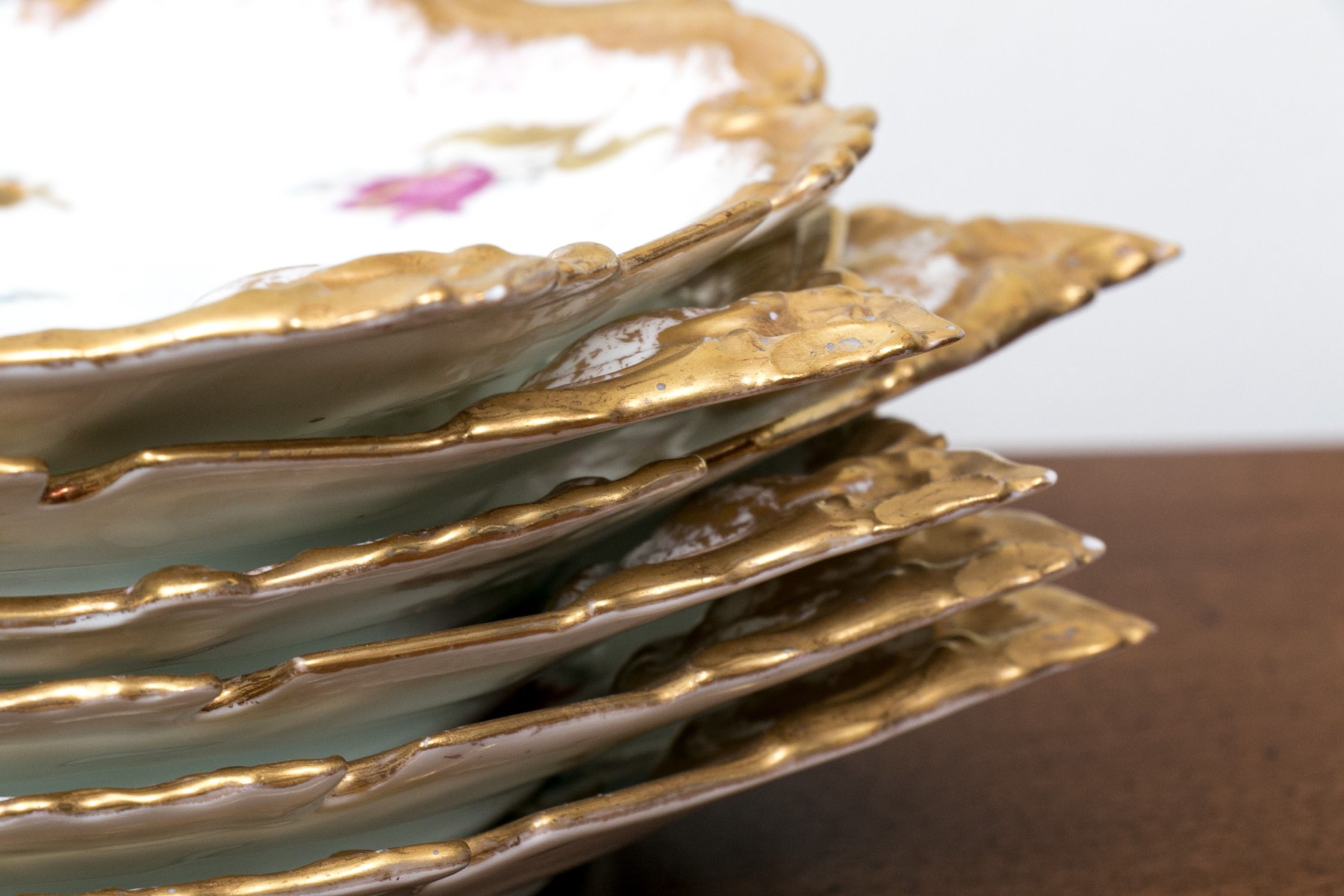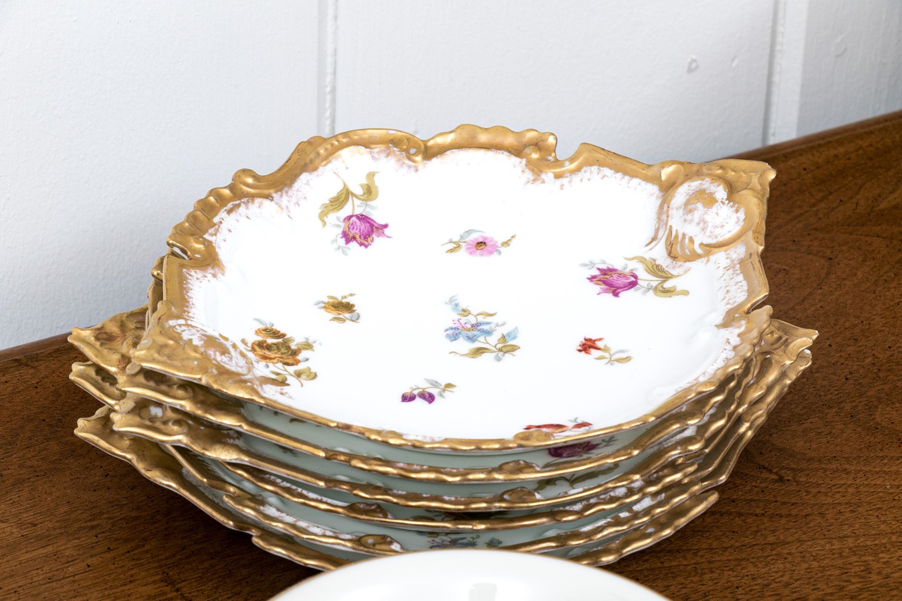 A fine set of 12 19th century French dessert plates in white with scalloped gilt rims and pointed cartouche shaped handles. Colored floral sprays decorate the centers.