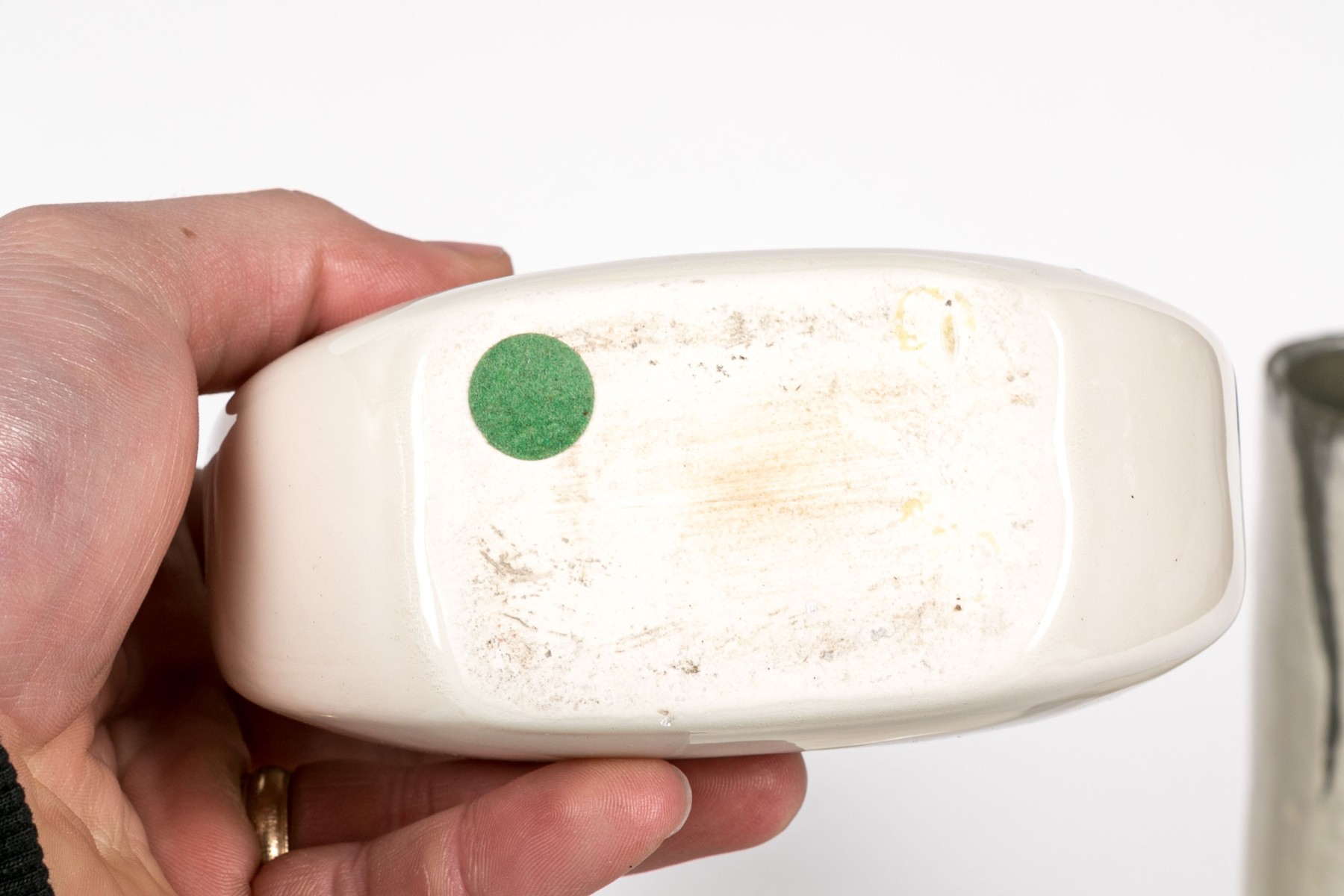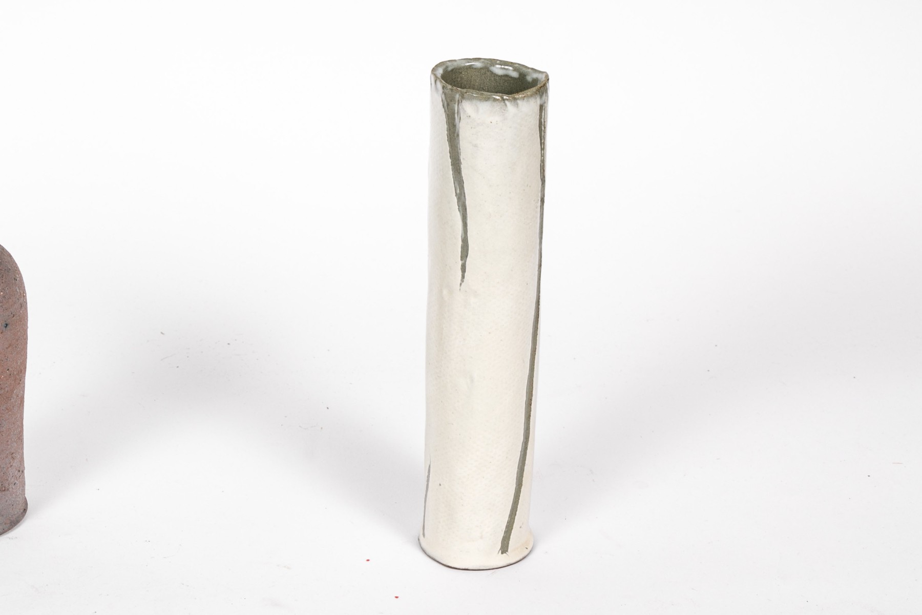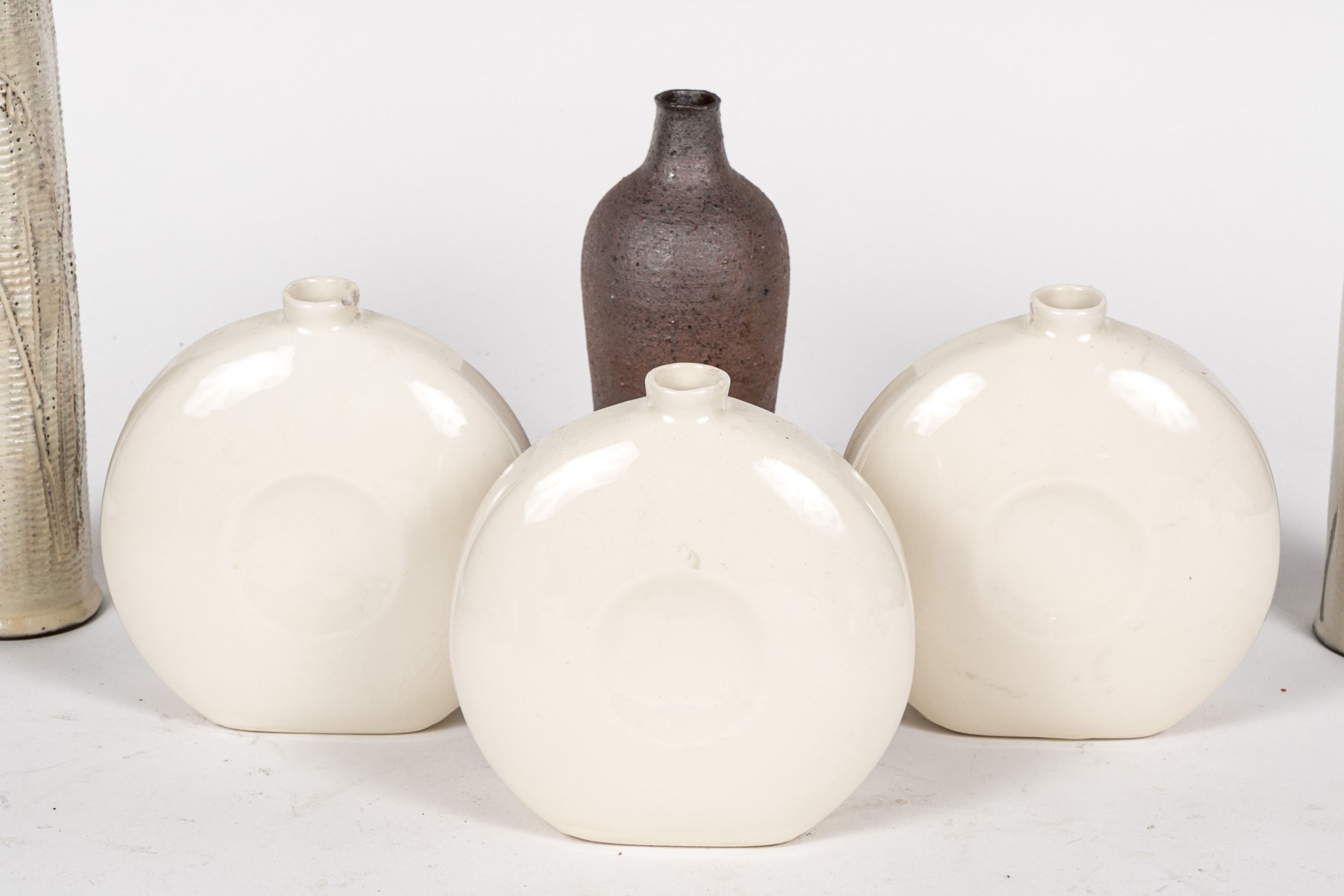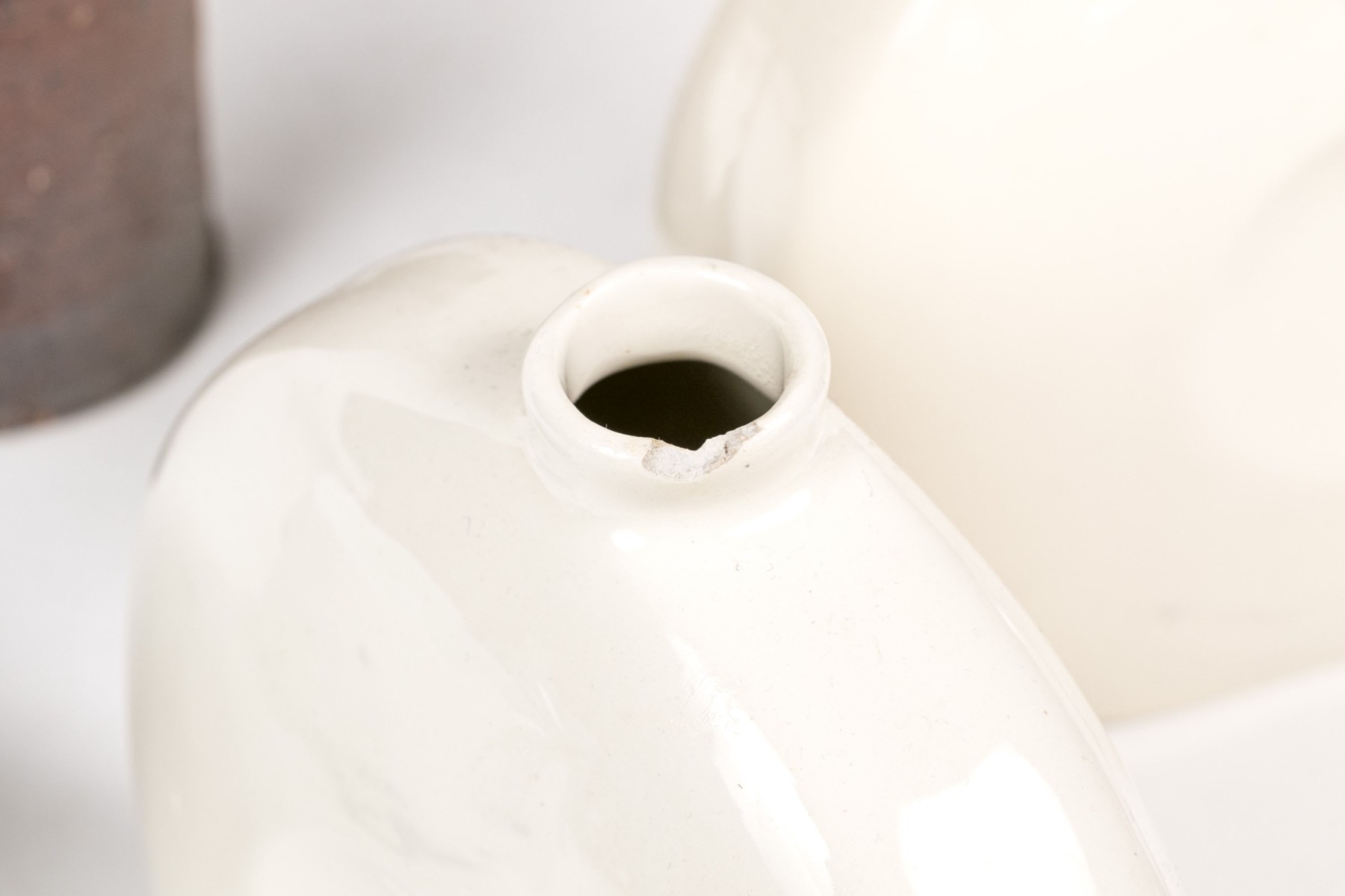 and a set of three flat white glazed vases, one with a chip to the rim and a crack on the side, 5 5/8" H x 5" W x 2"