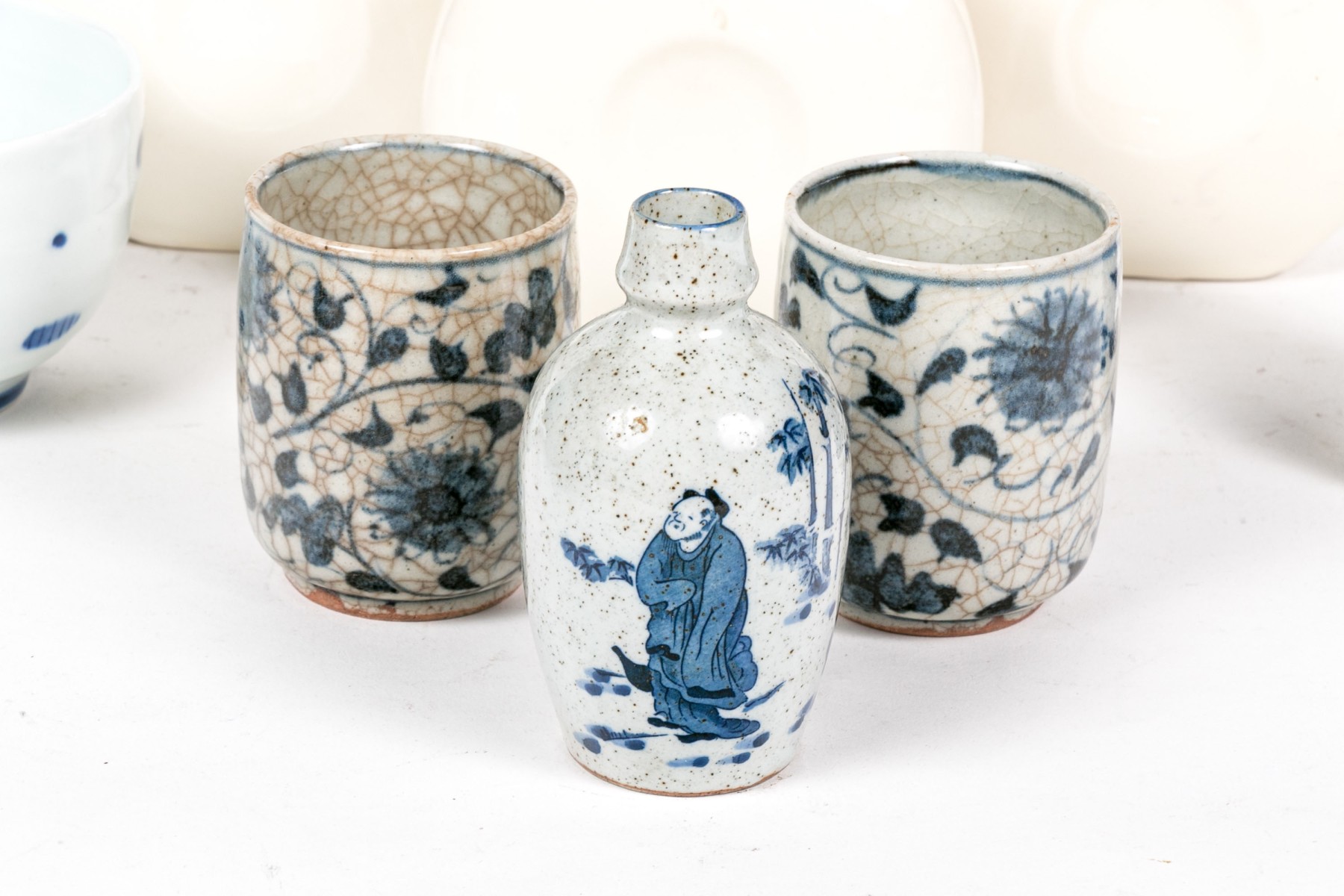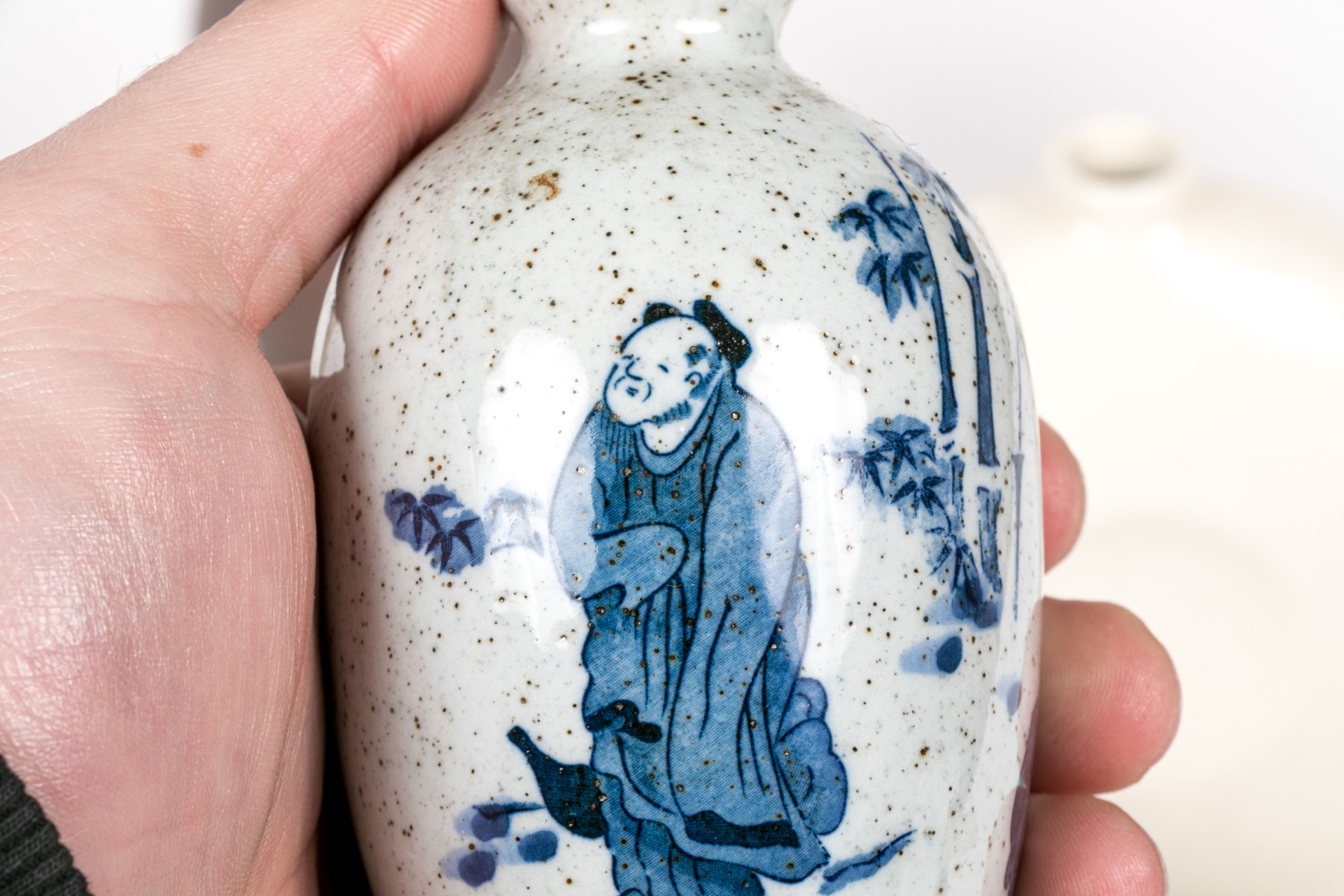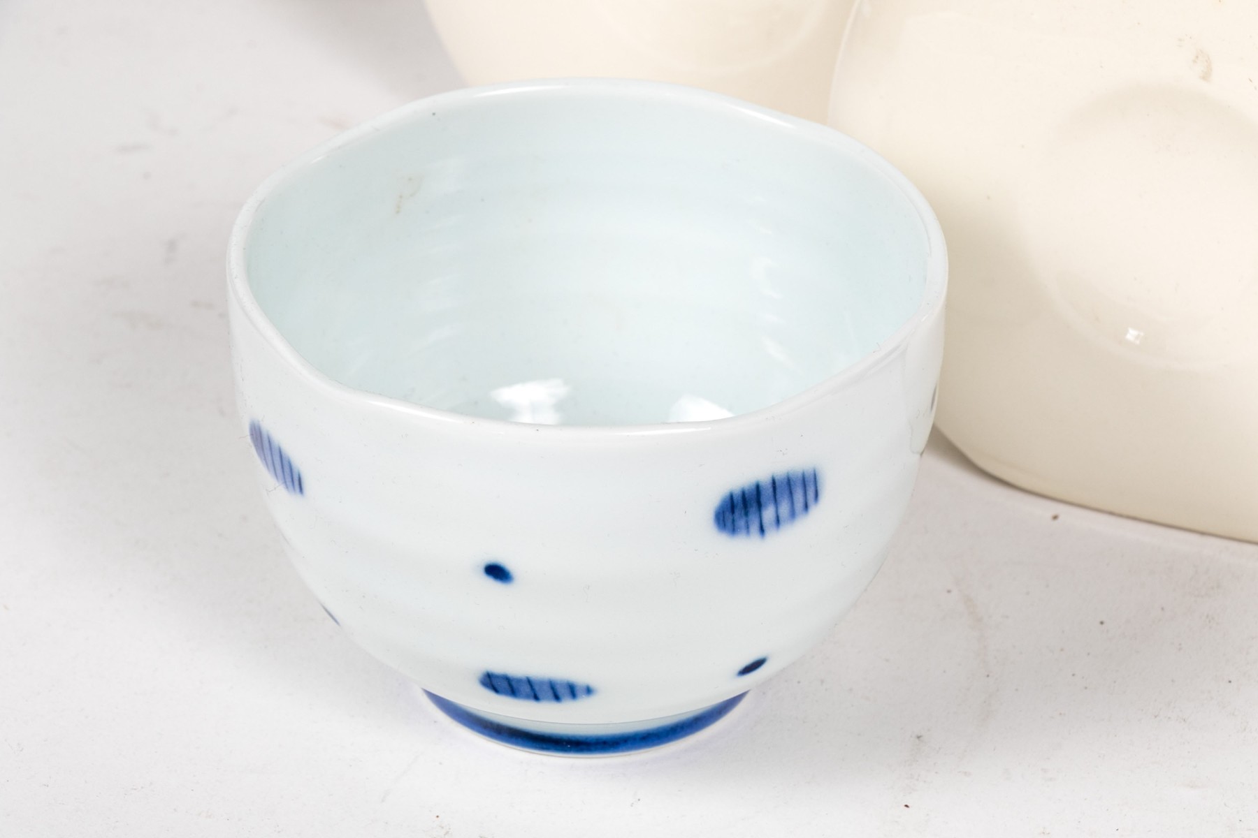 and a set of three flat white glazed vases, one with a chip to the rim and a crack on the side, 5 5/8" H x 5" W x 2"