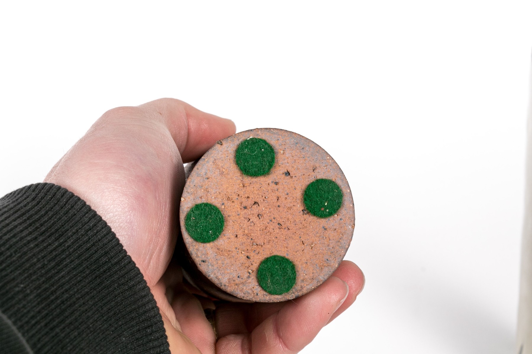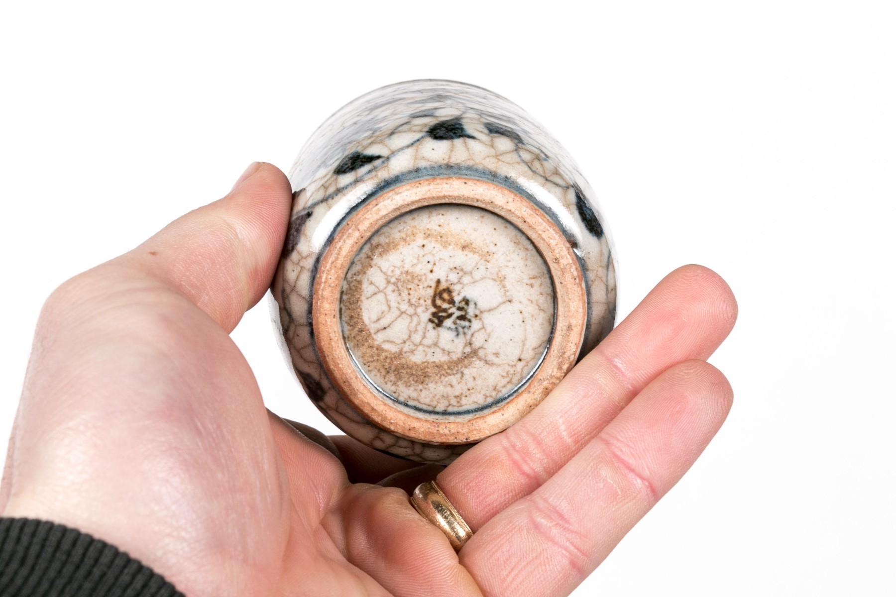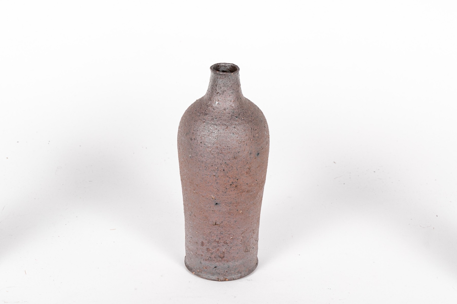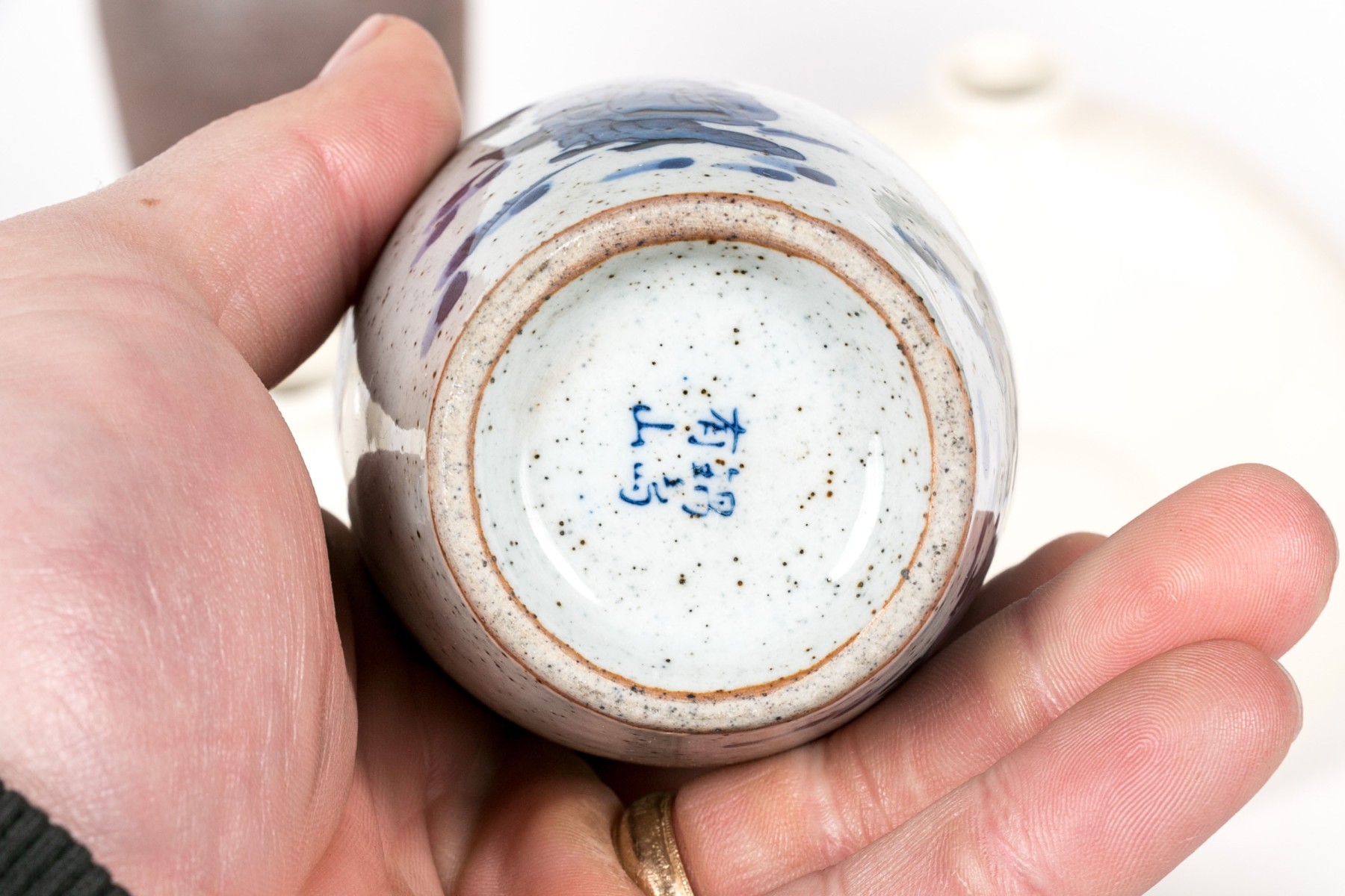 and a set of three flat white glazed vases, one with a chip to the rim and a crack on the side, 5 5/8" H x 5" W x 2"