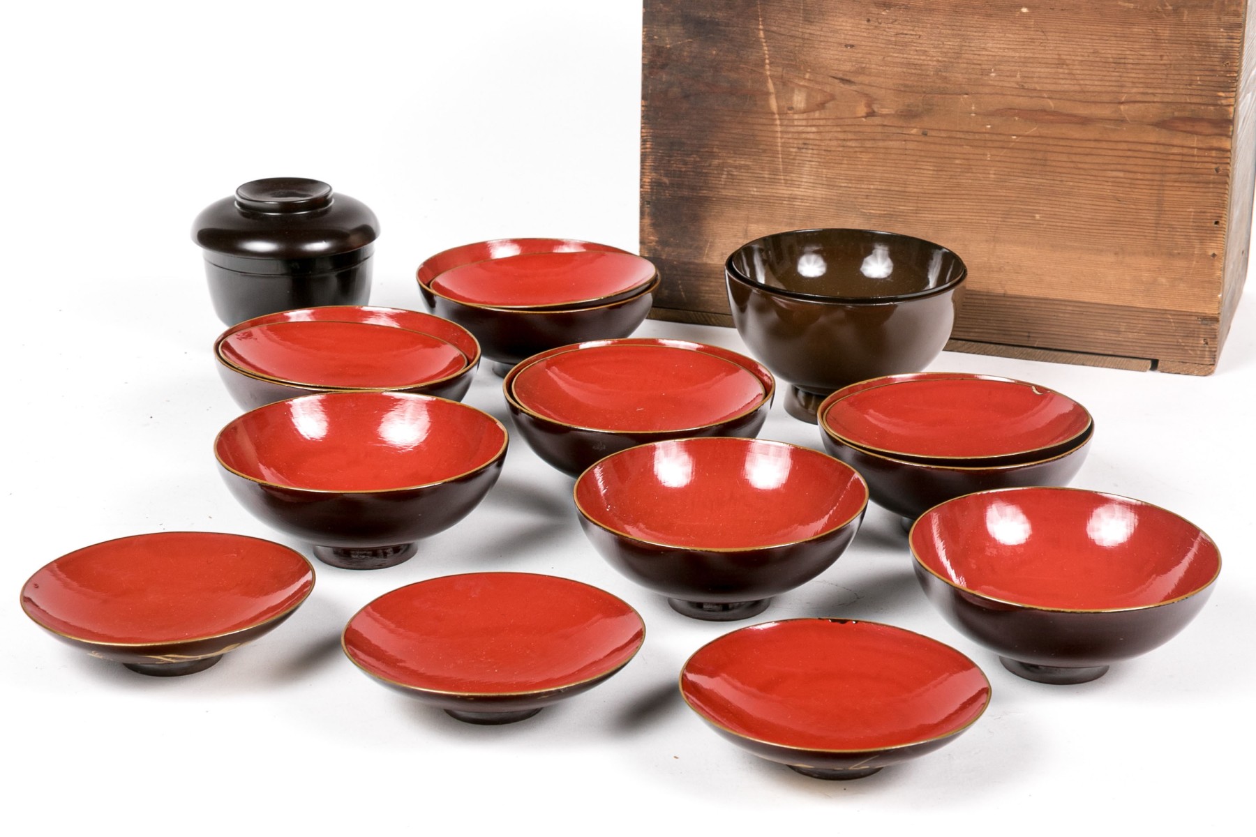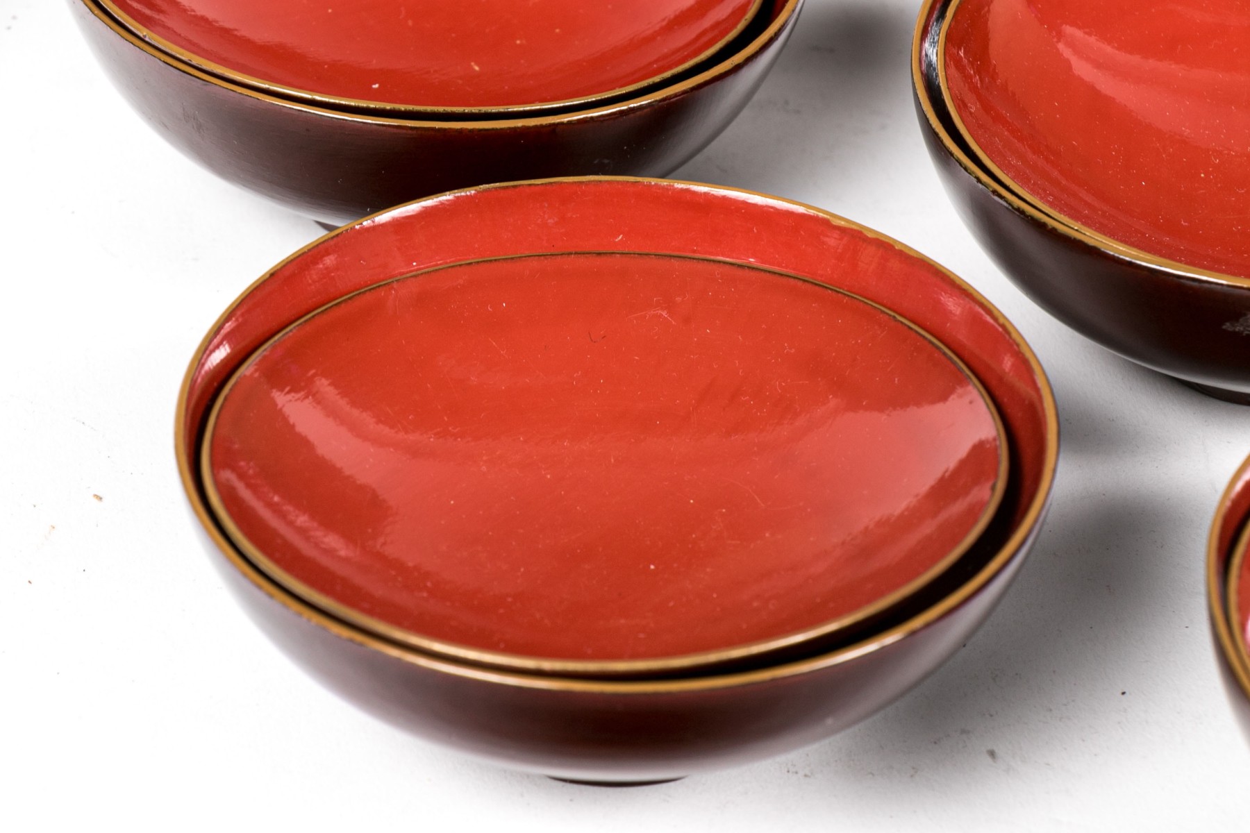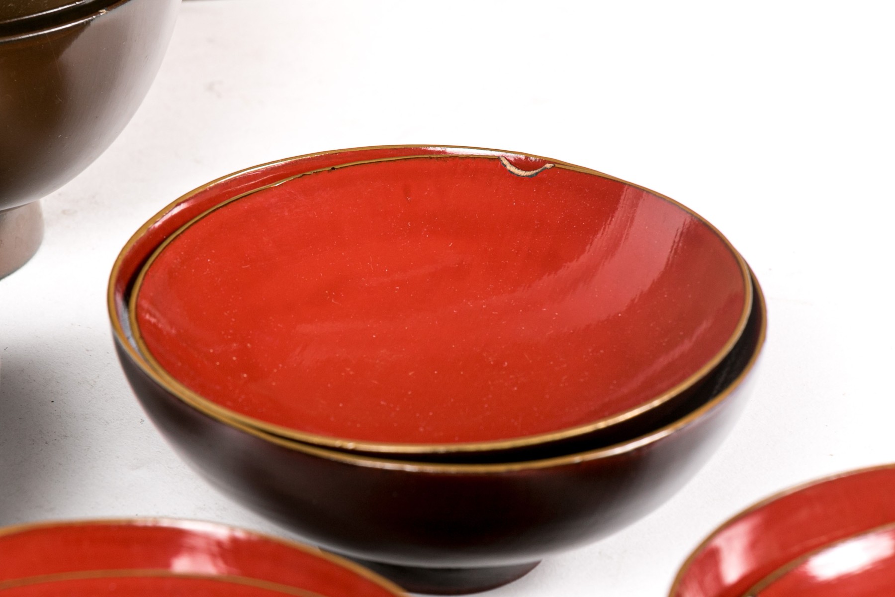 set of seven brown bowls with red inside and lids decorated with gilt foliage- 5" Dia x 2" H, chip to one lid rim.