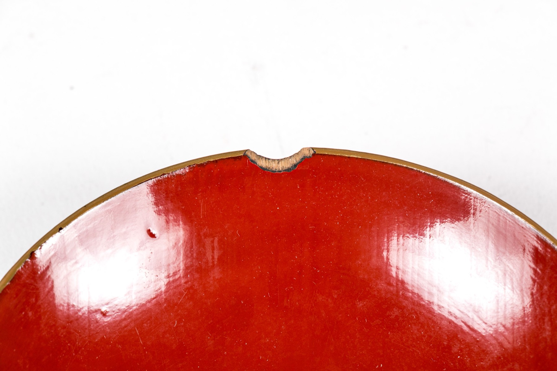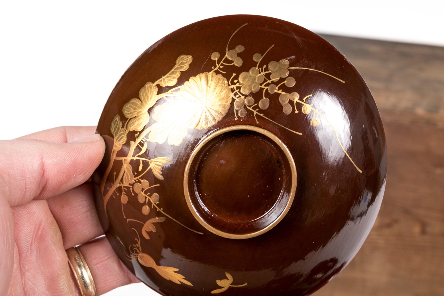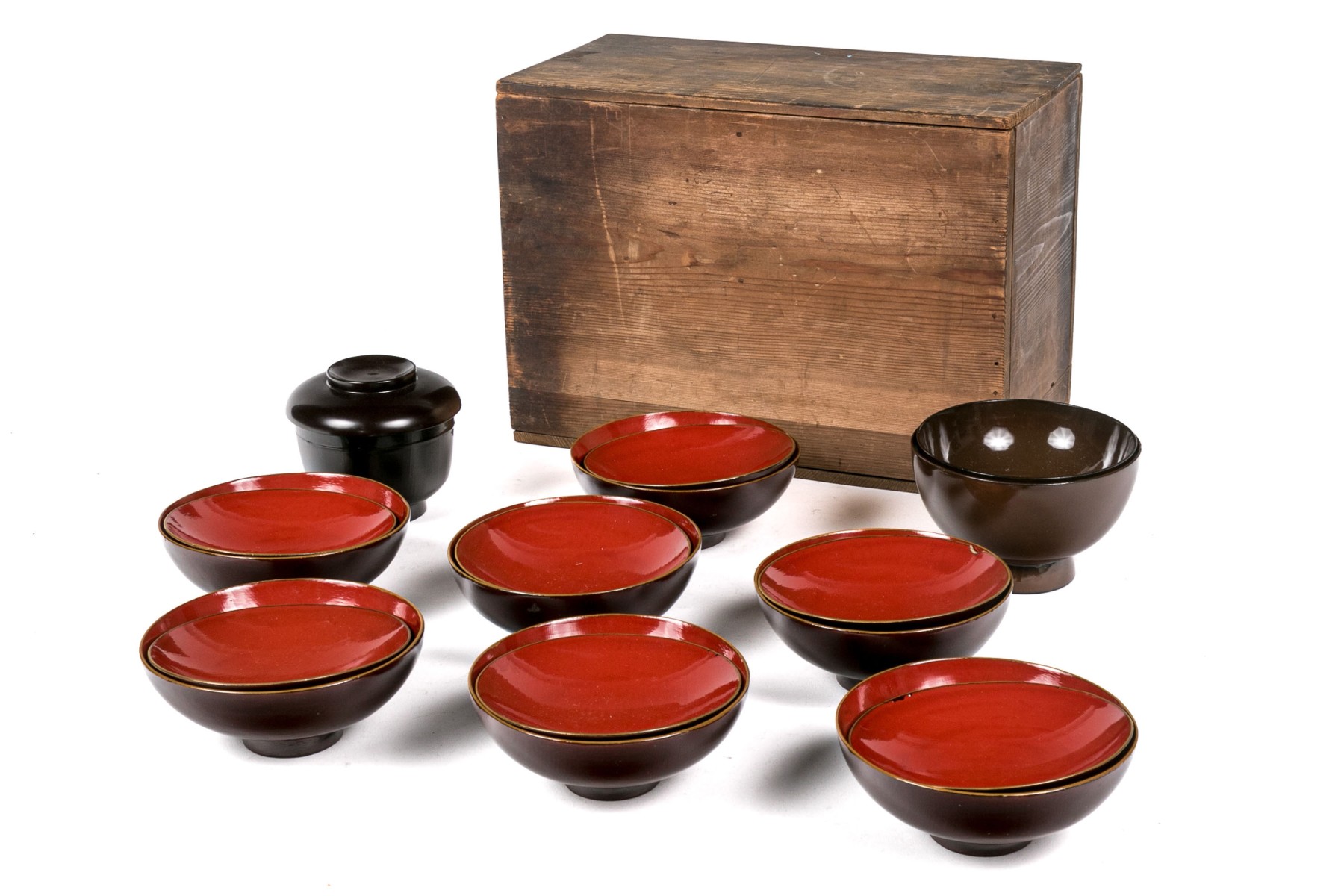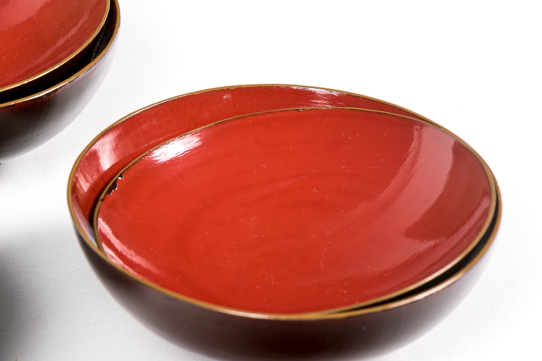 set of seven brown bowls with red inside and lids decorated with gilt foliage- 5" Dia x 2" H, chip to one lid rim.
