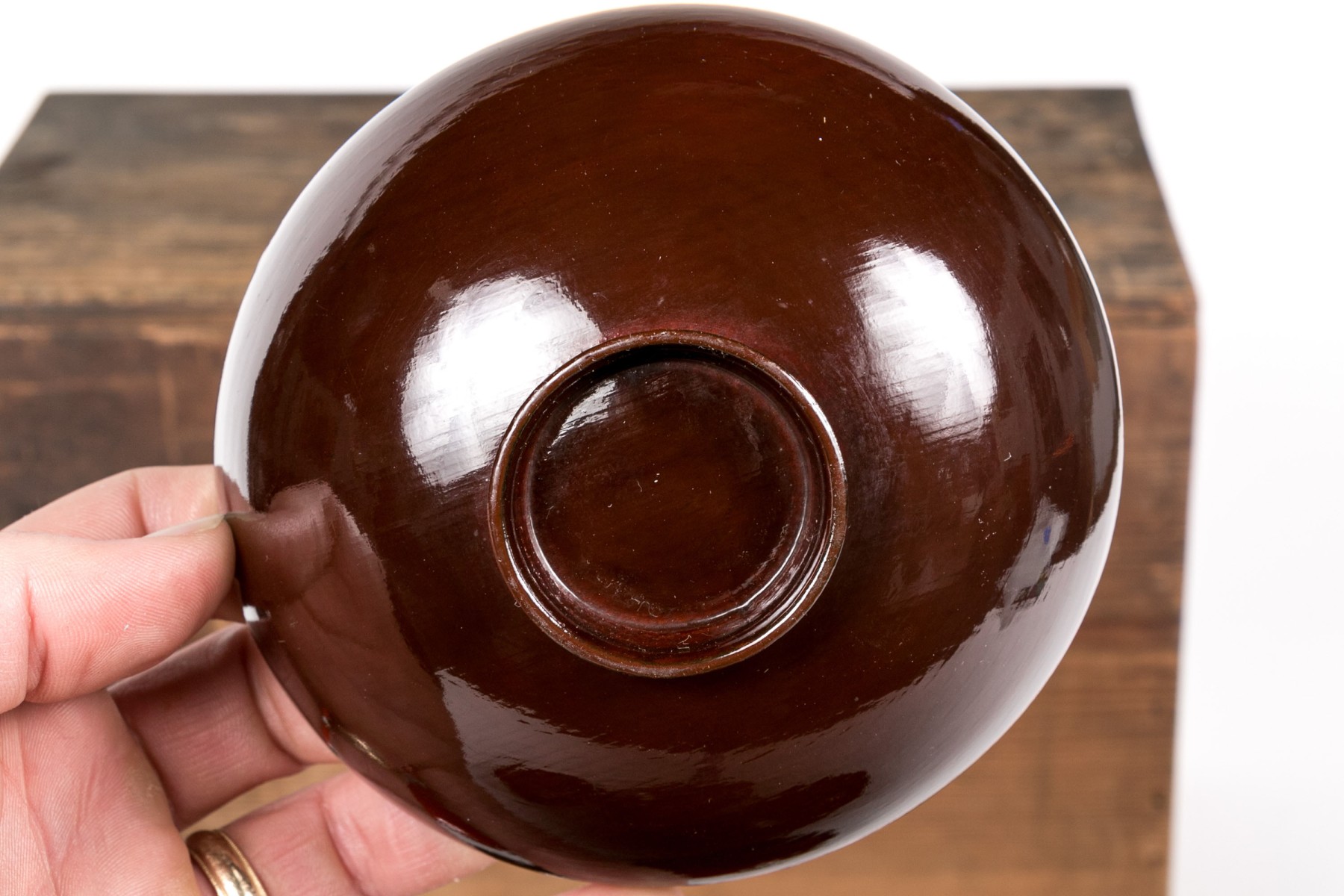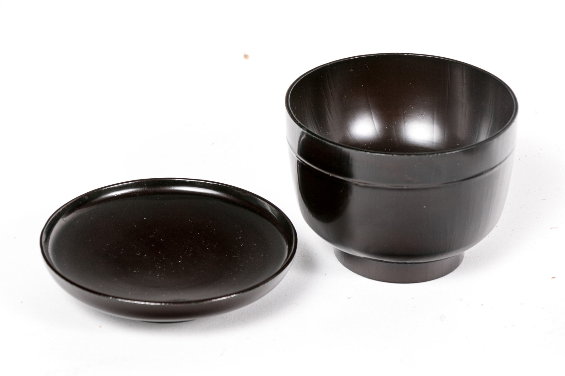 Along with a small black lidded cup and a brown lidded bowl (tiny chip to the rim).
