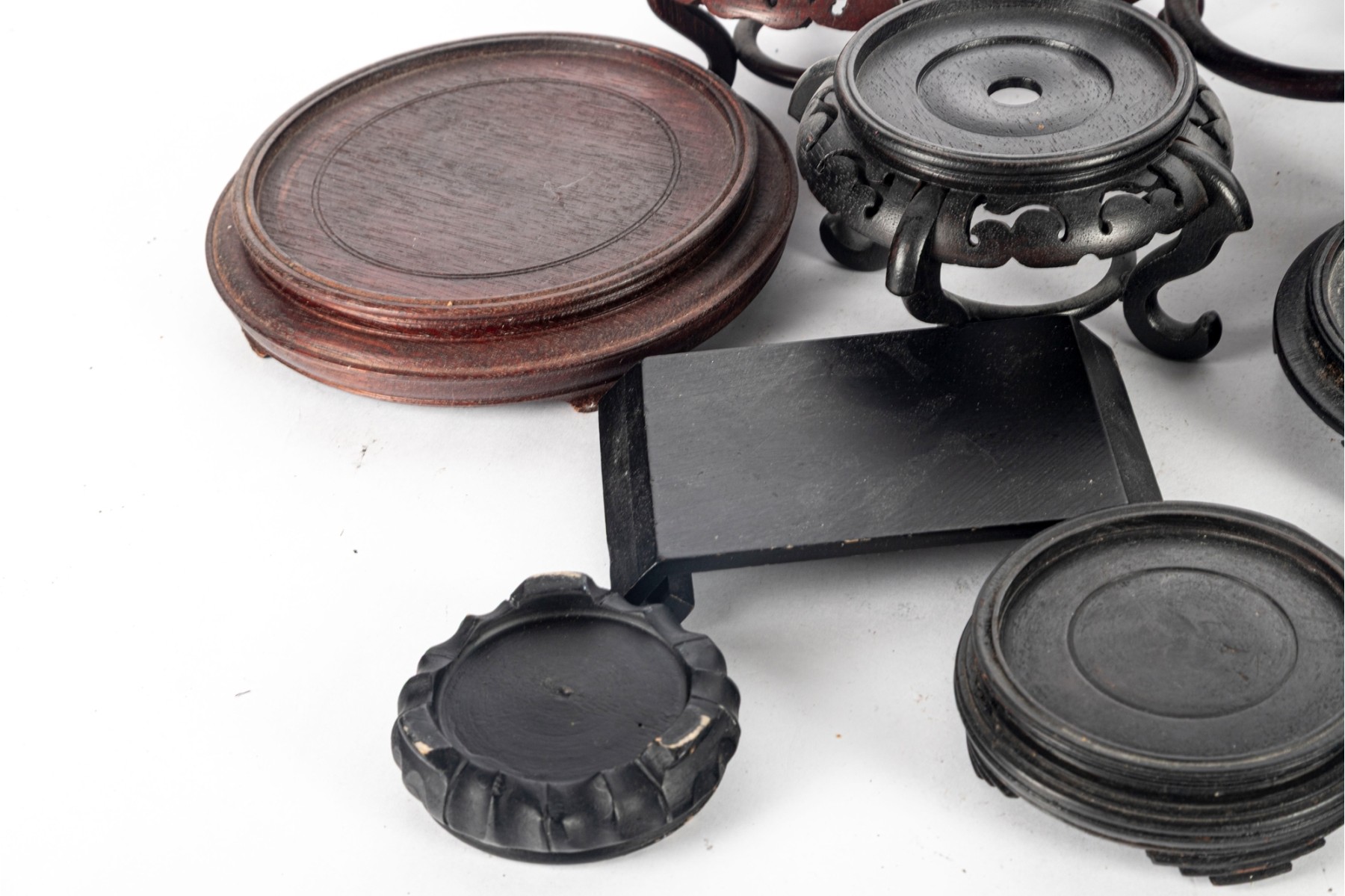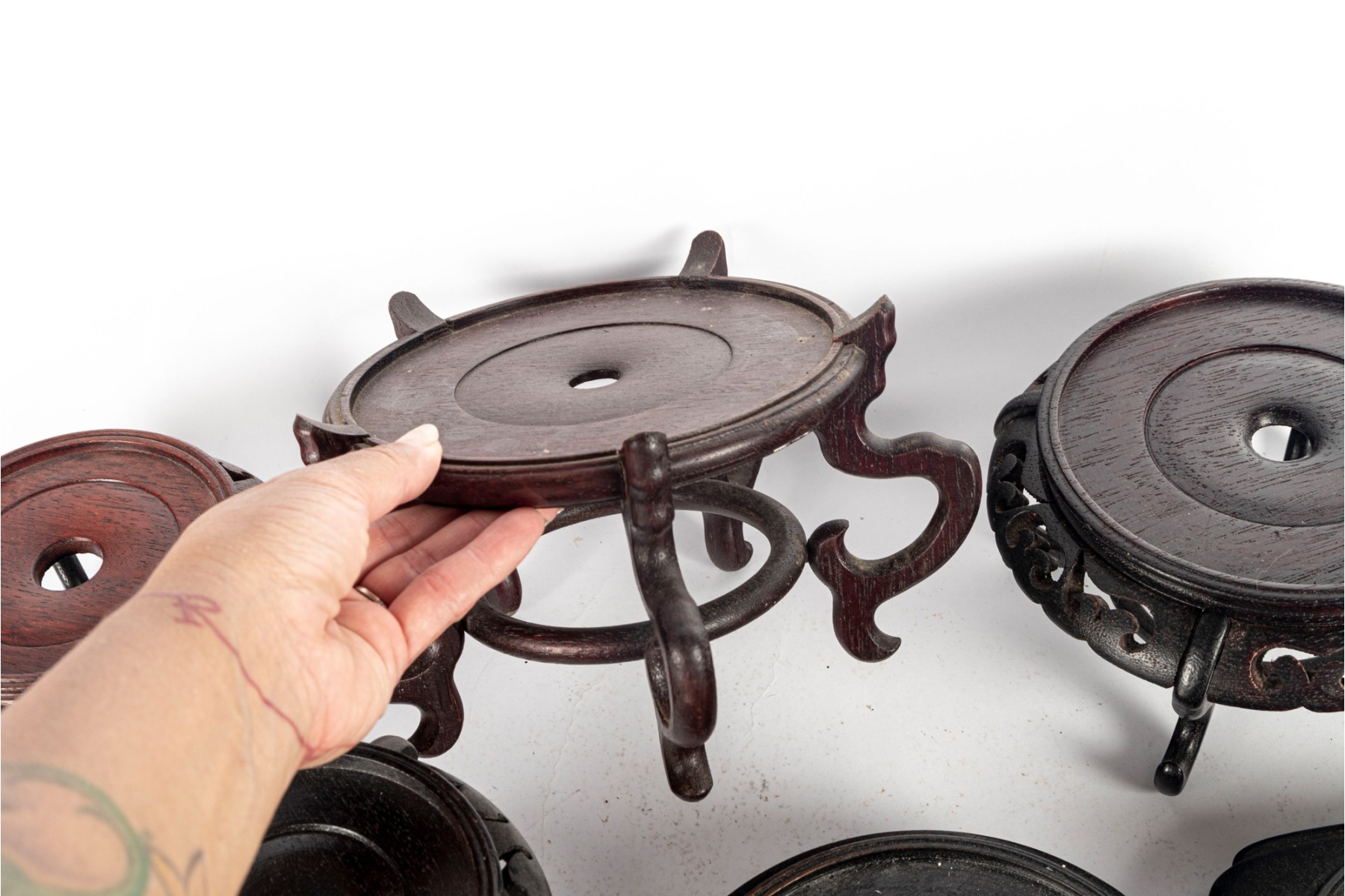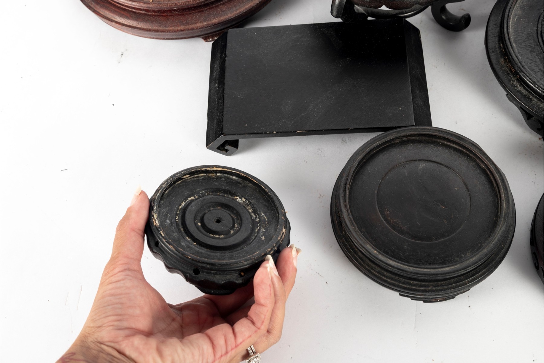 A small collection of 12 Asian Plant stands crafted/carved from wood. Varying sizes -- contents as shown and sold as is, see photos for details.