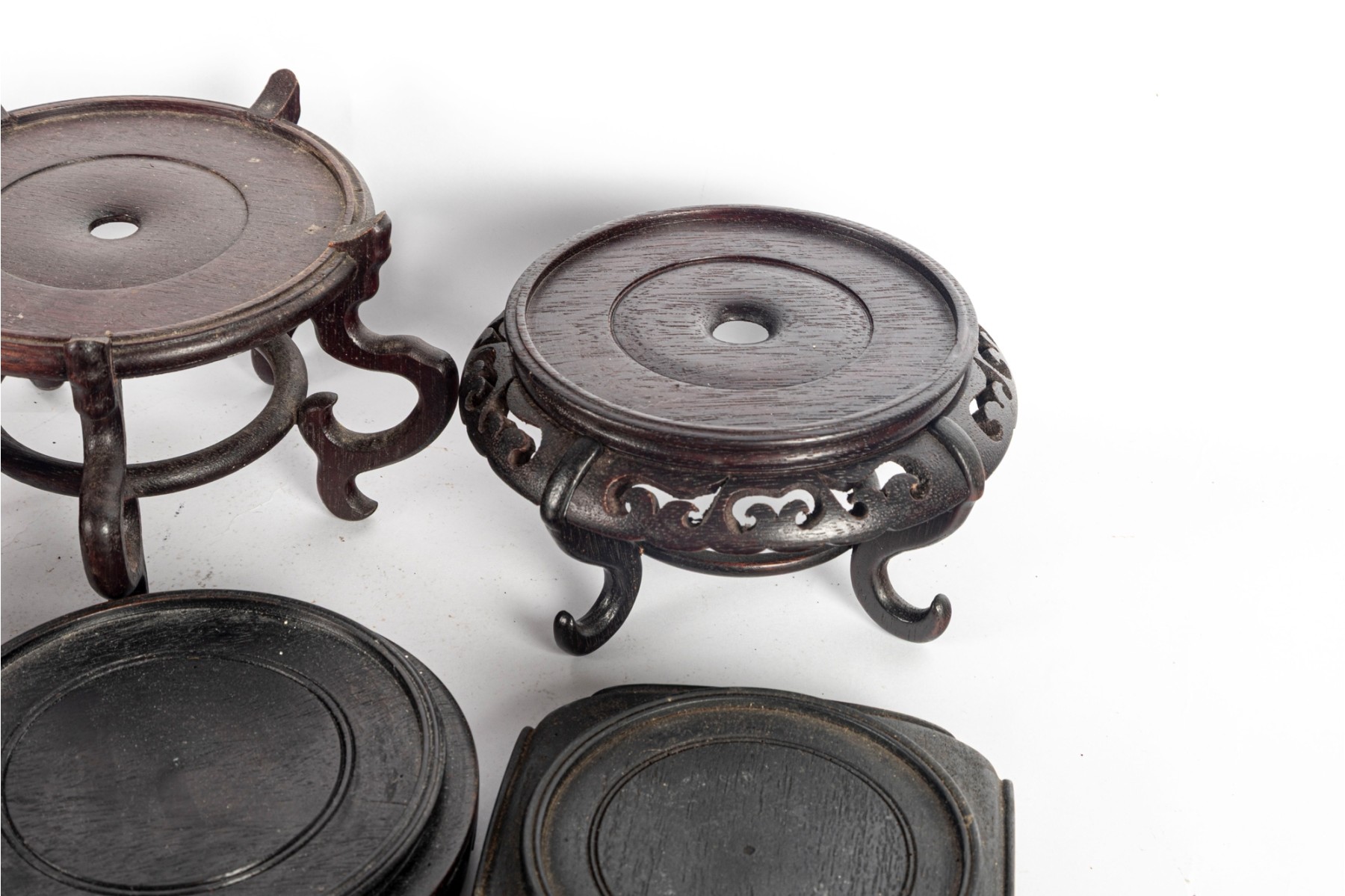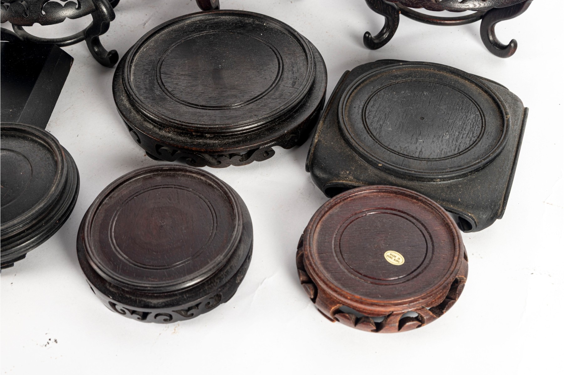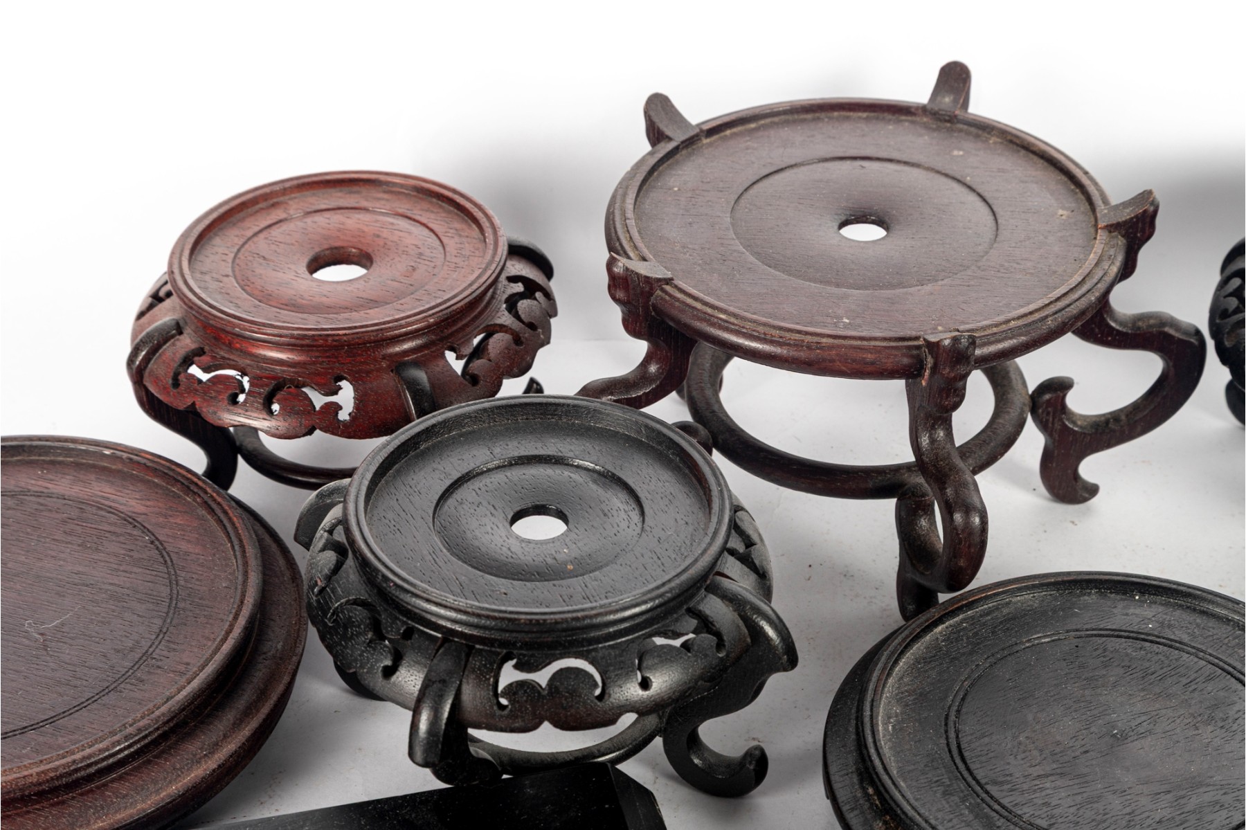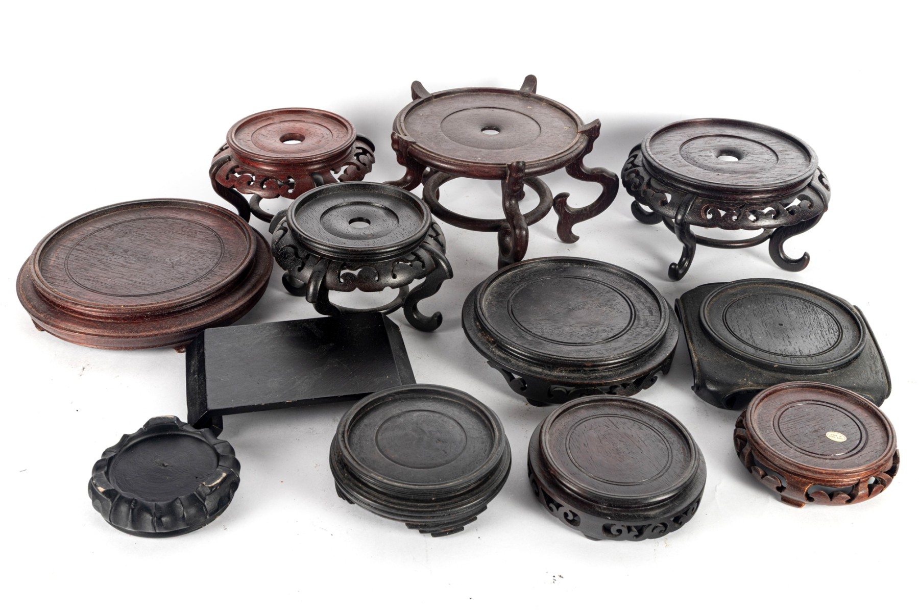 A small collection of 12 Asian Plant stands crafted/carved from wood. Varying sizes -- contents as shown and sold as is, see photos for details.