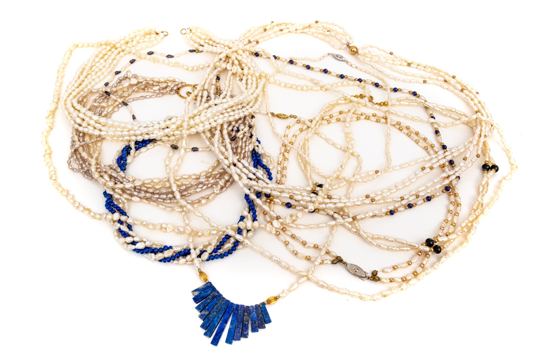 Collection of assorted beaded rice style cultured freshwater pearl necklaces, other assorted materials included