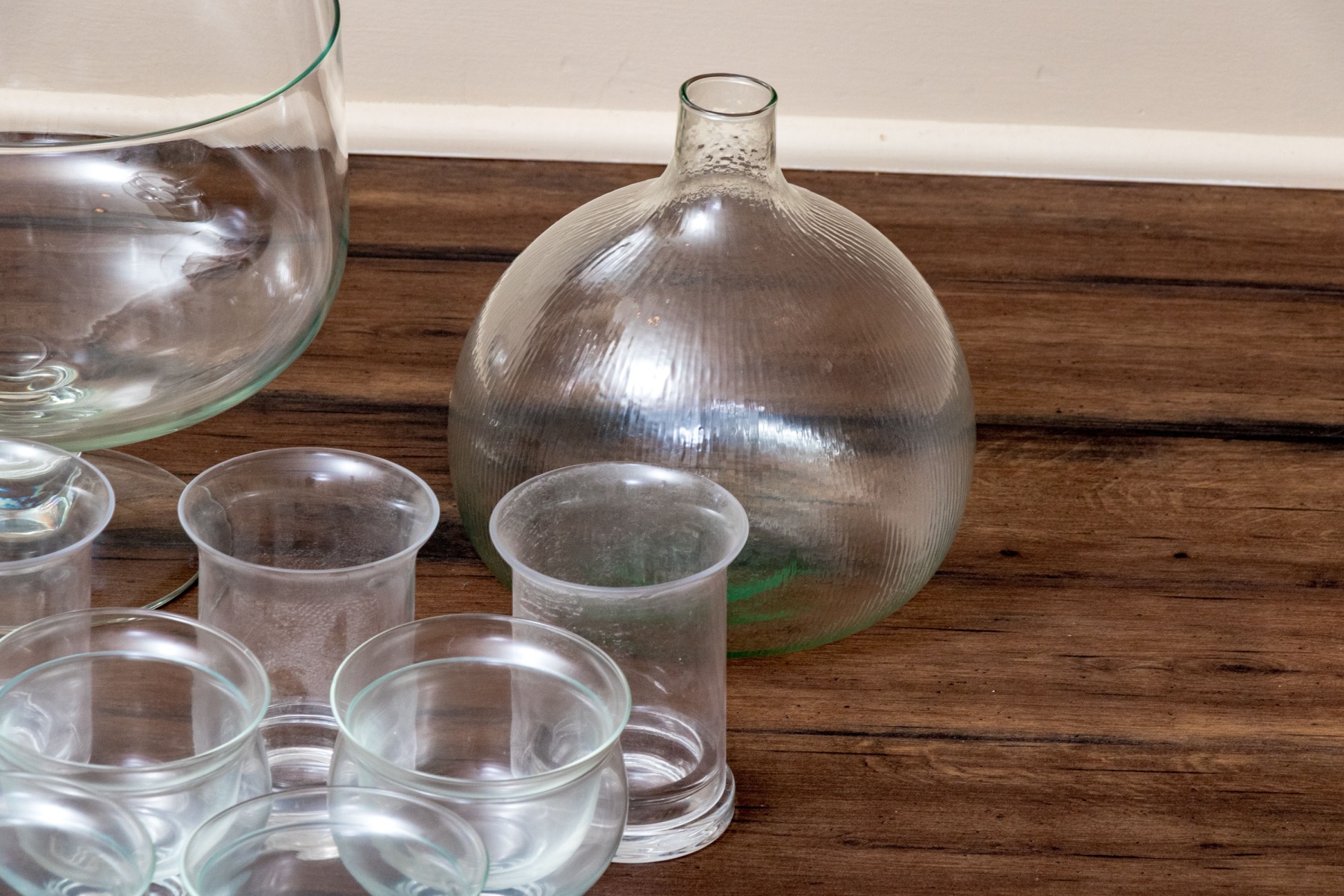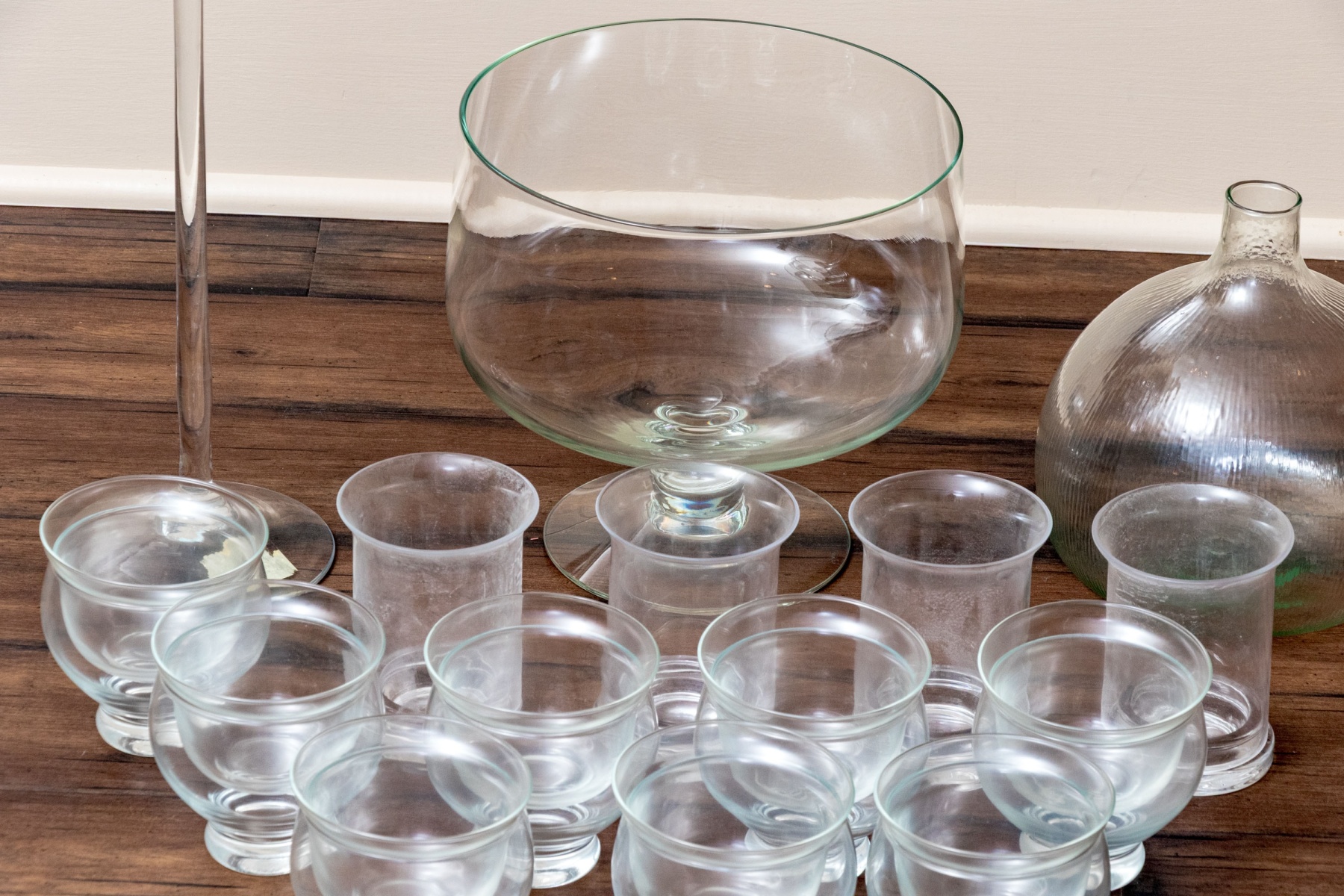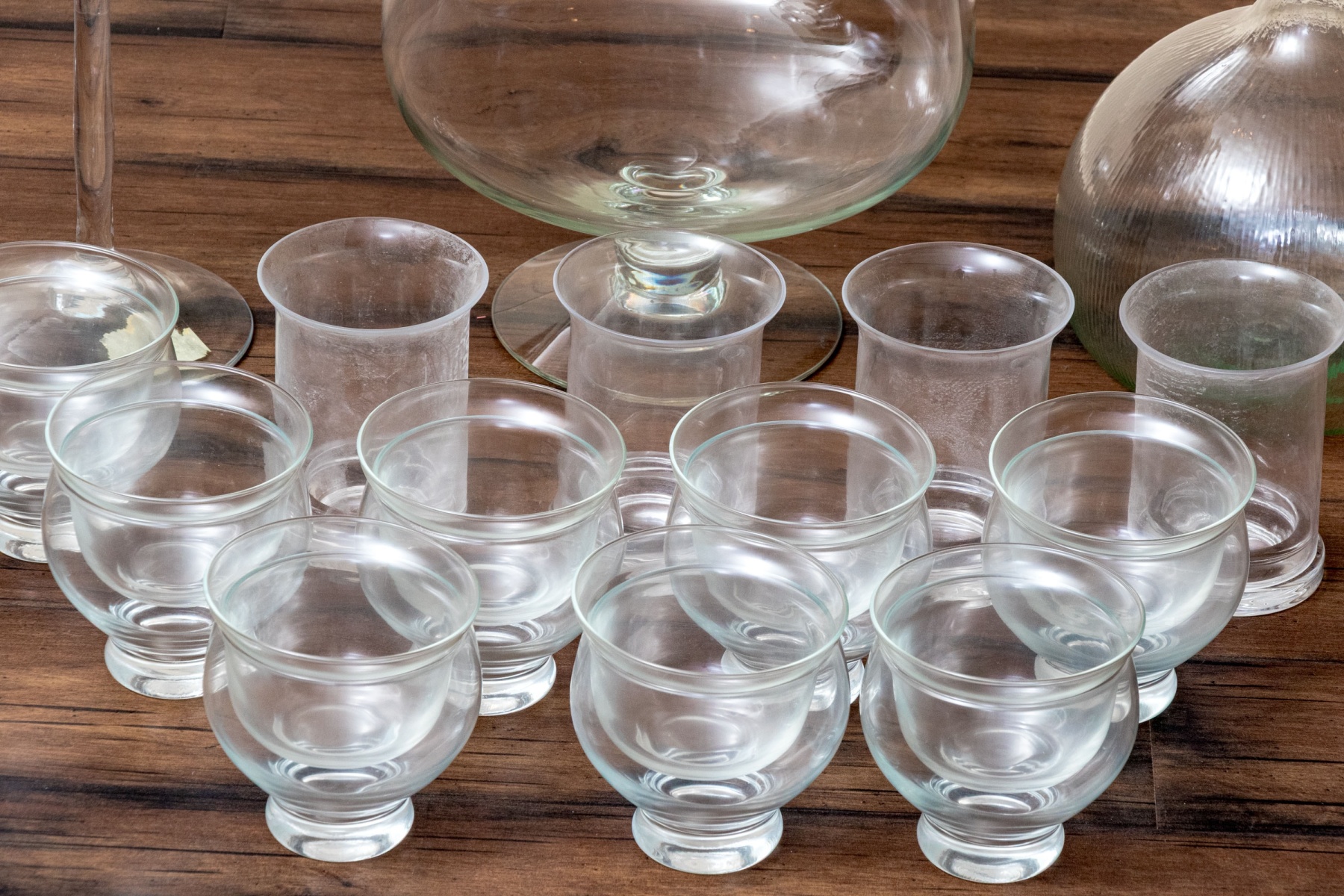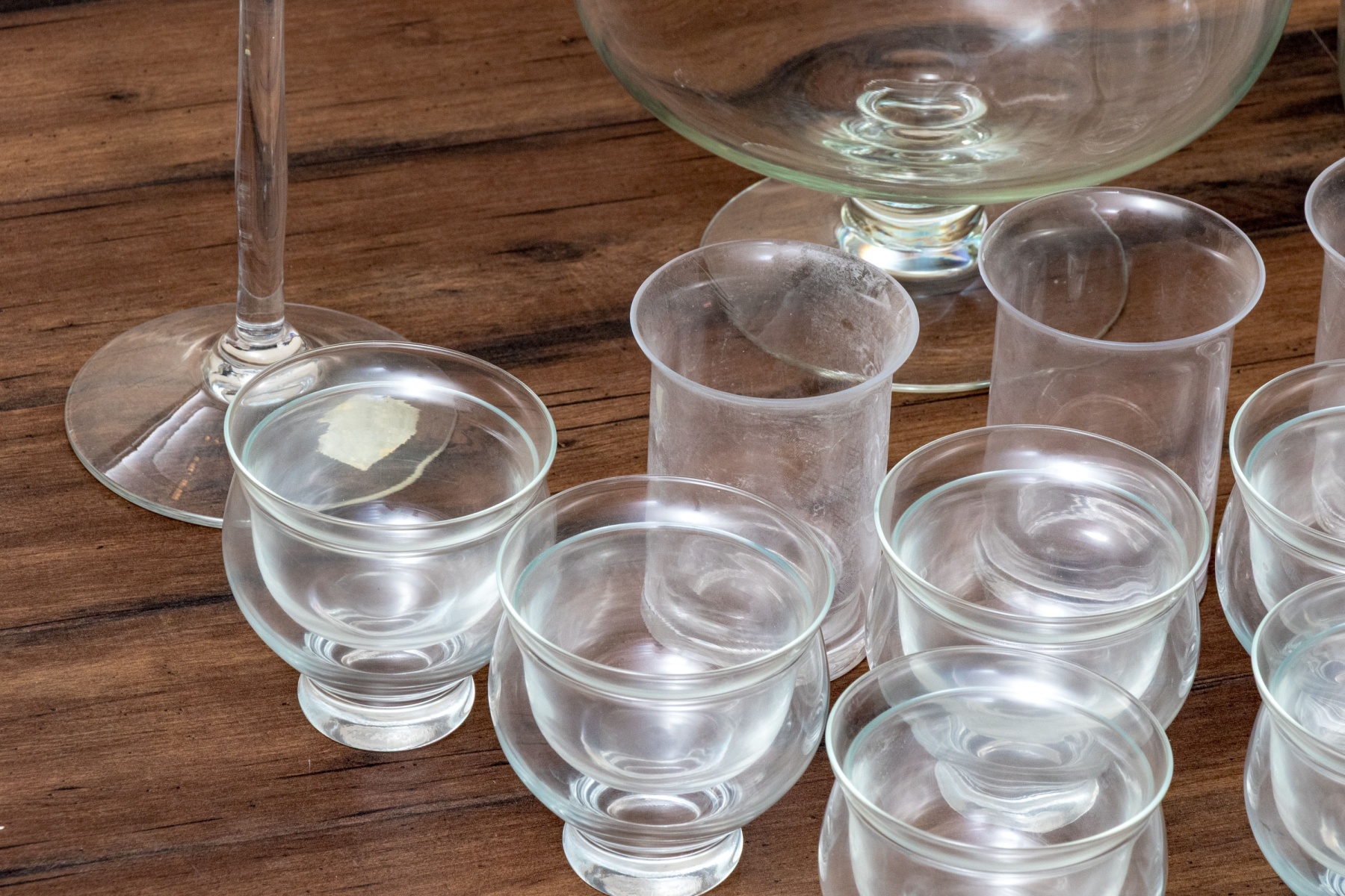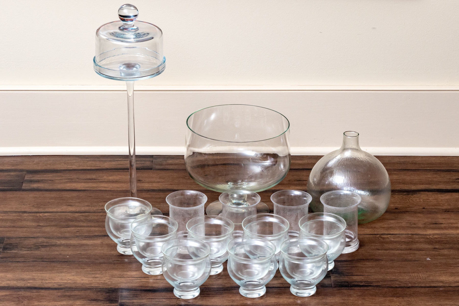 A wonderful collection of glasswares including shrimp cocktail bowls, a pedestal centerpiece bowl, a fly catcher, and a pedestal cake stand with a cloche raised on a tall stem.