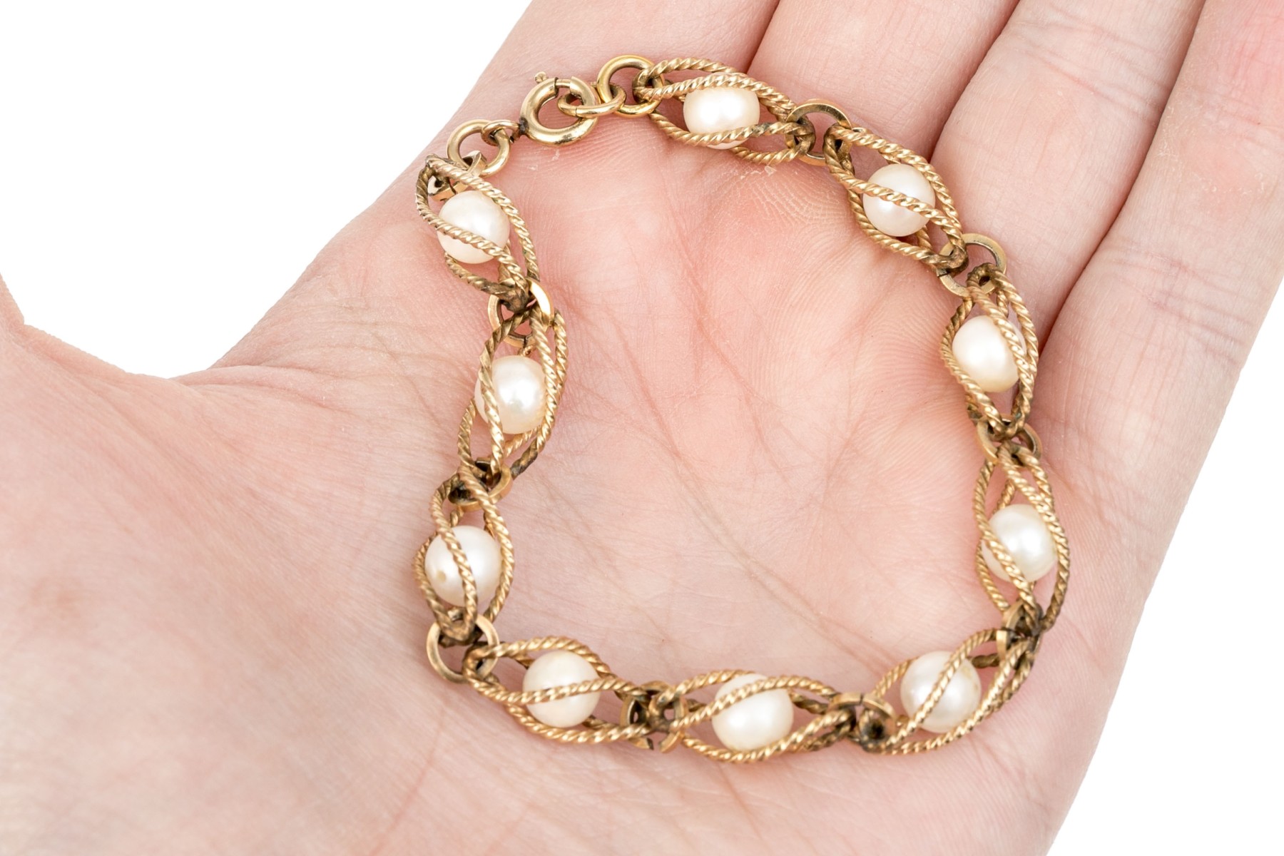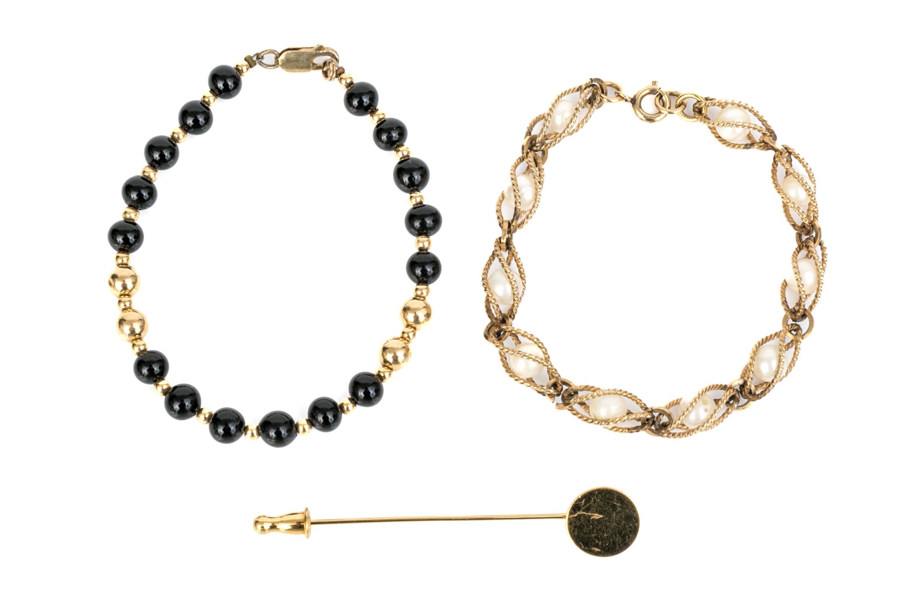 Collection of assorted Gold filled jewelry pieces, including bracelets and a stick pin