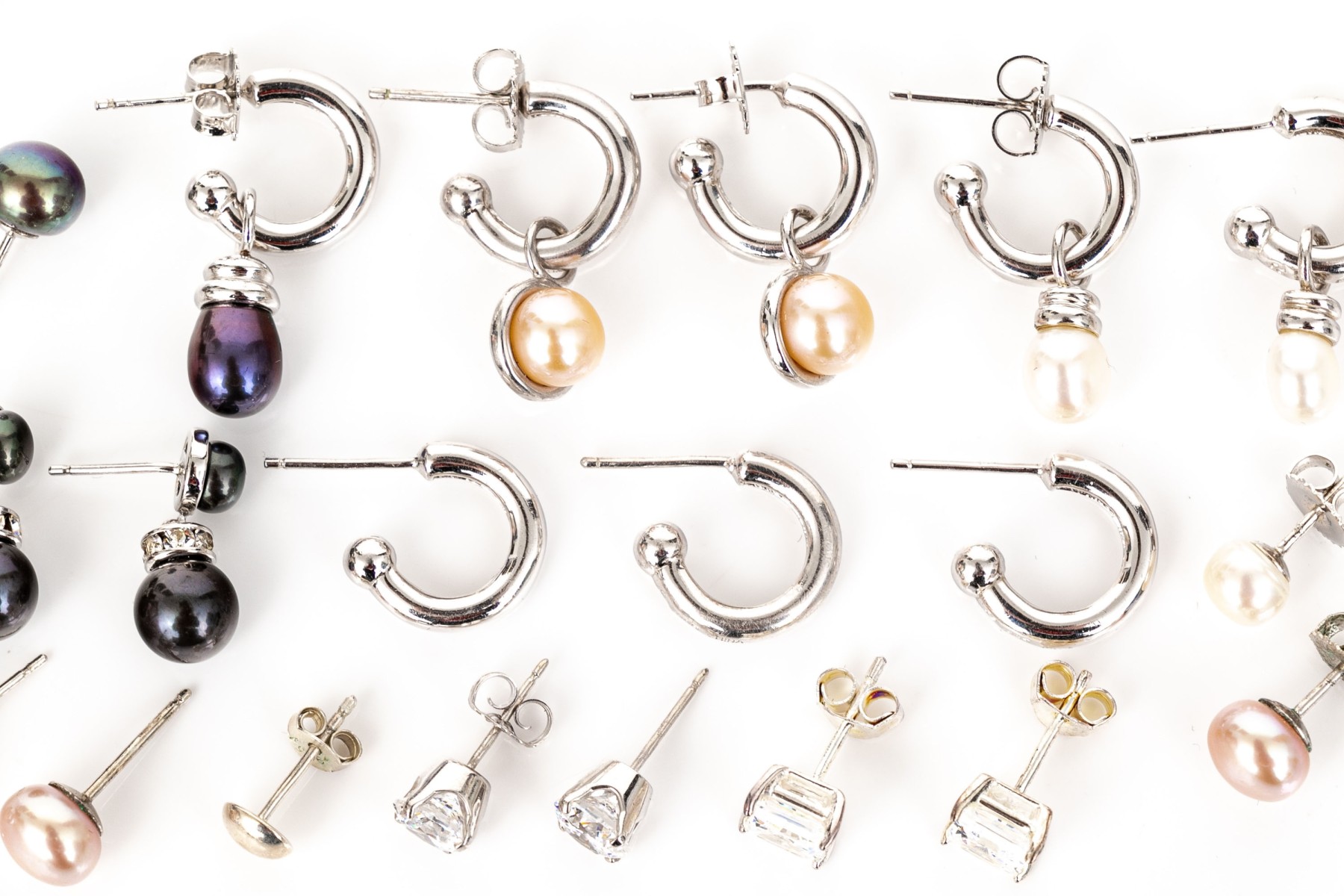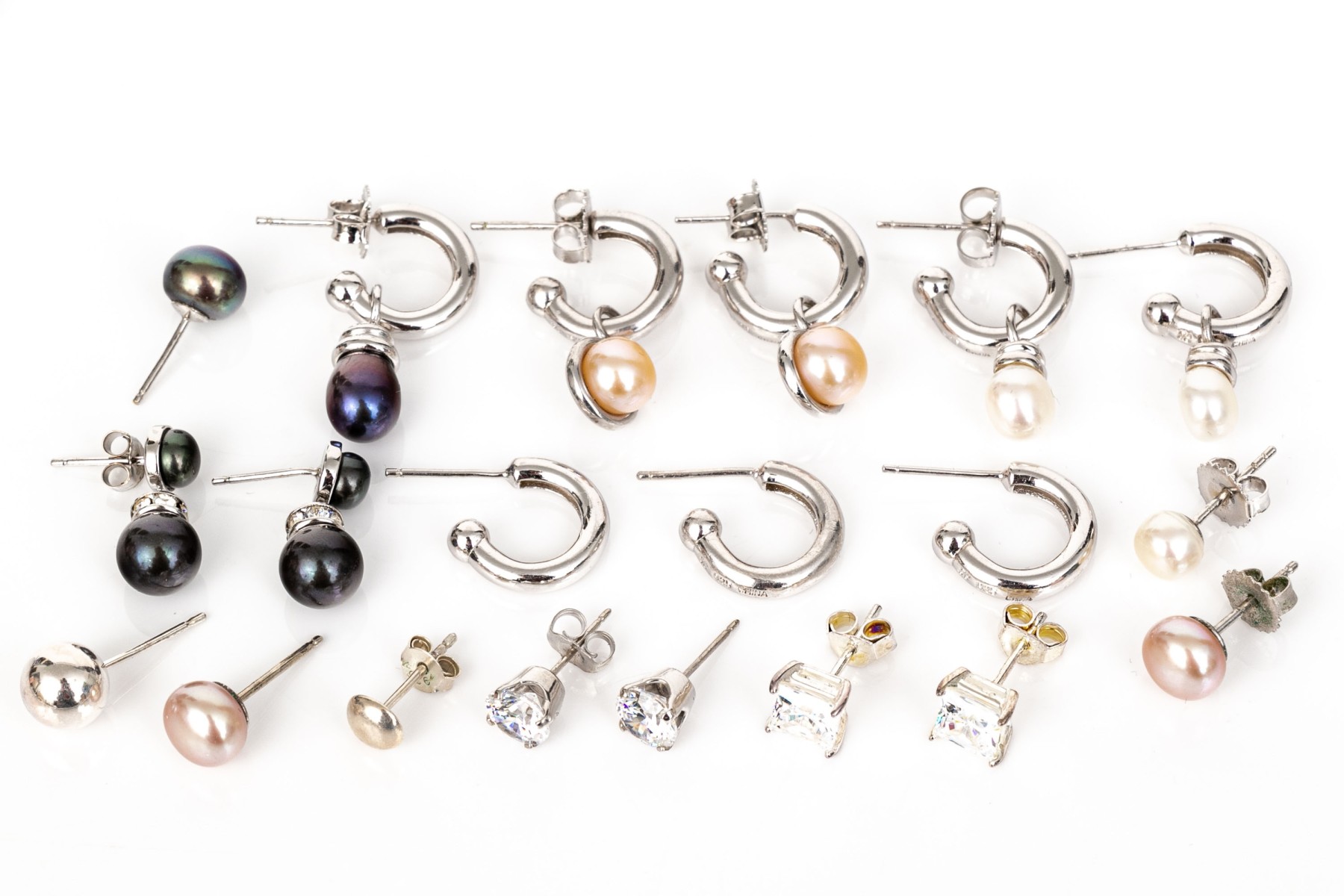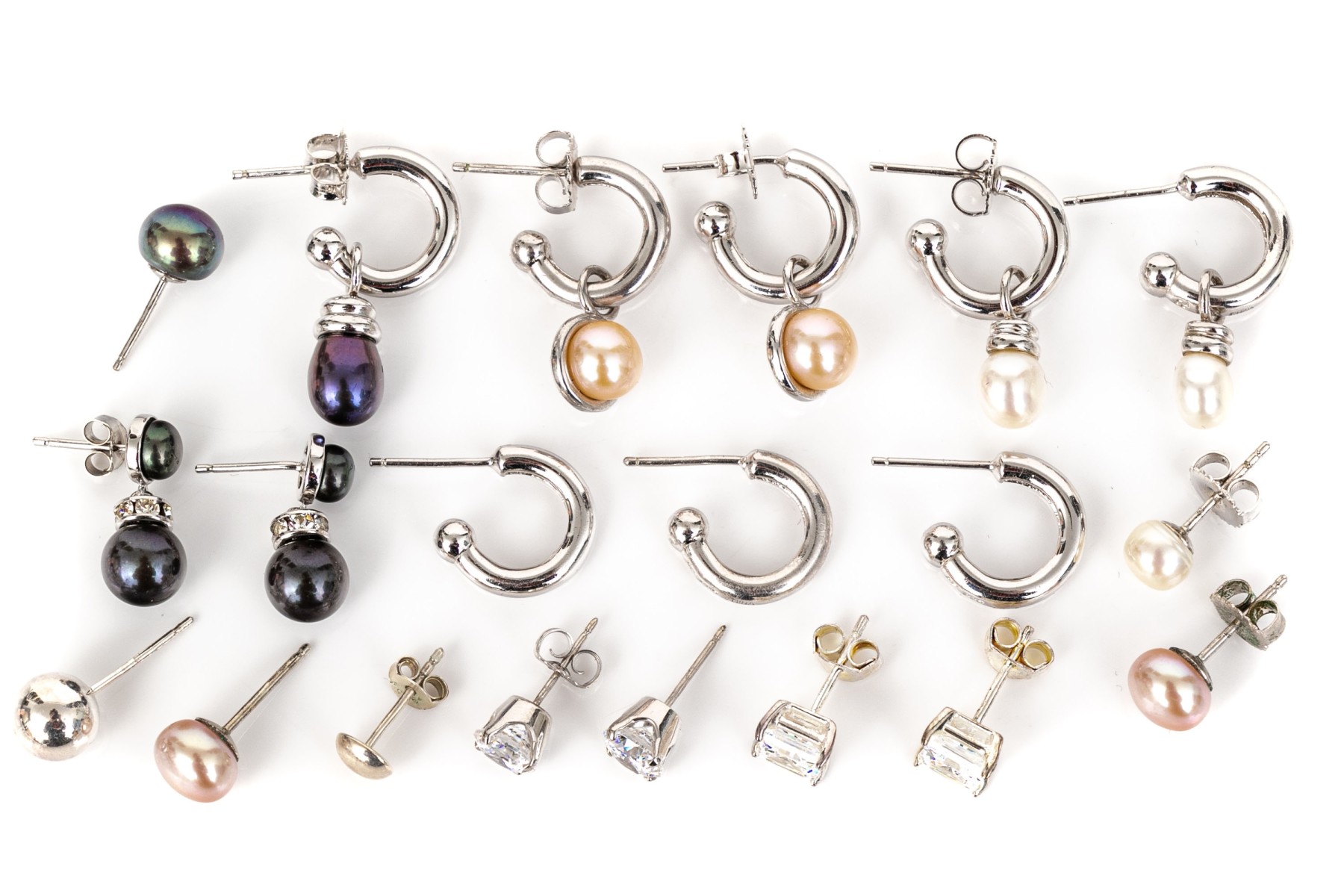 Collection of assorted sterling silver and cultured freshwater pearl, cz and ball style earrings, with half pairs