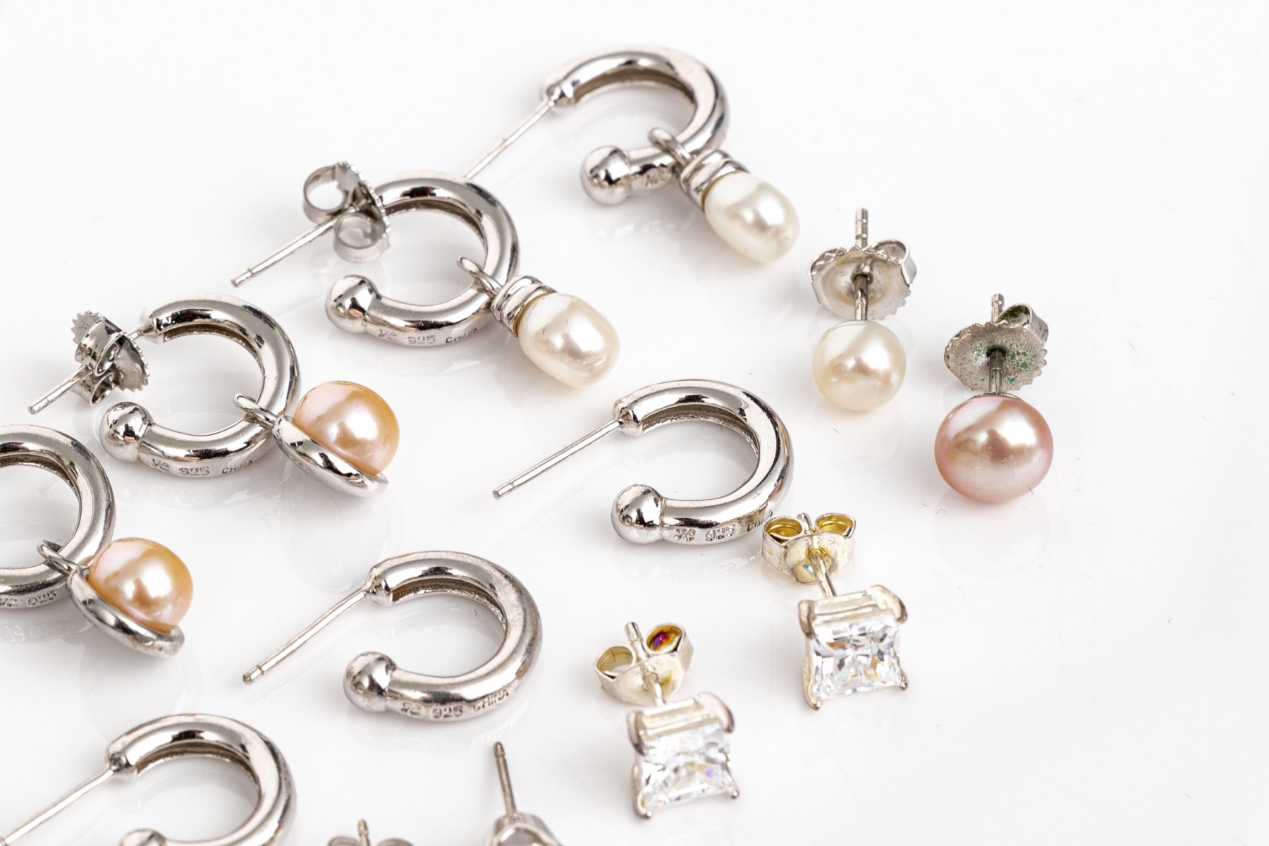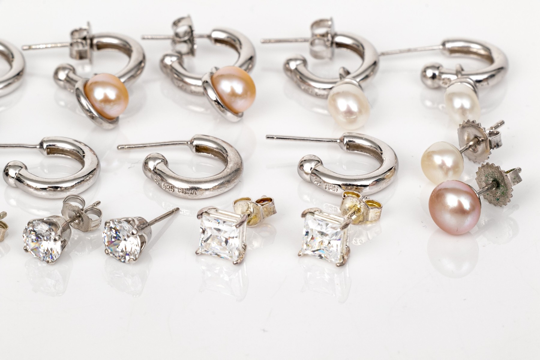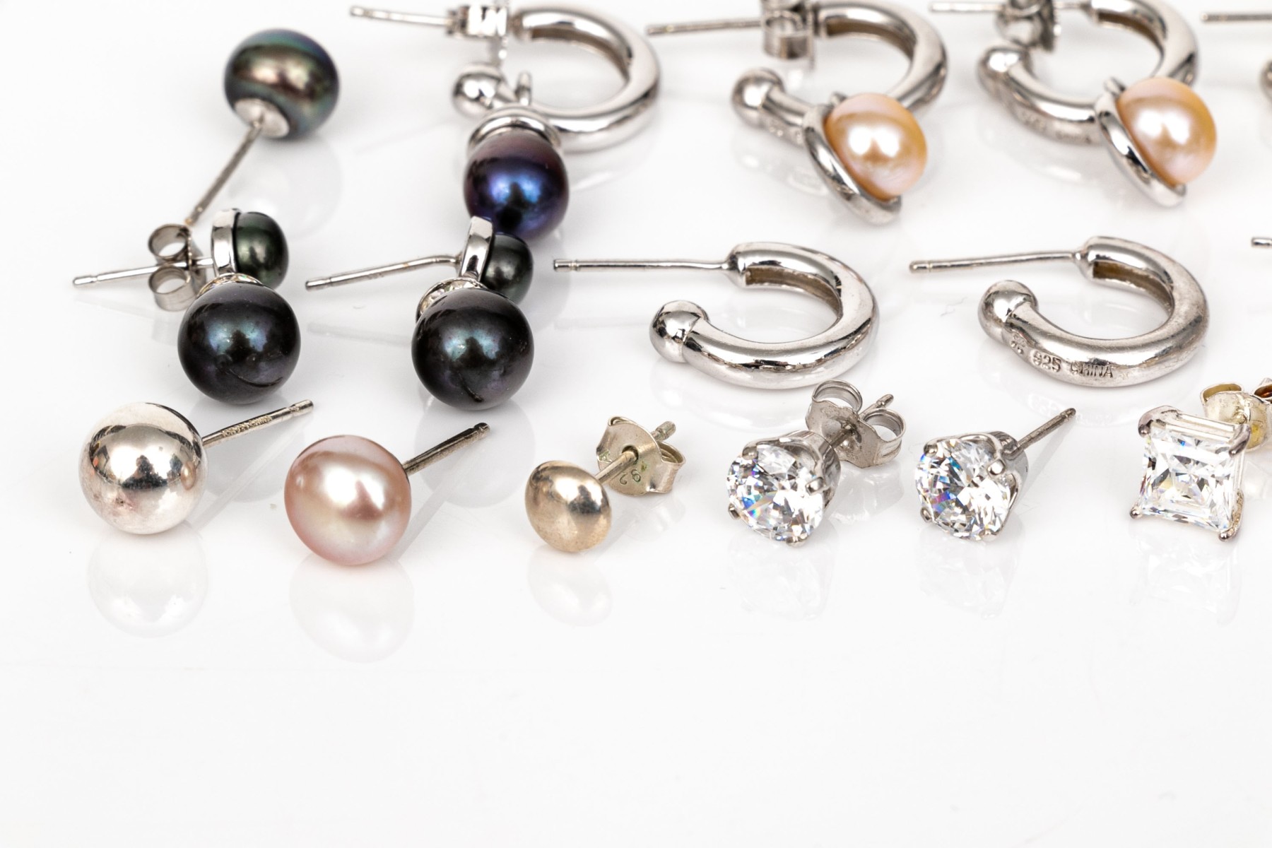 Collection of assorted sterling silver and cultured freshwater pearl, cz and ball style earrings, with half pairs