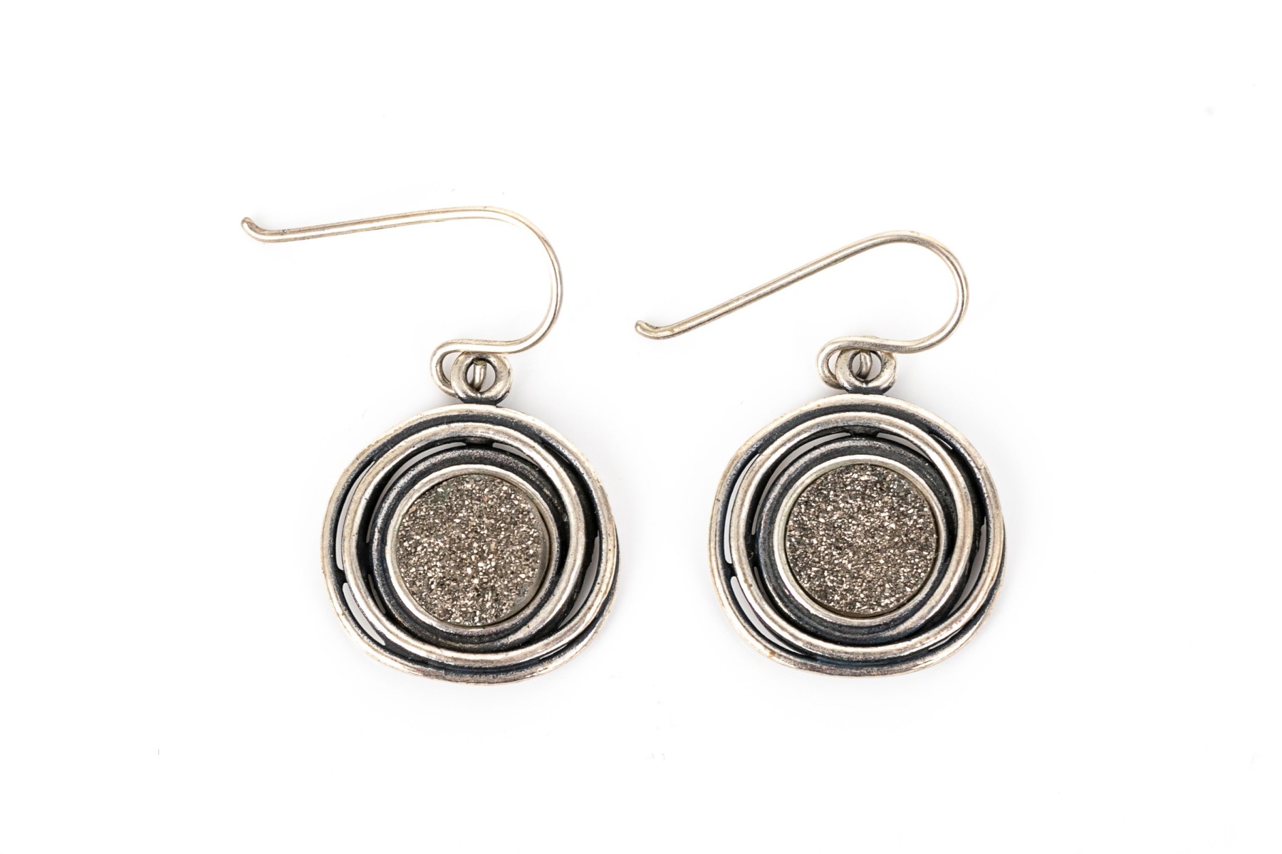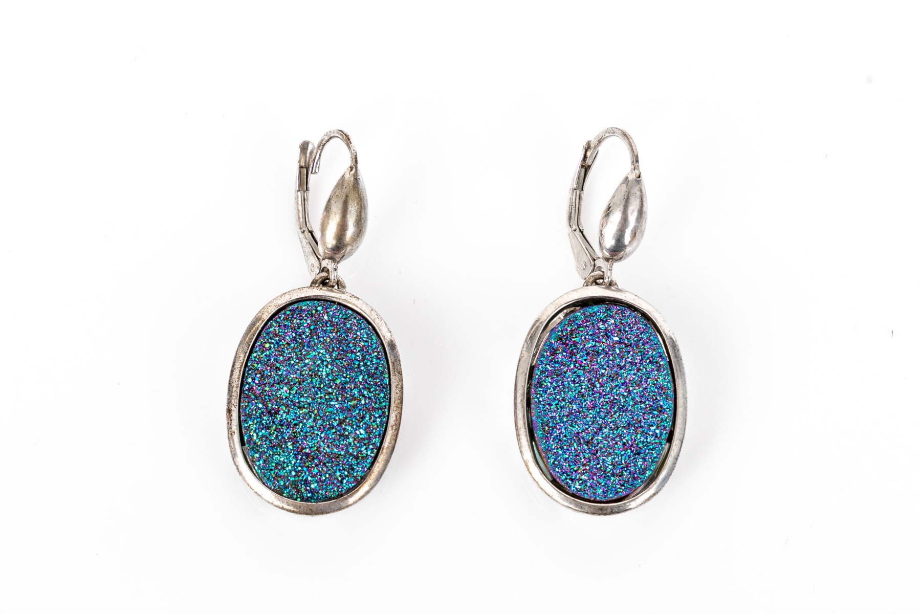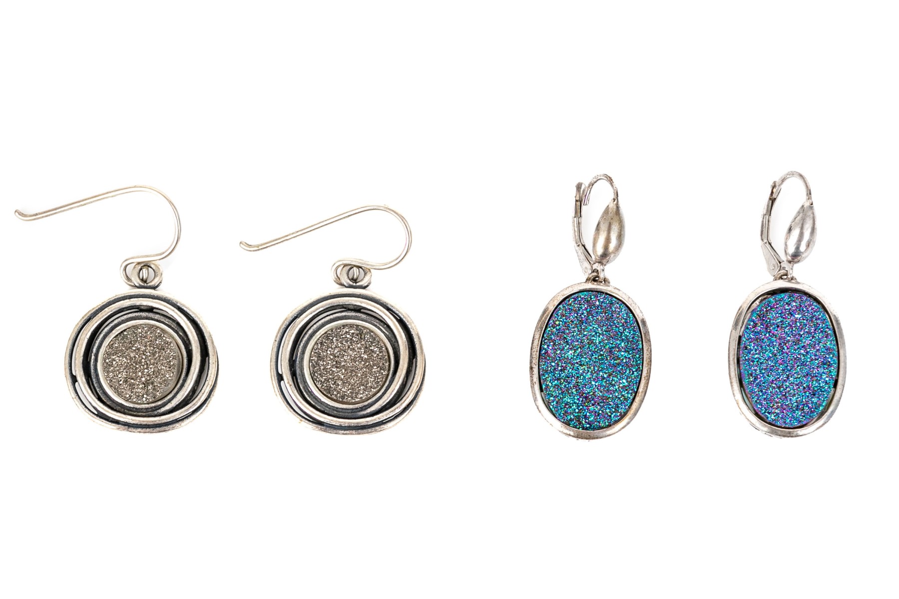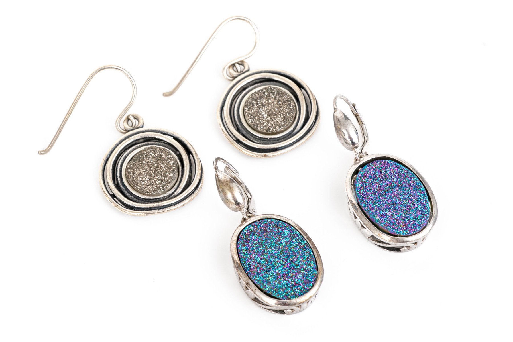 Collection of assorted sterling silver fun druzy drop pendant earrings, lever back and shepherd's hook styles