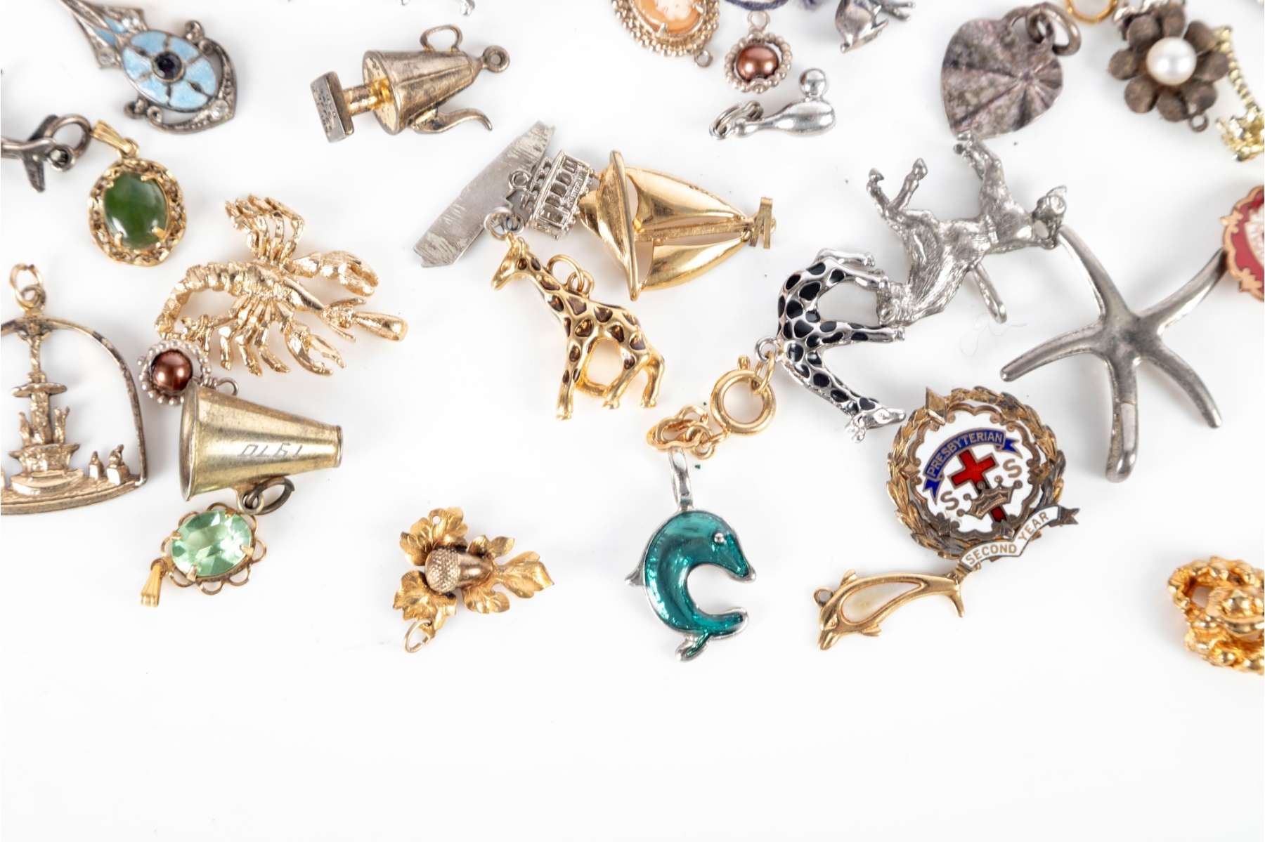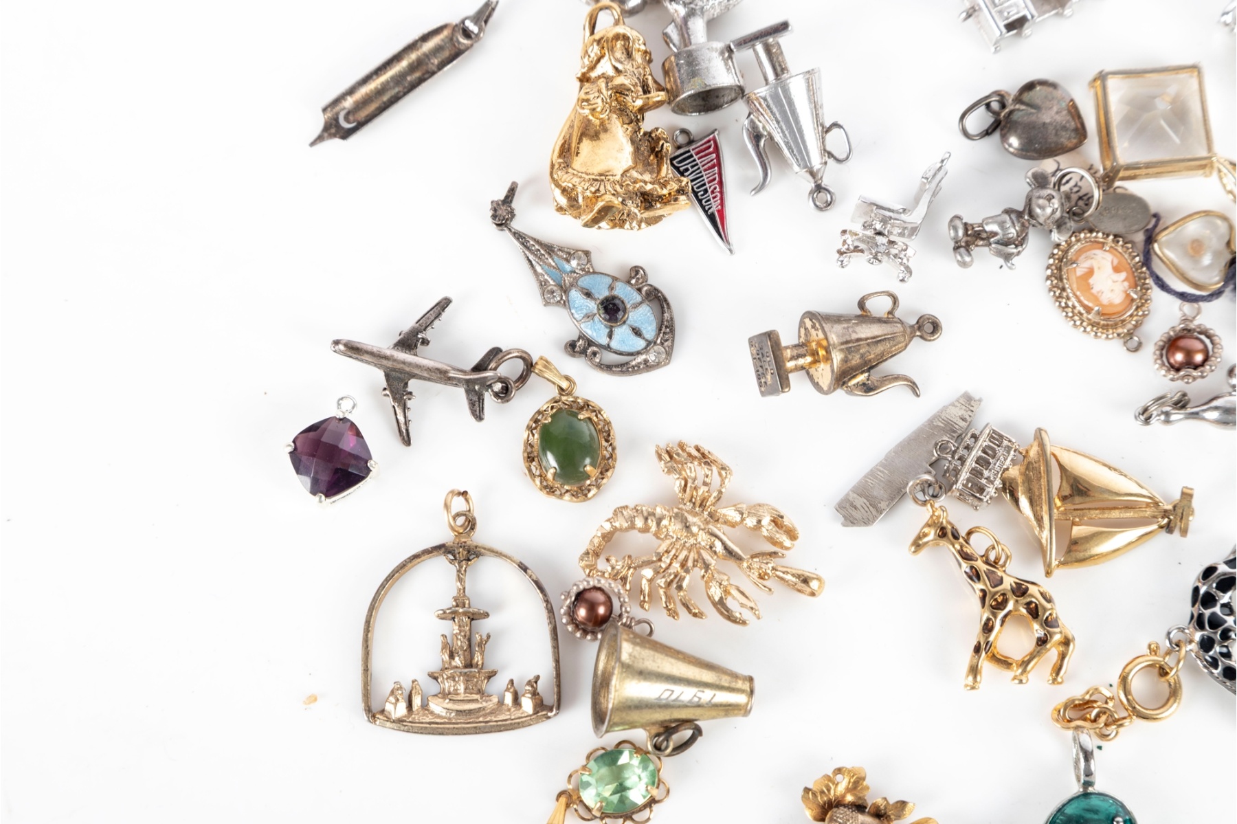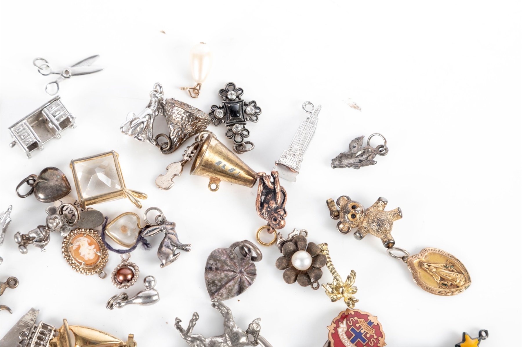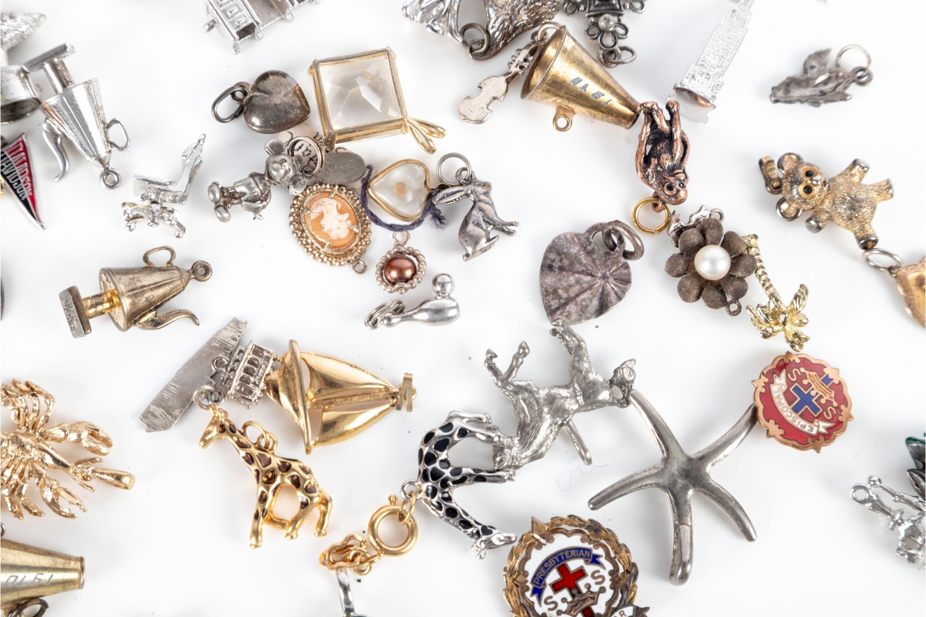 Extensive assortment of mixed-metal charms and pendants featuring a wide variety of themes, including animals, travel motifs, religious pieces, nautical forms, miniature objects, holiday themes, and gemstone/glass accents. Includes gold-tone, silver-tone, enamel, and cast metal examples, with both flat and three-dimensional forms. All examples are miniature — less than an inch in width/height.