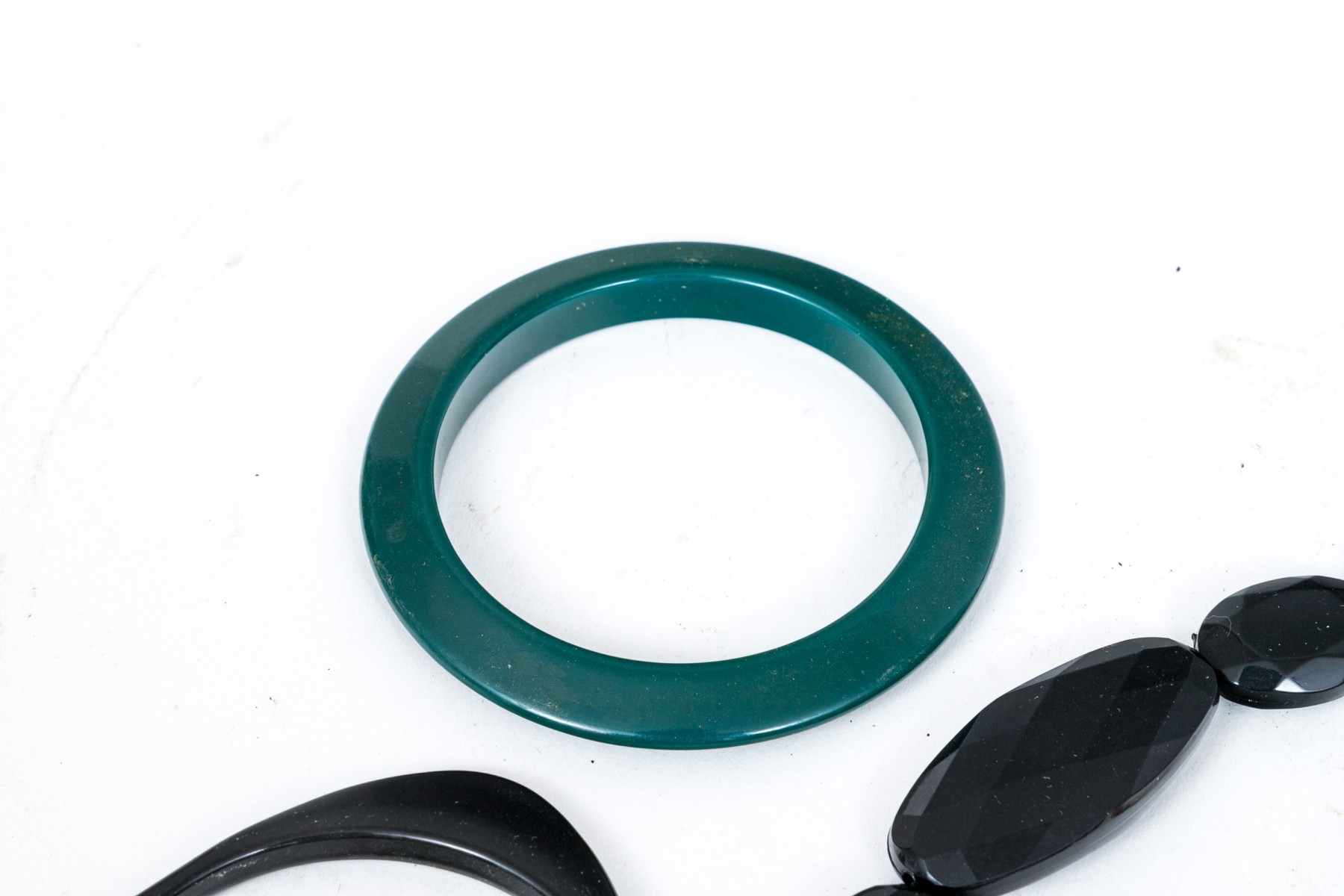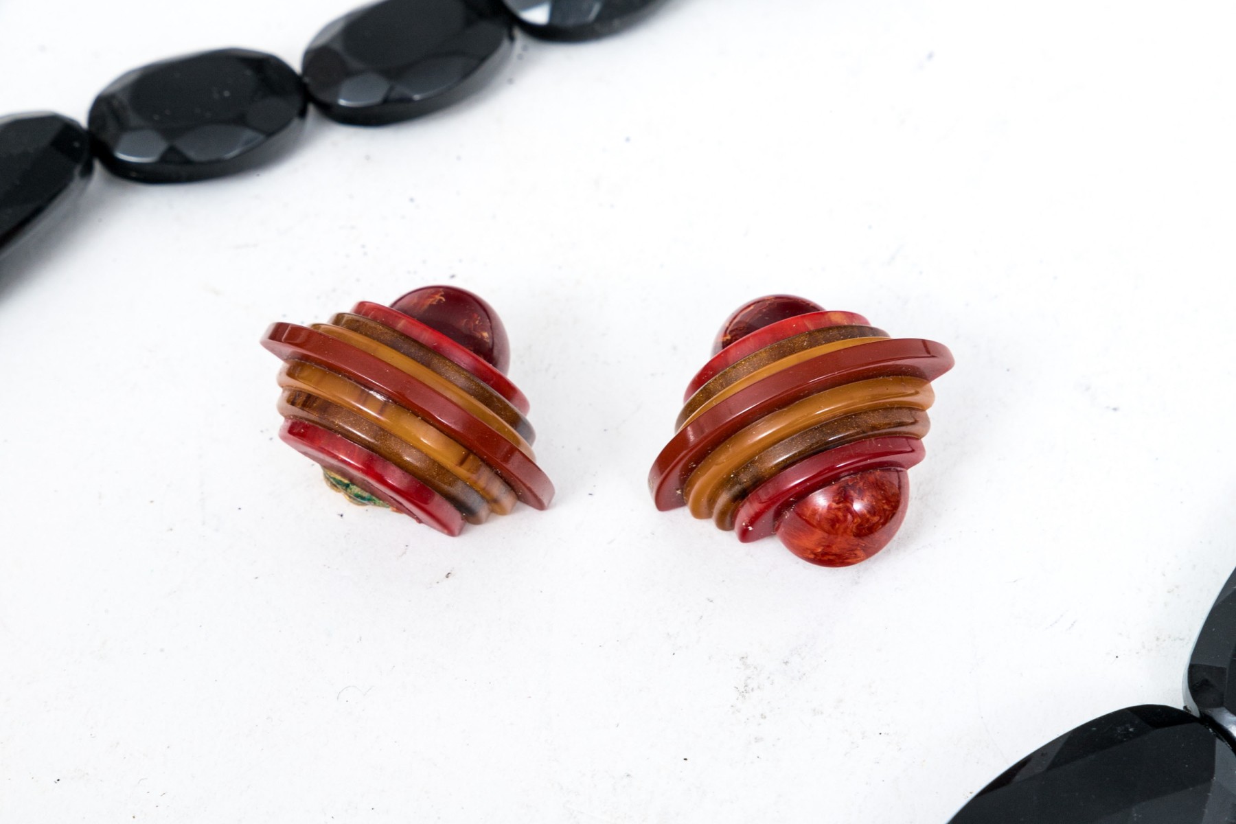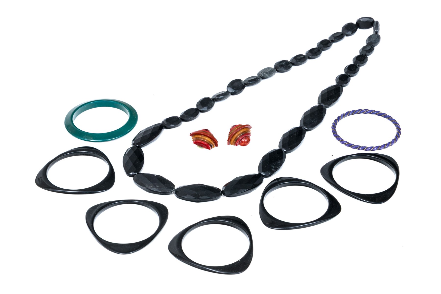 Collection Bakelite jewelry containing seven bangle bracelets, a necklace and a pair of clip back earrings.