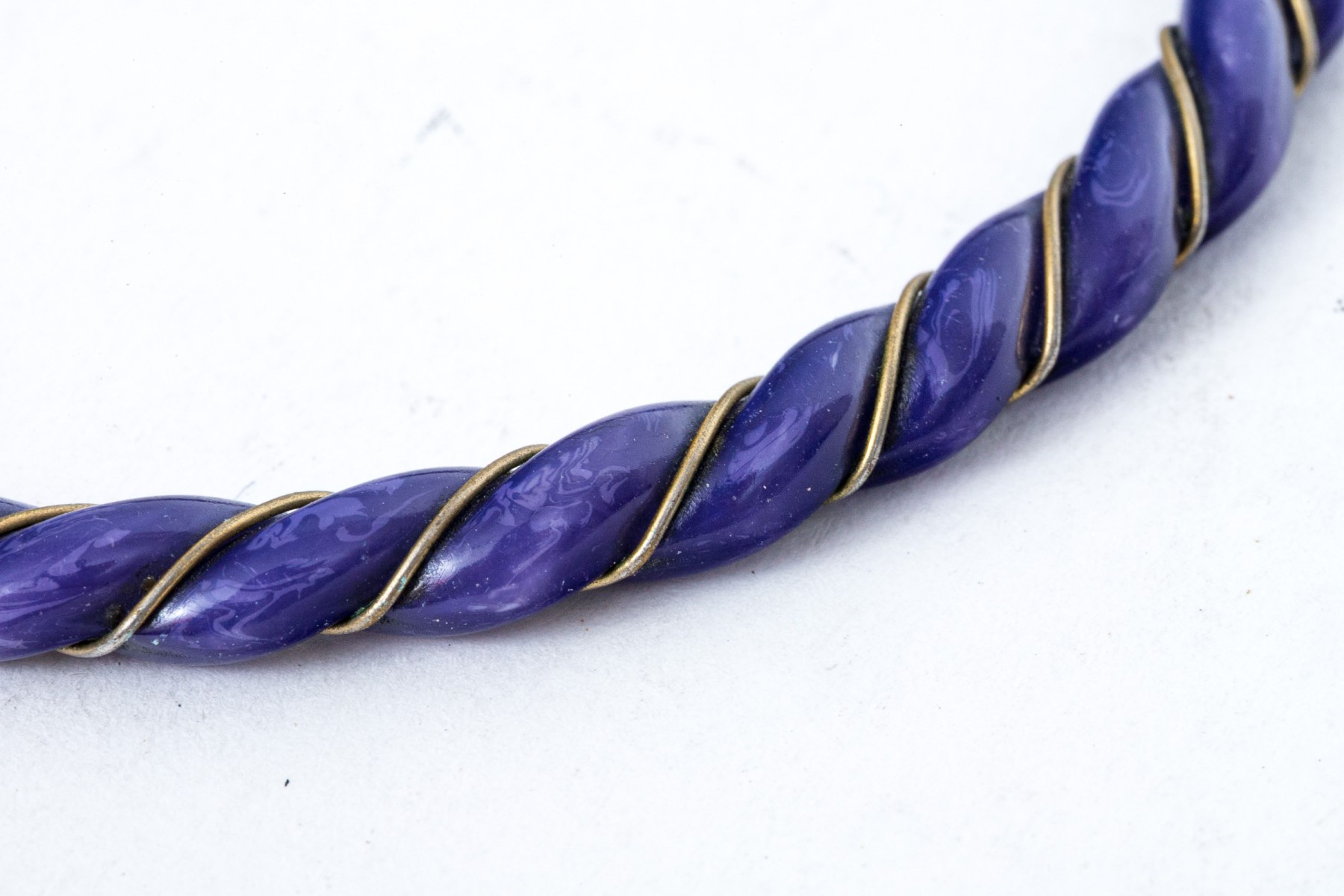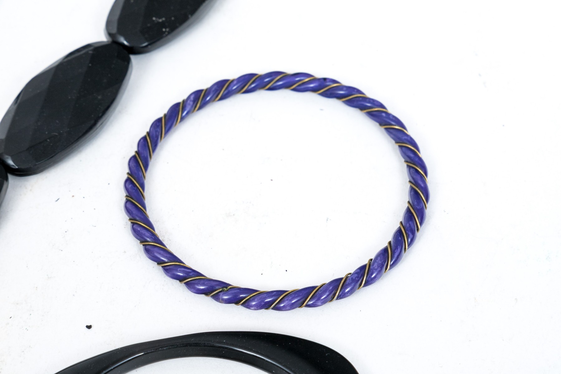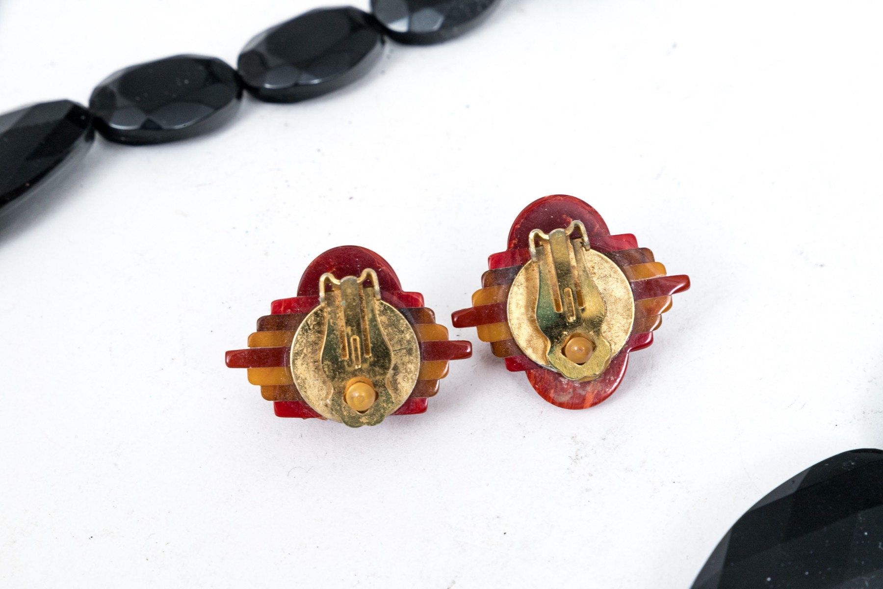 Collection Bakelite jewelry containing seven bangle bracelets, a necklace and a pair of clip back earrings.