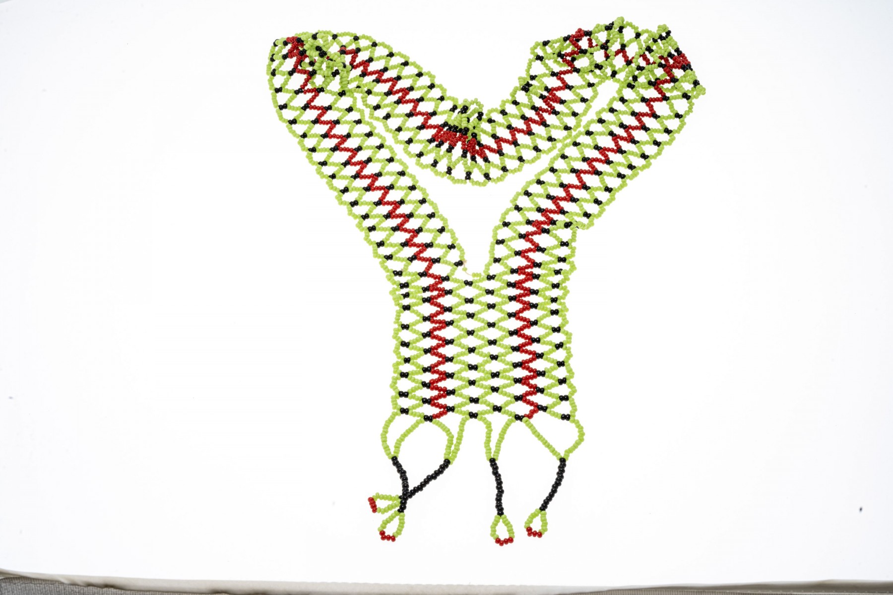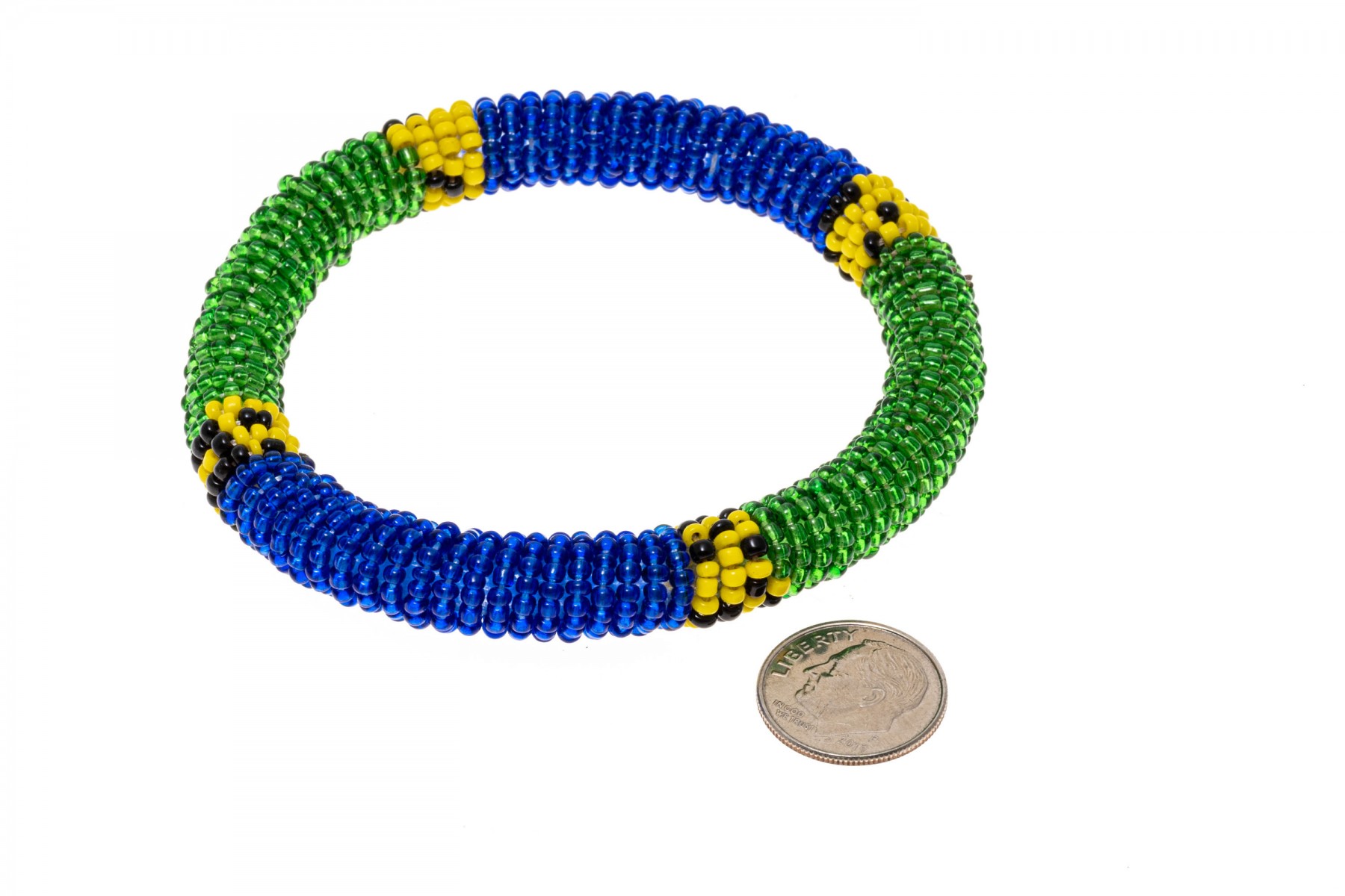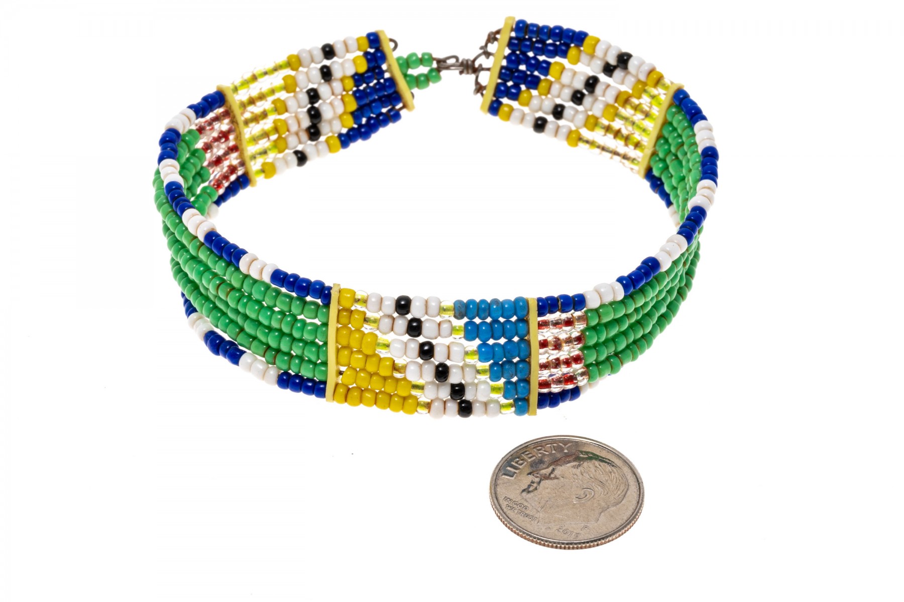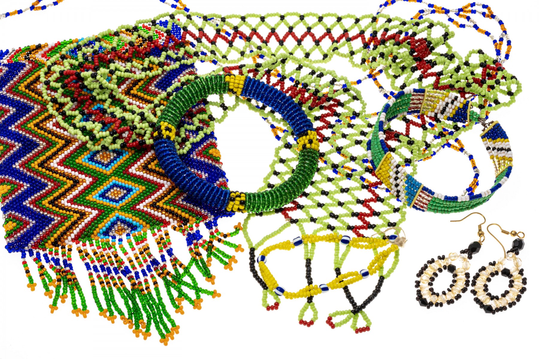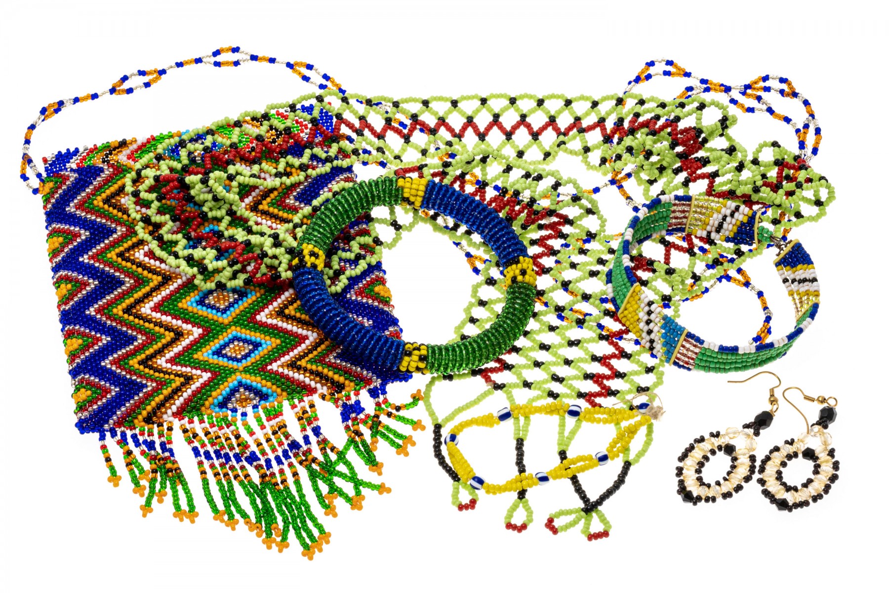 A collection of beaded jewelry, including bangle bracelets, necklace and purse.
