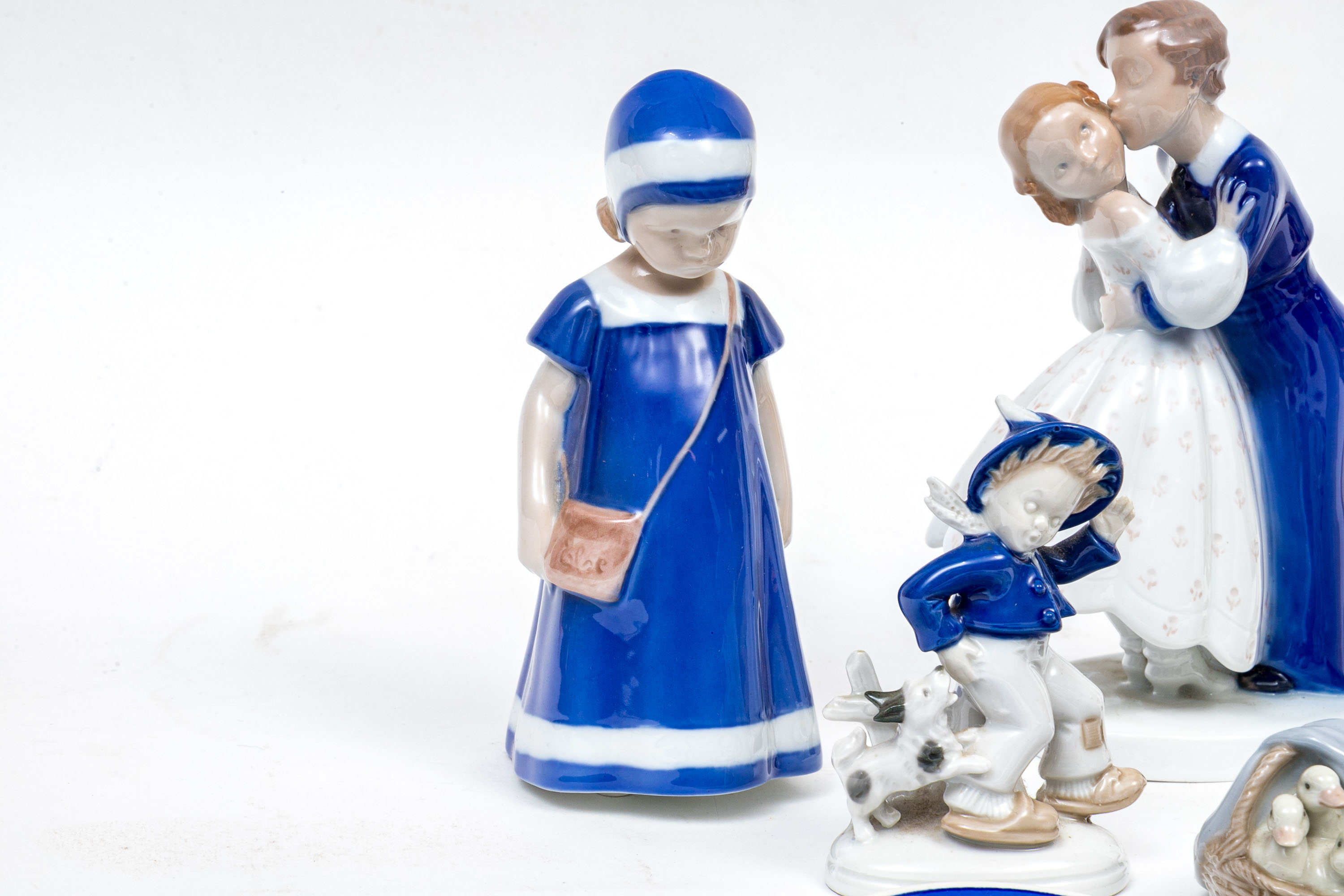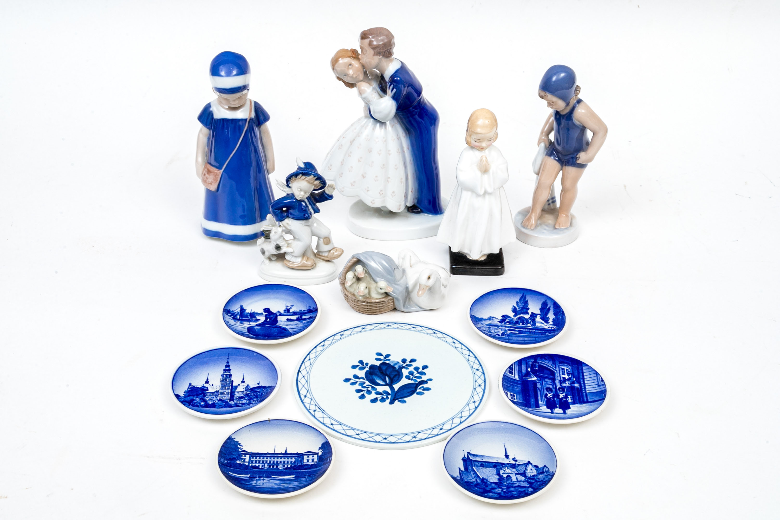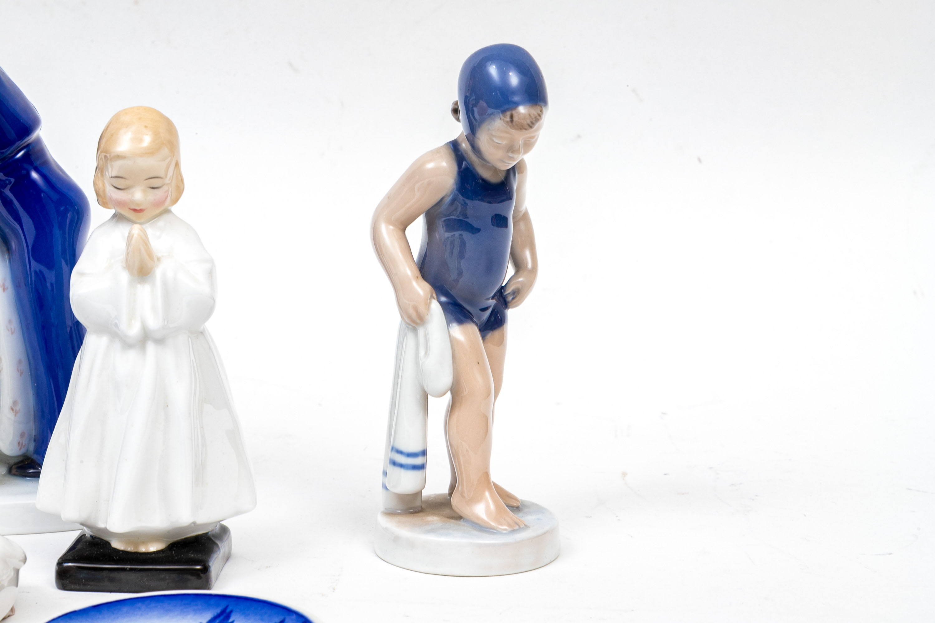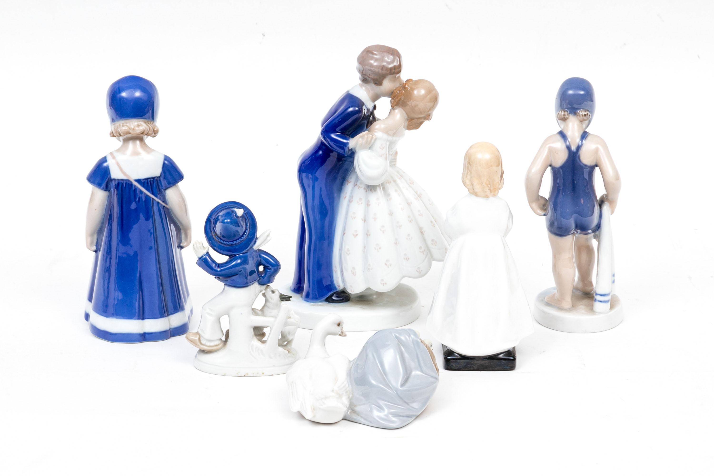 B & G, Royal Copenhagen and SA figures- bathing beauty, little girl with pocketbook, kissing couple (H. 7 3/4") and a boy with a puppy.