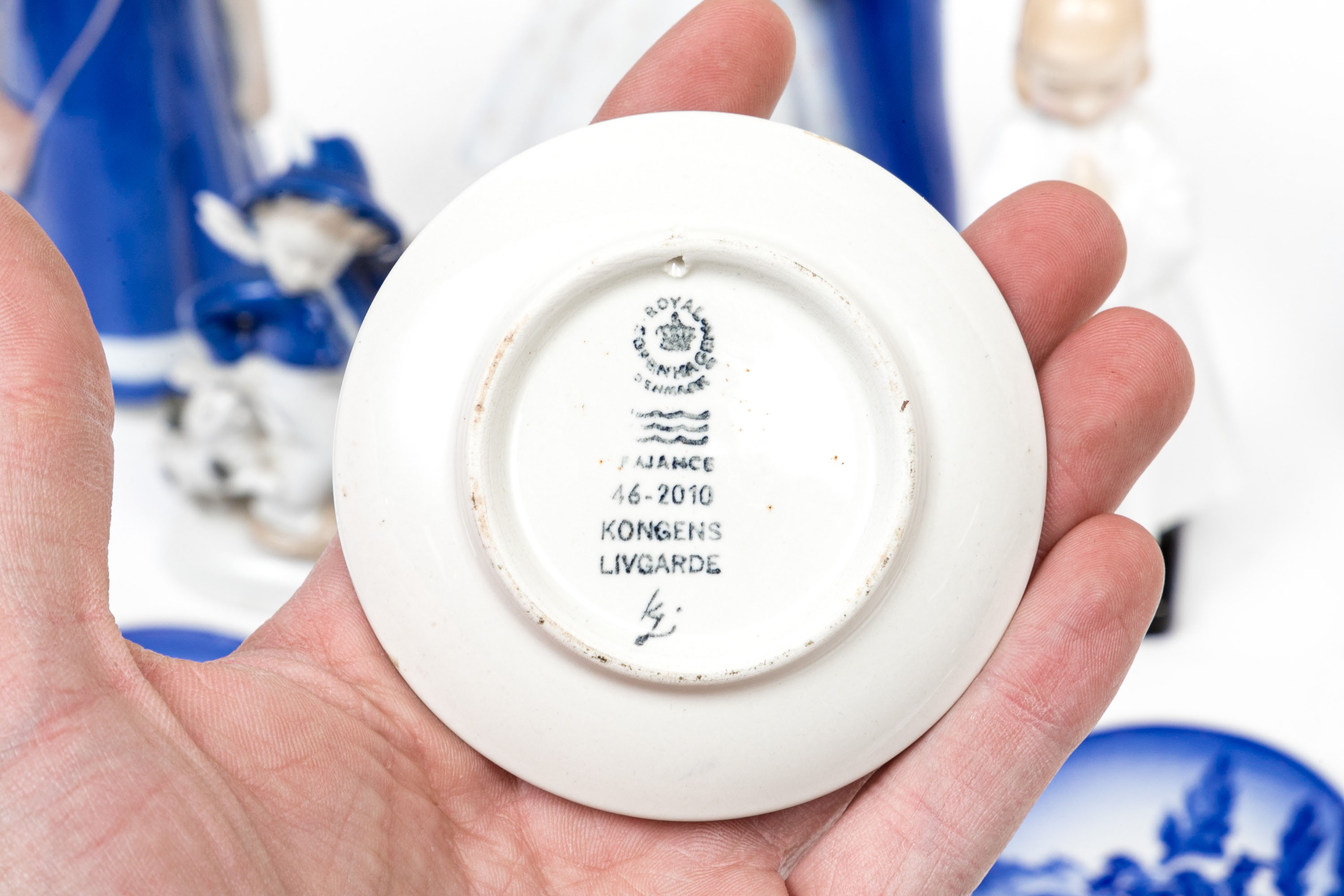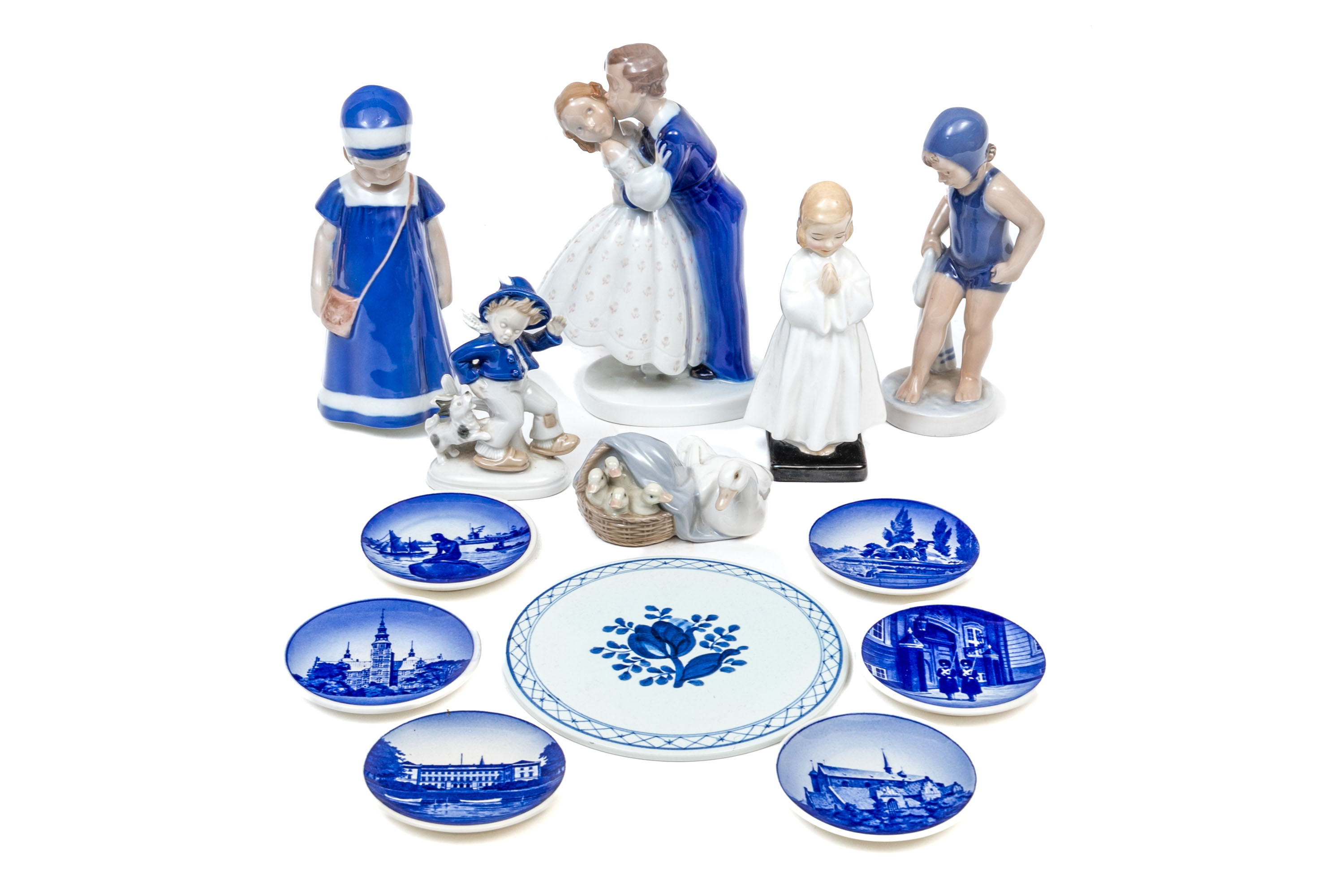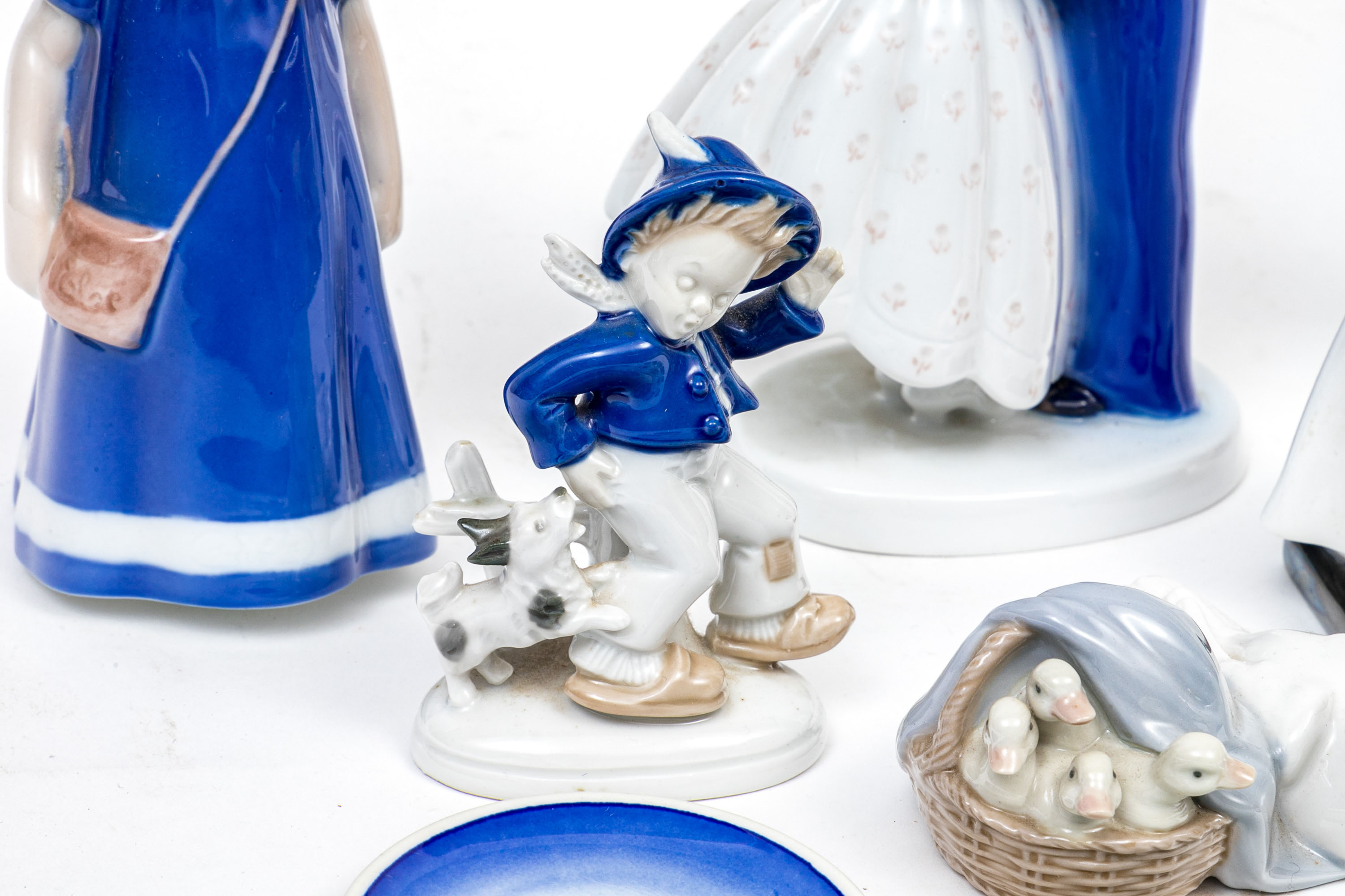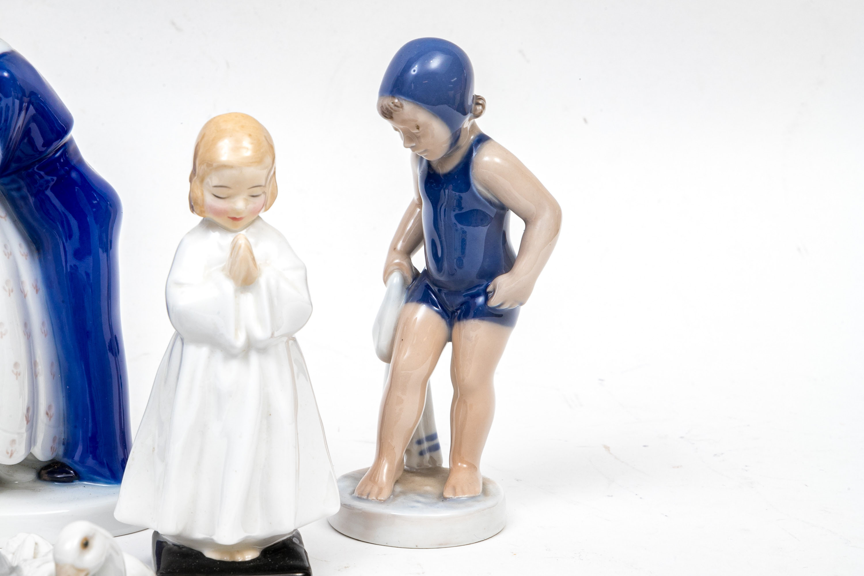 B & G, Royal Copenhagen and SA figures- bathing beauty, little girl with pocketbook, kissing couple (H. 7 3/4") and a boy with a puppy.