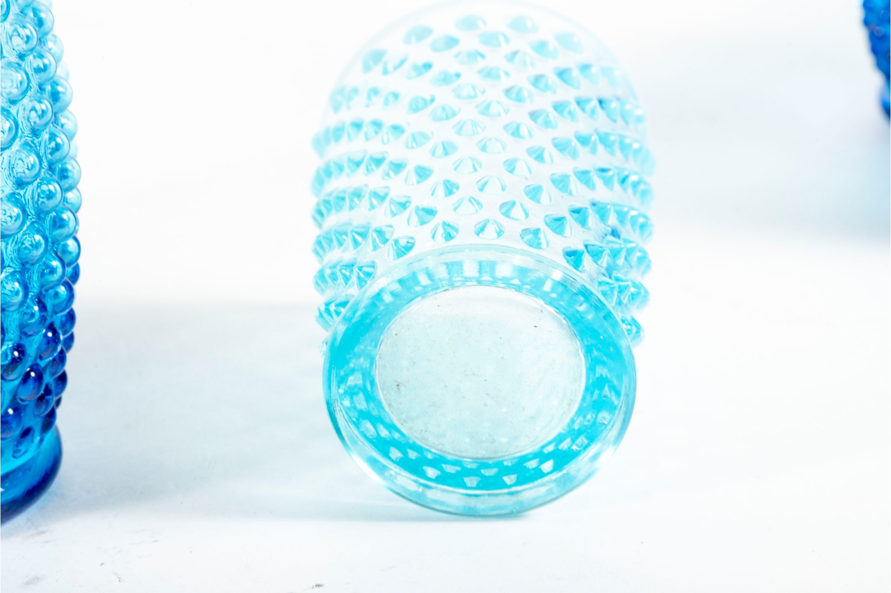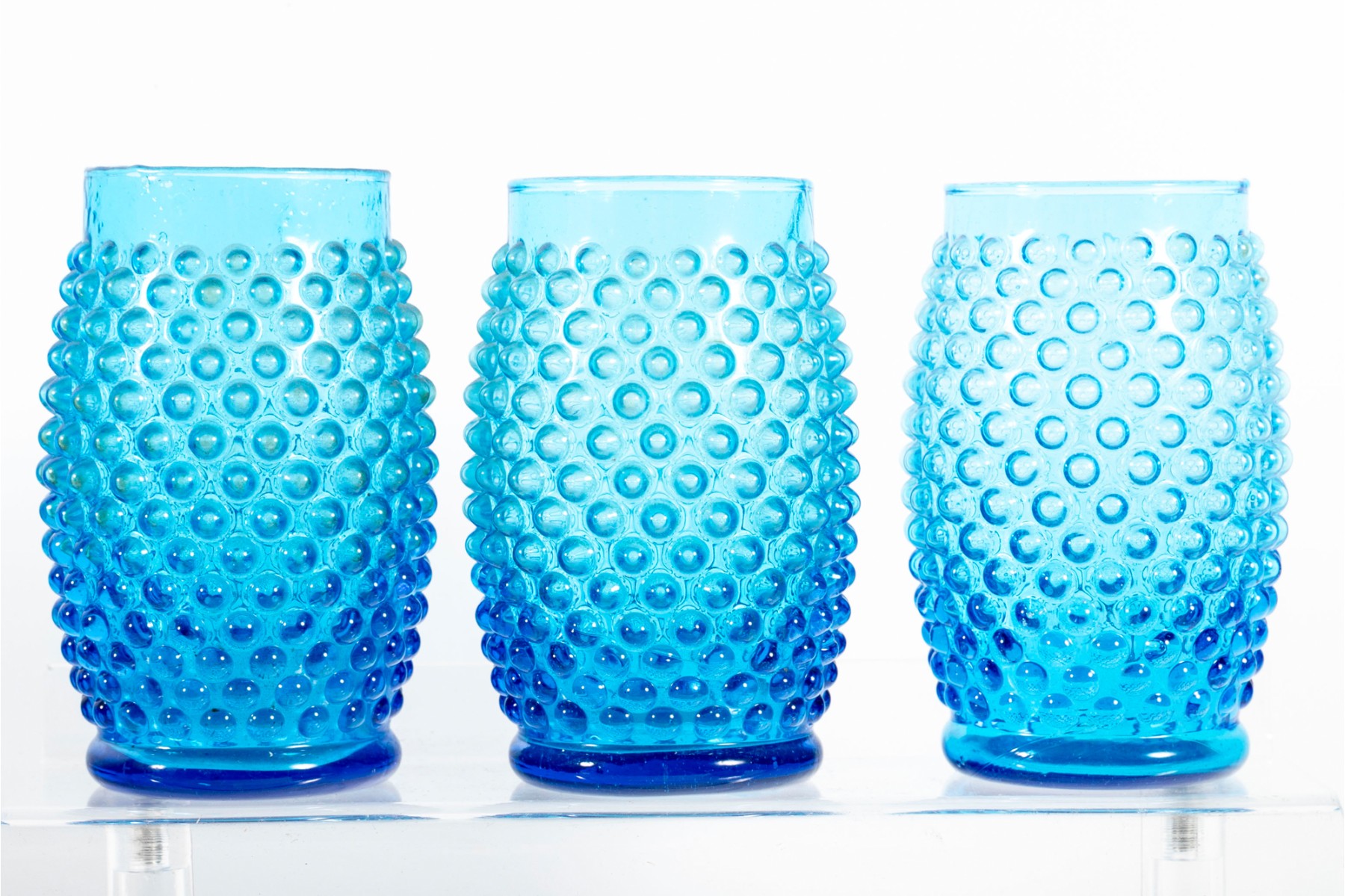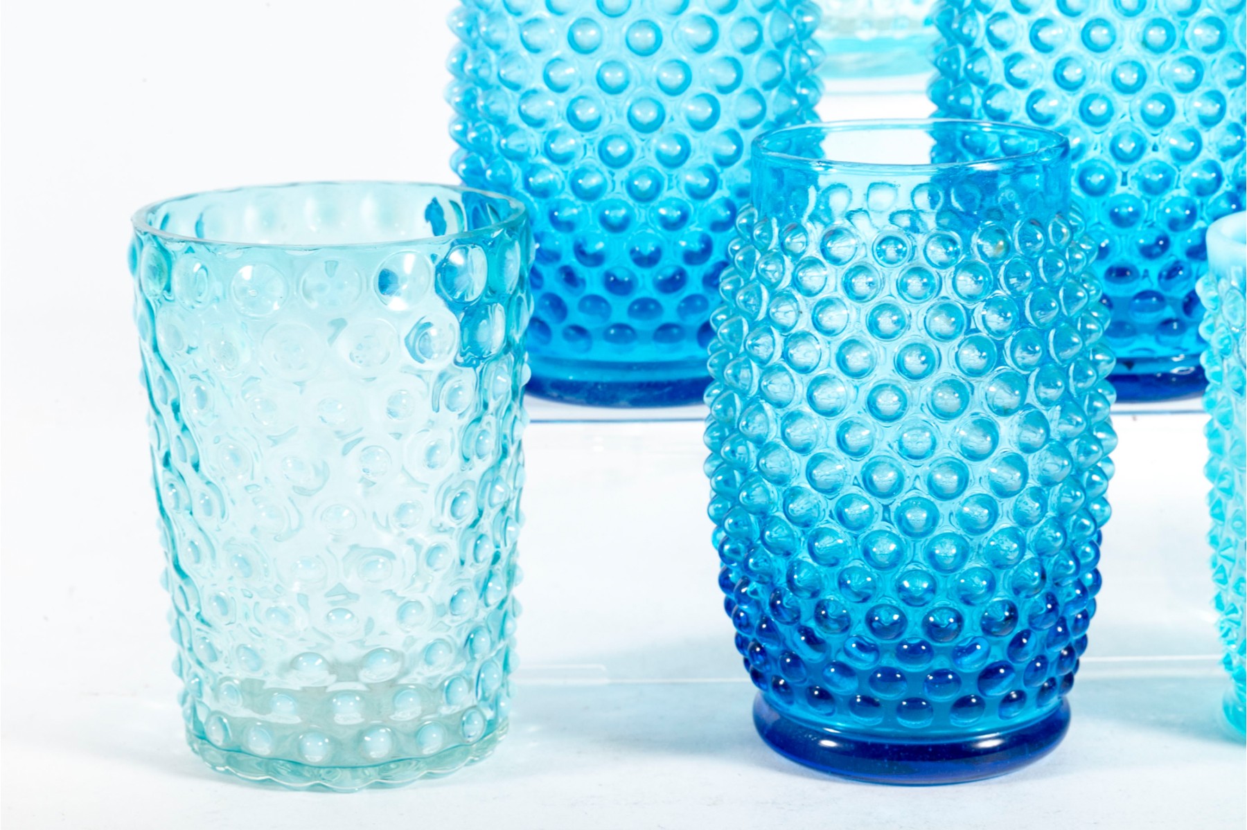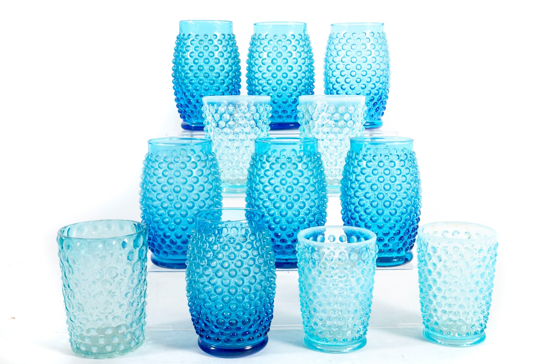 A collection of blue hobnail depression glass tumblers. One comes in light blue with a flat foot, four come in light blue with flared feet, and seven come in dark blue.