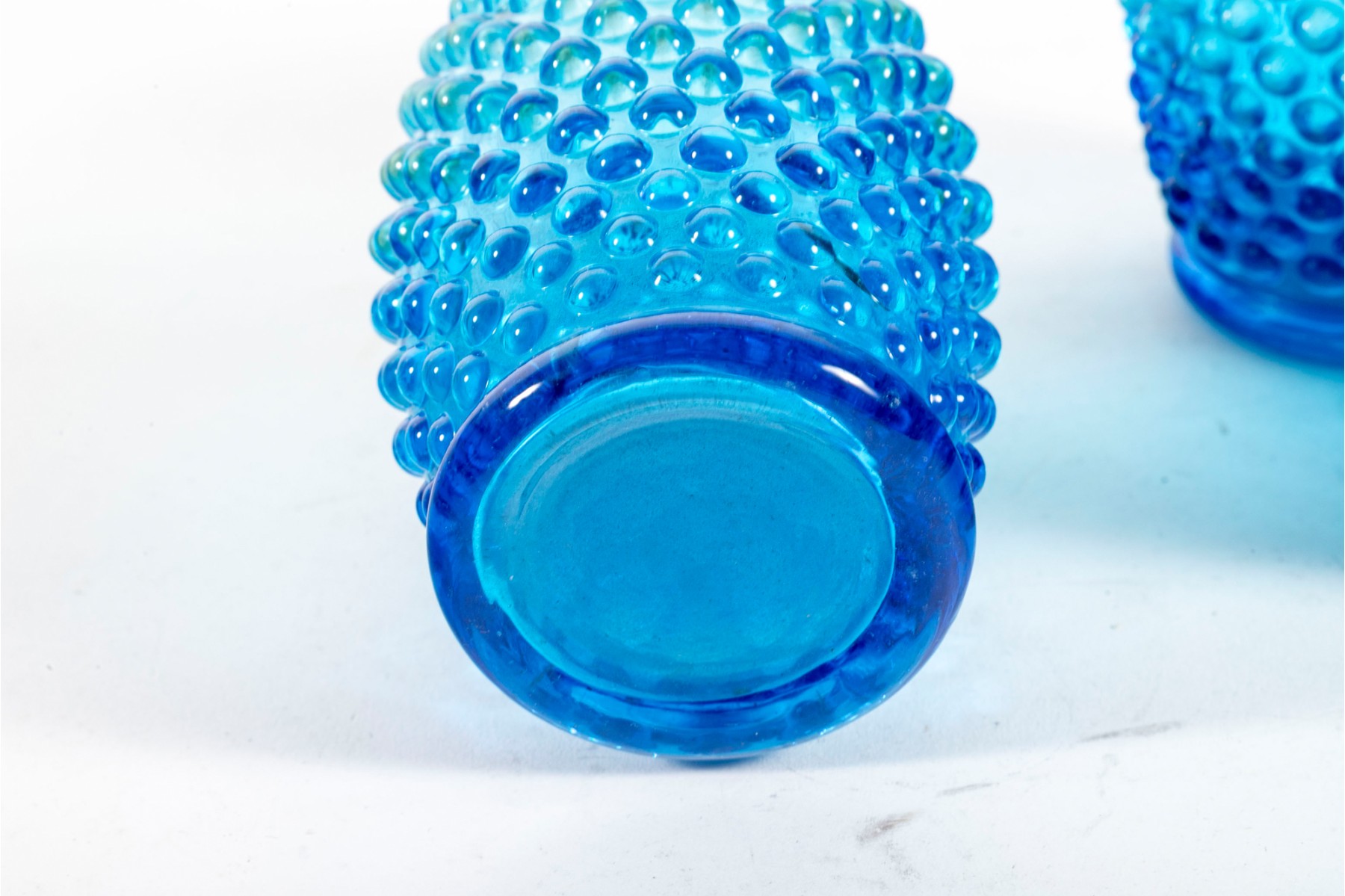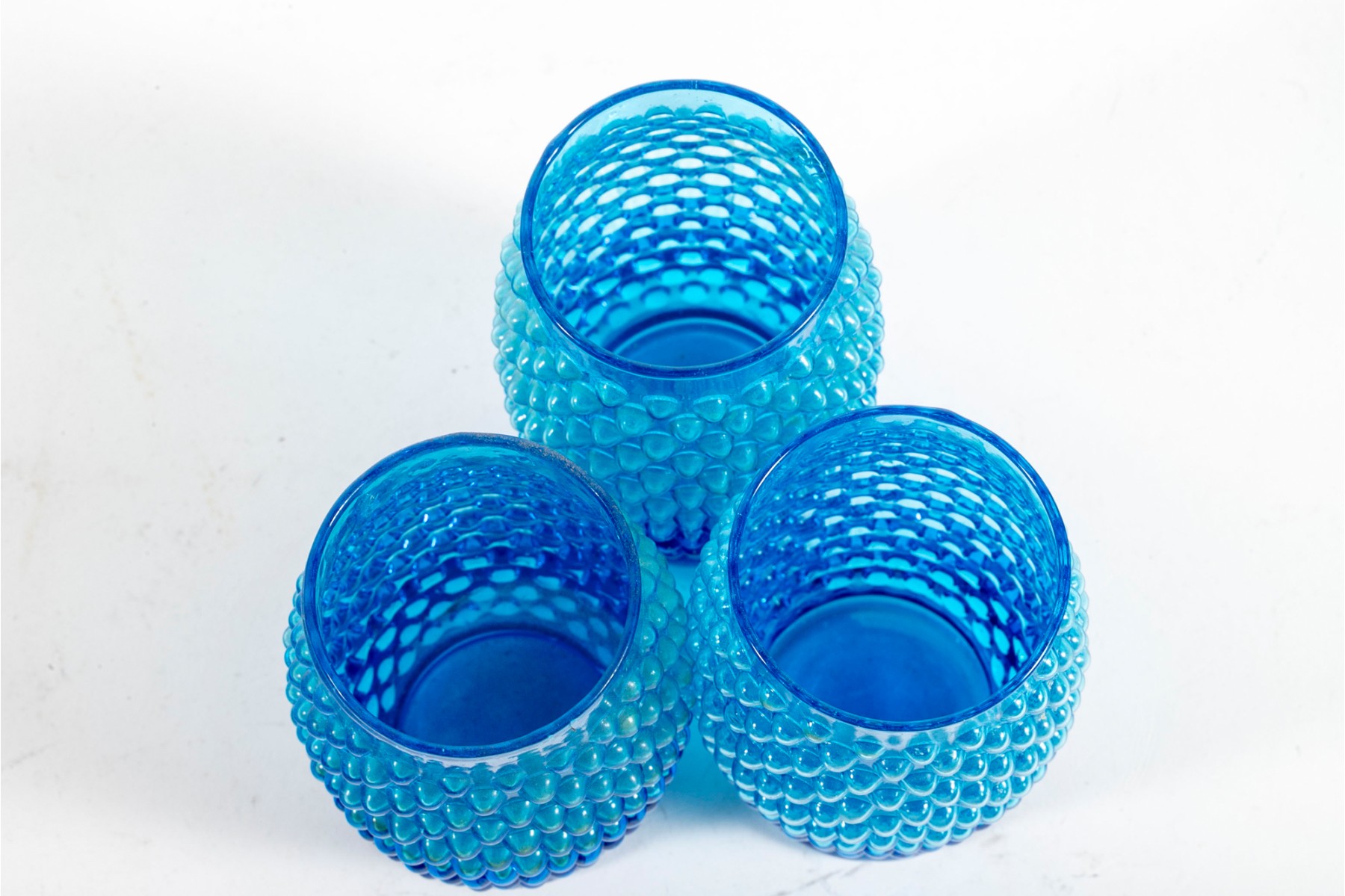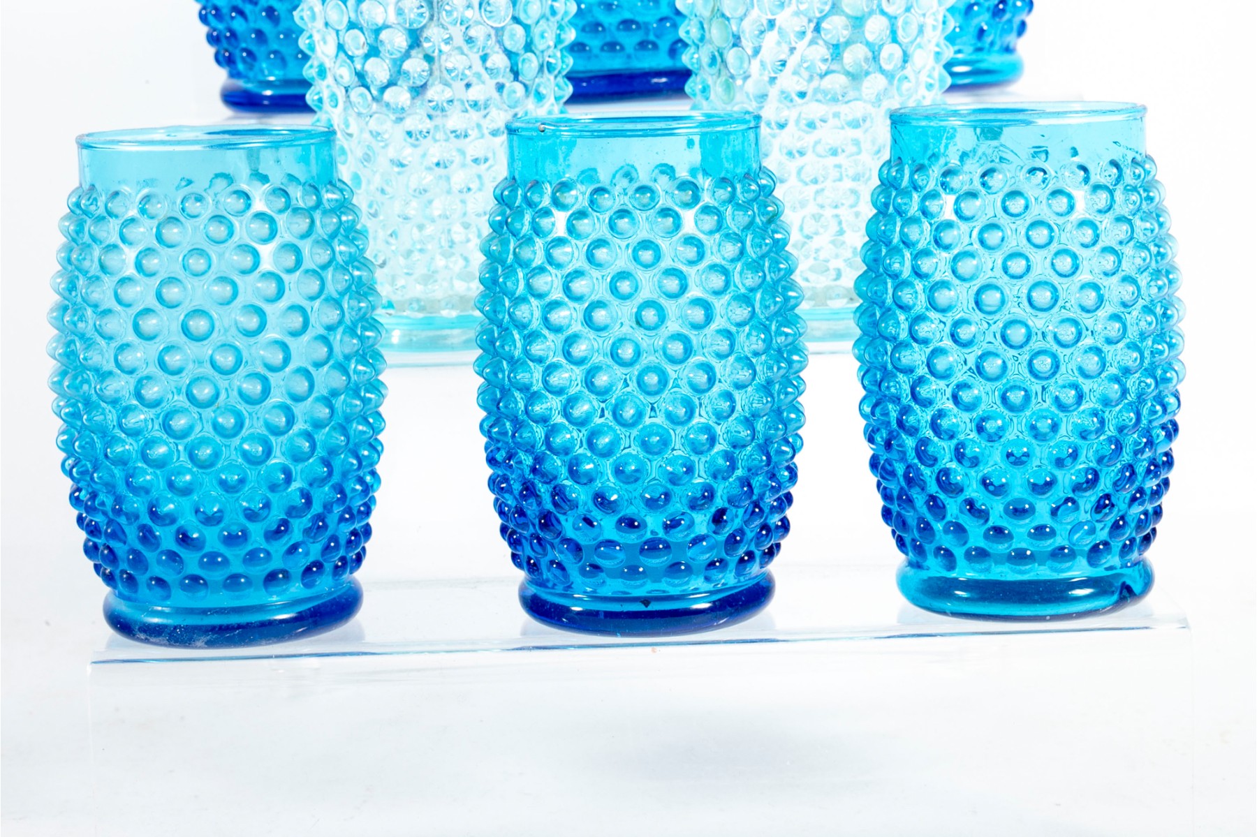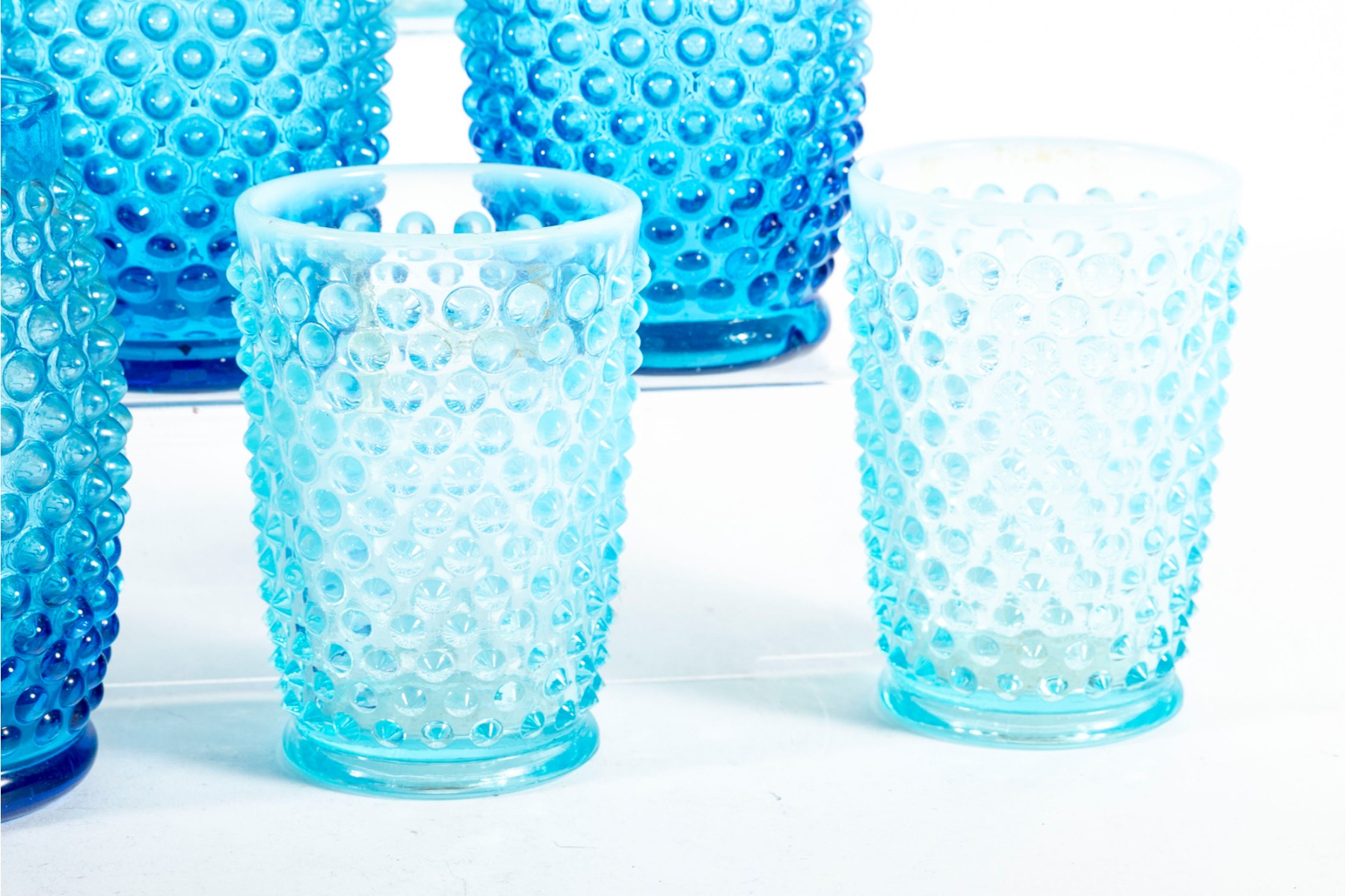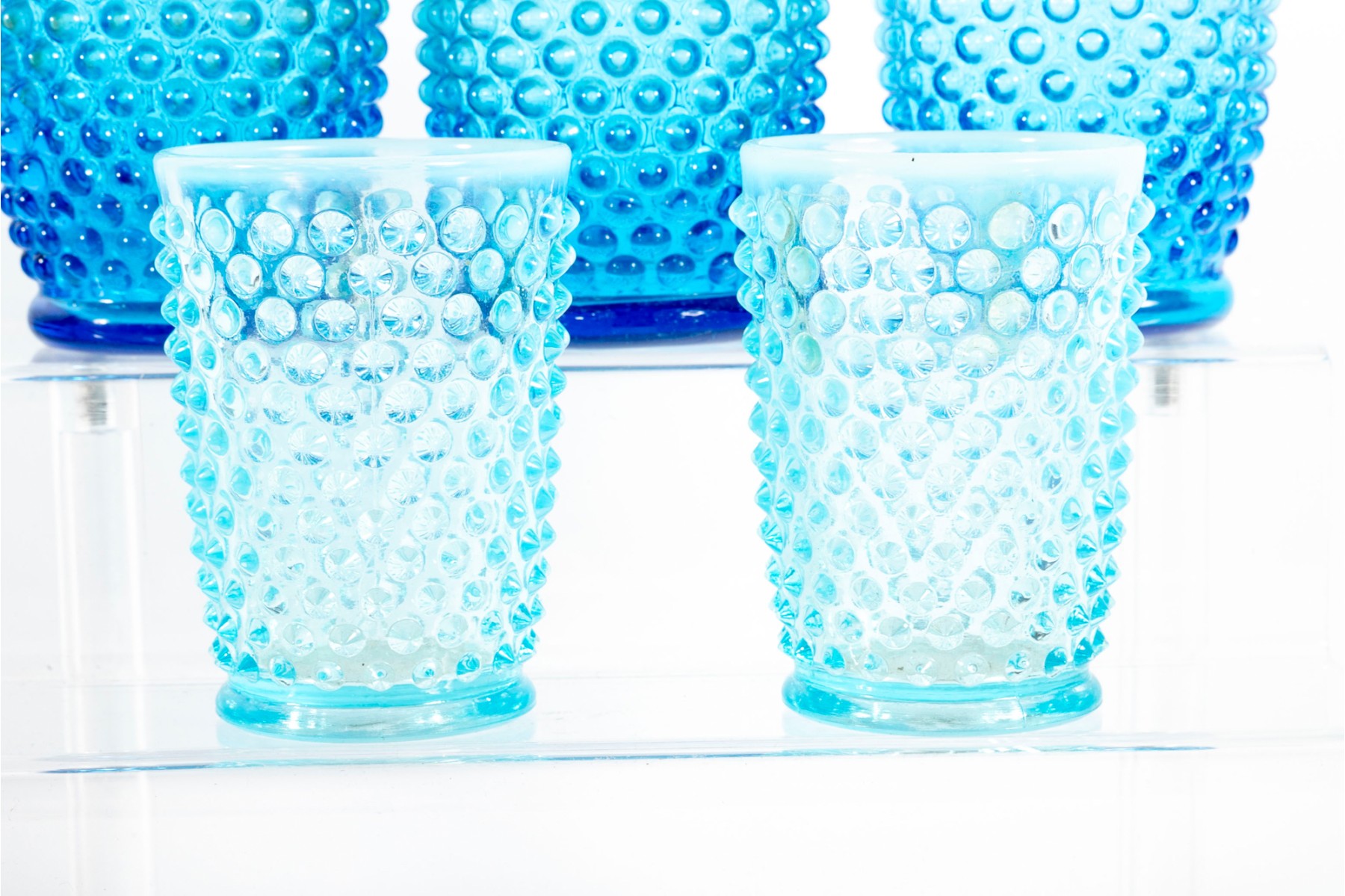 A collection of blue hobnail depression glass tumblers. One comes in light blue with a flat foot, four come in light blue with flared feet, and seven come in dark blue.