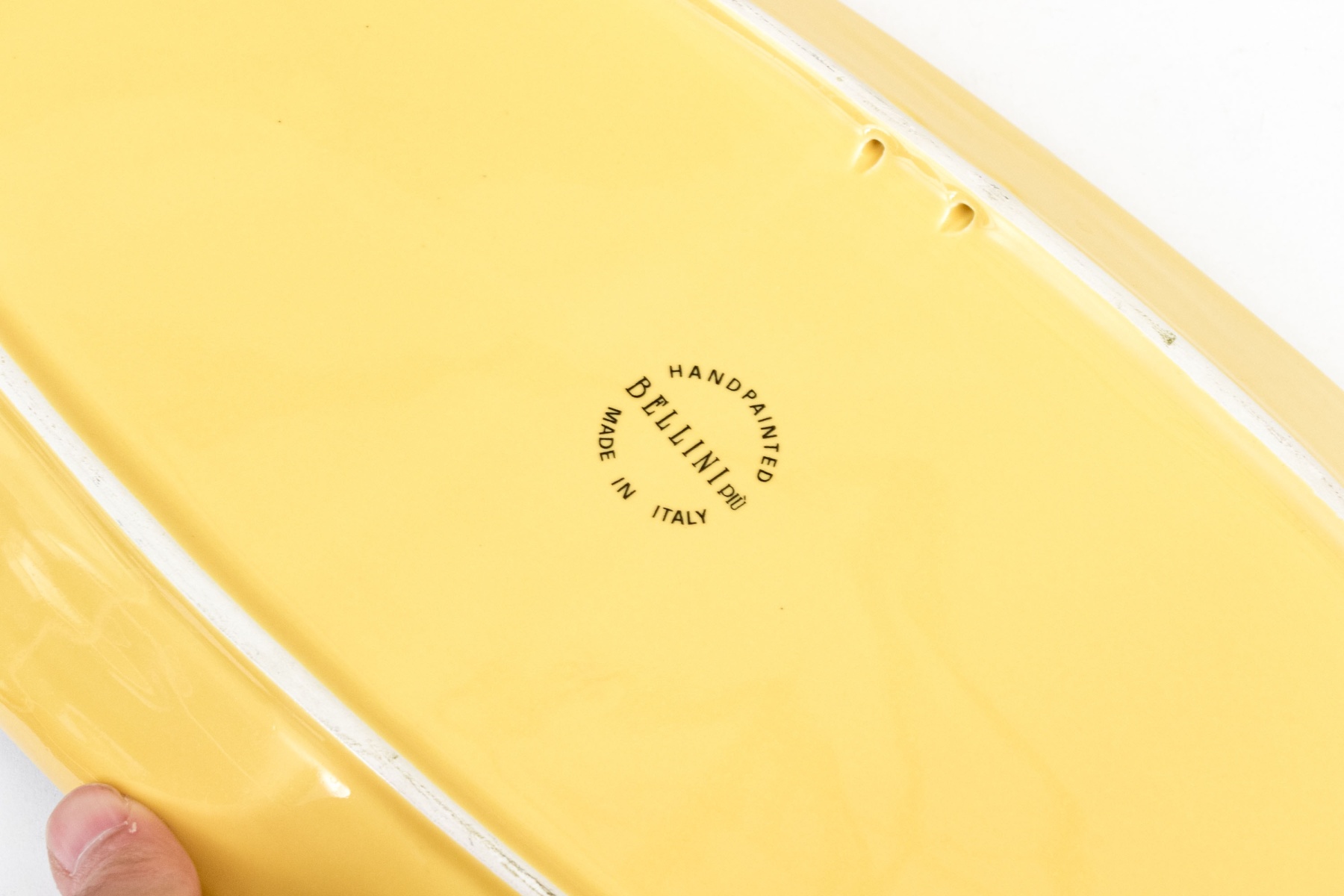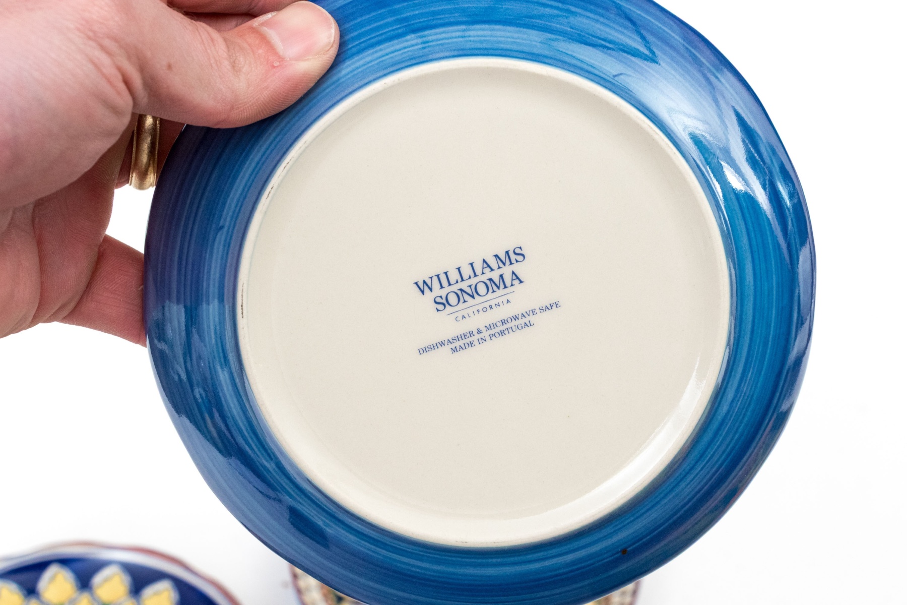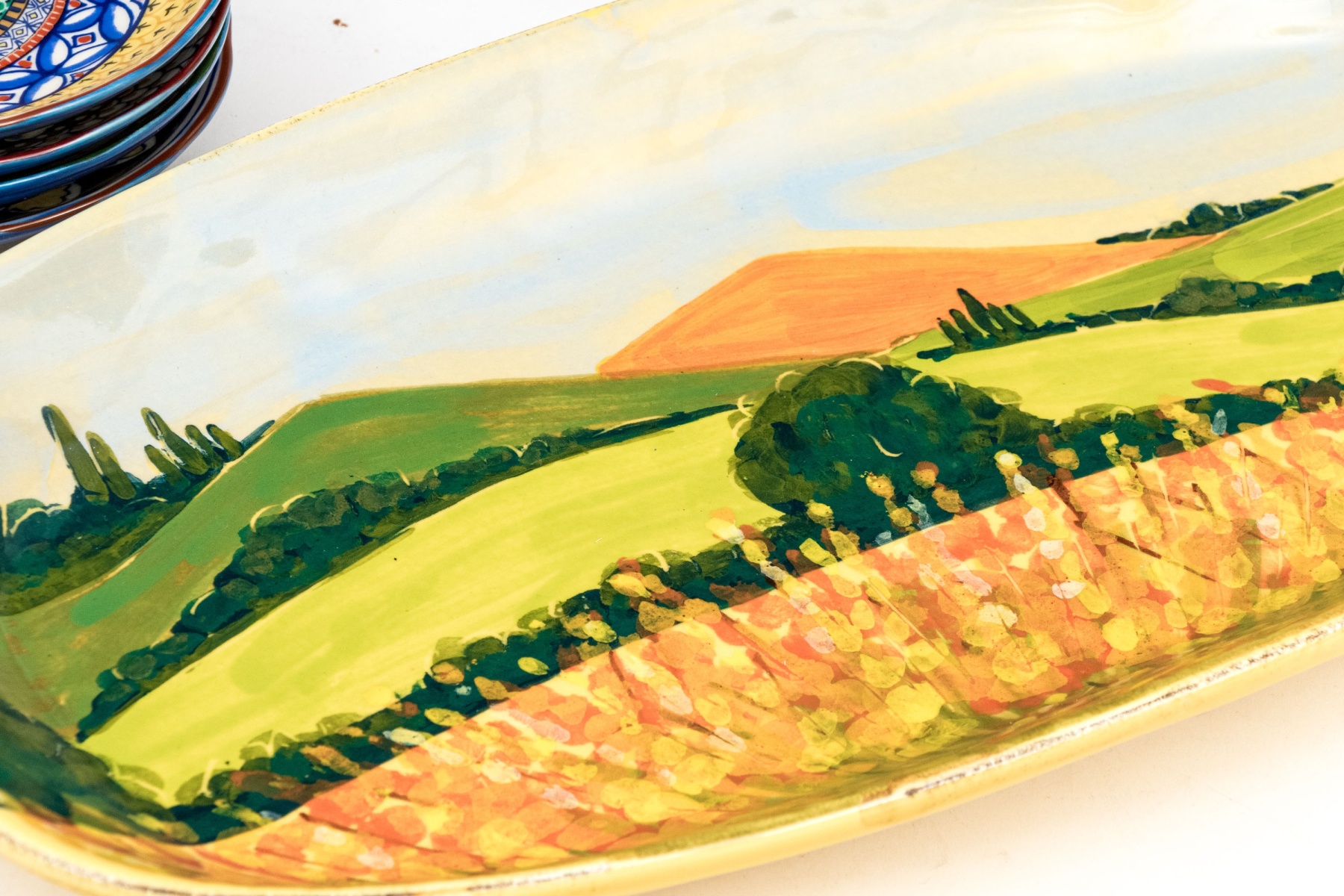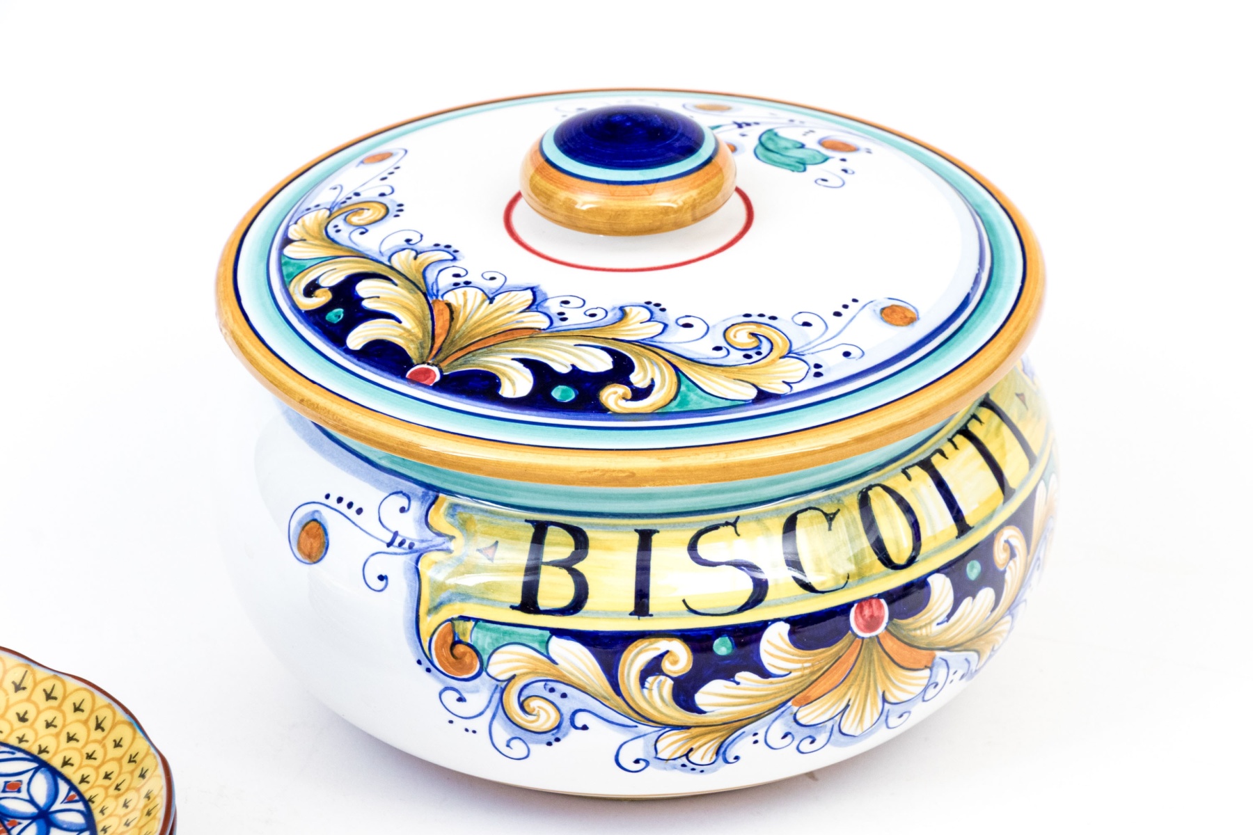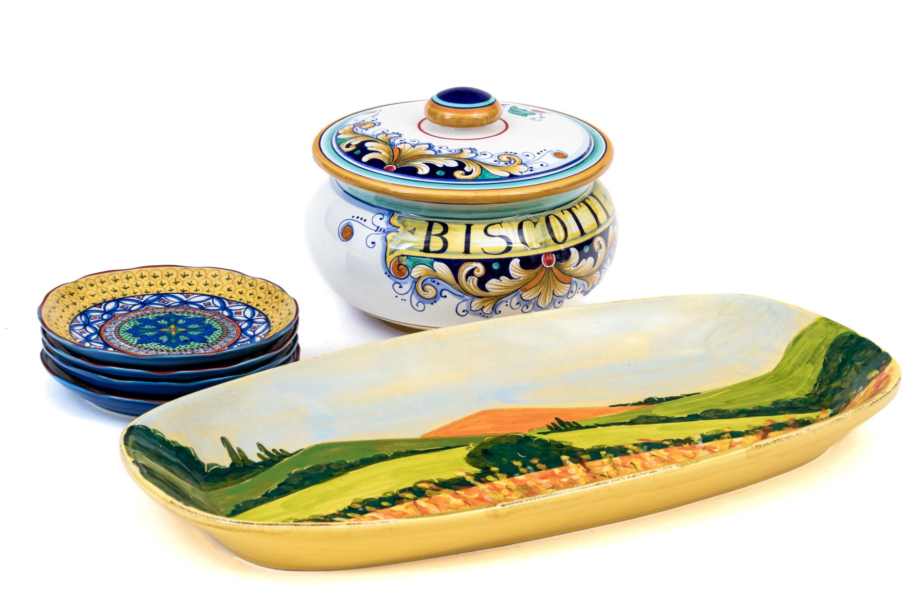 A fabulous collection of ceramics including a lidded biscotti bowl marked Deruta, four Williams-Sonoma plates, and a long hand-painted Bellini serving tray.