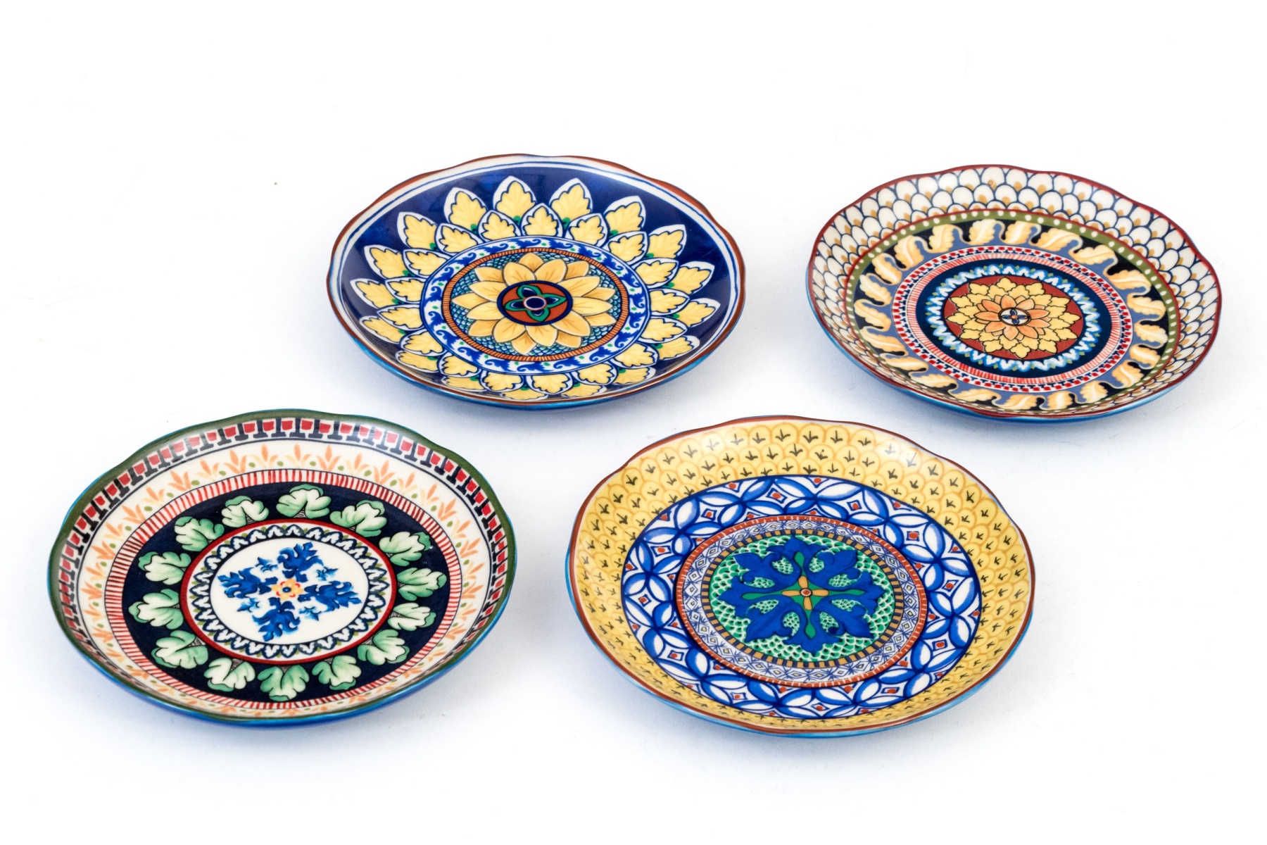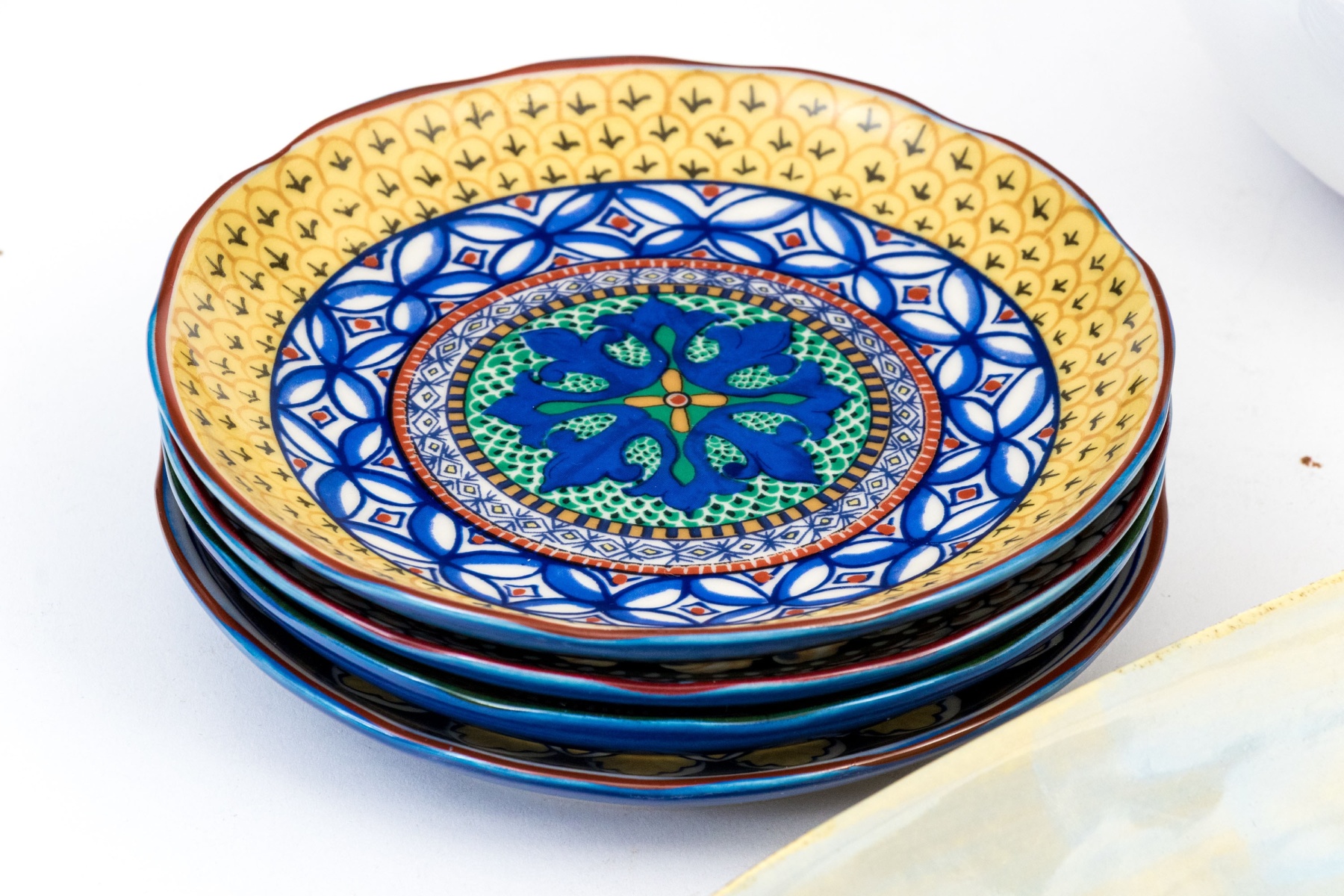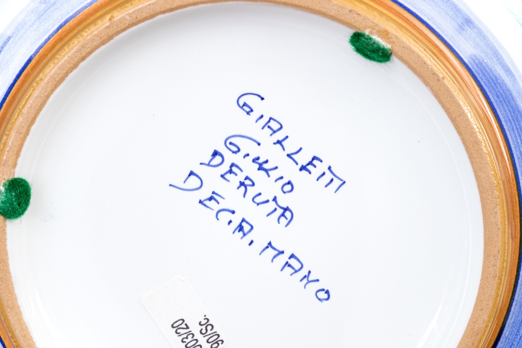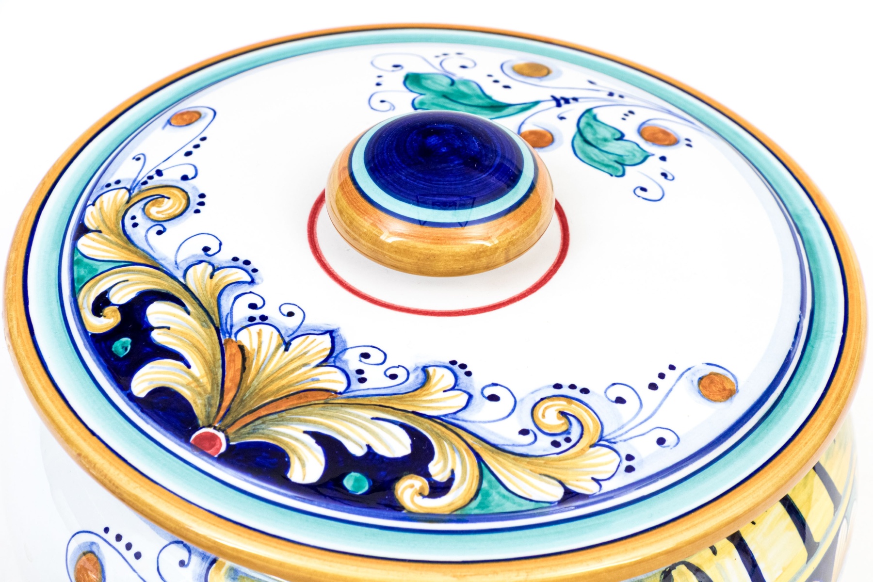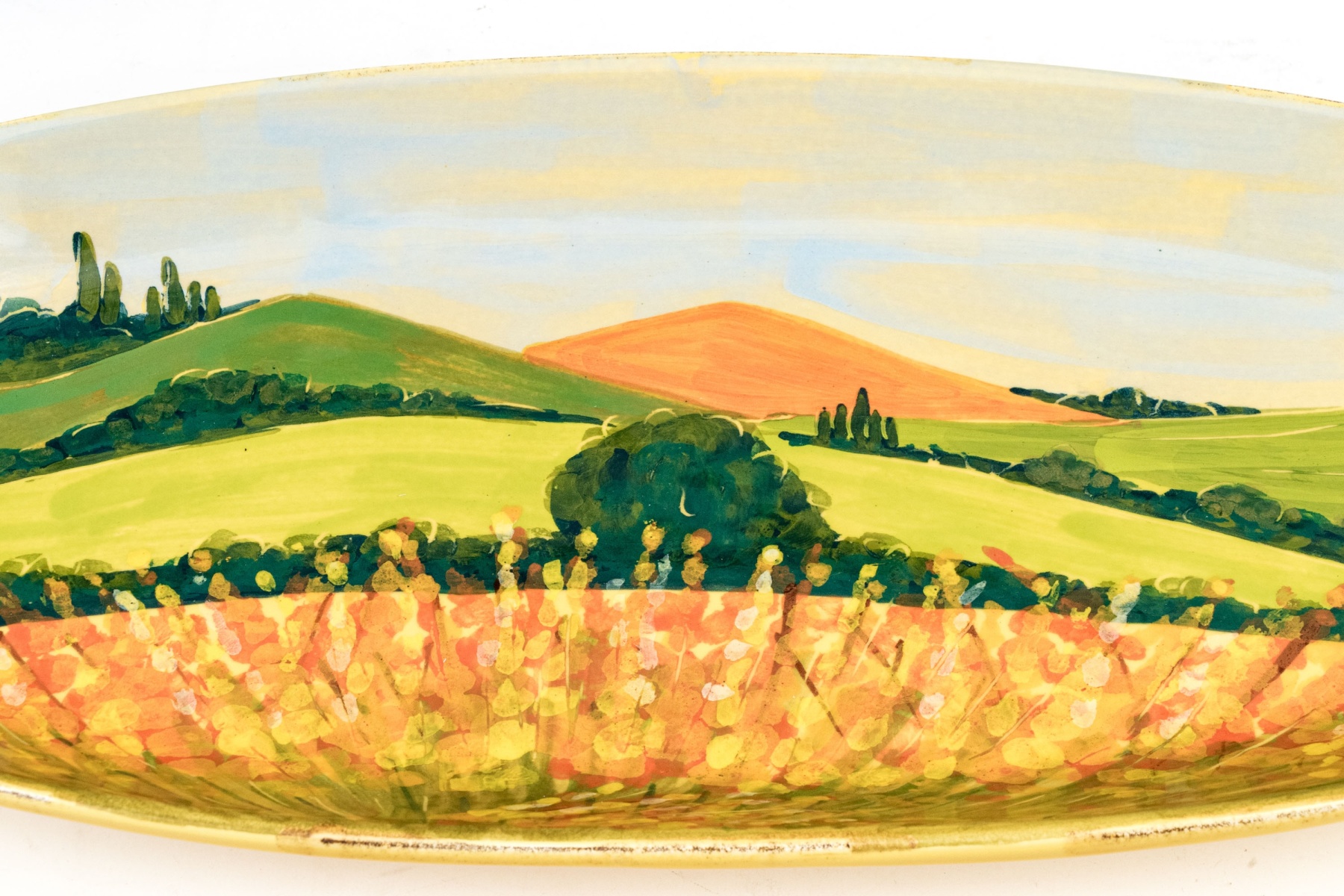 A fabulous collection of ceramics including a lidded biscotti bowl marked Deruta, four Williams-Sonoma plates, and a long hand-painted Bellini serving tray.