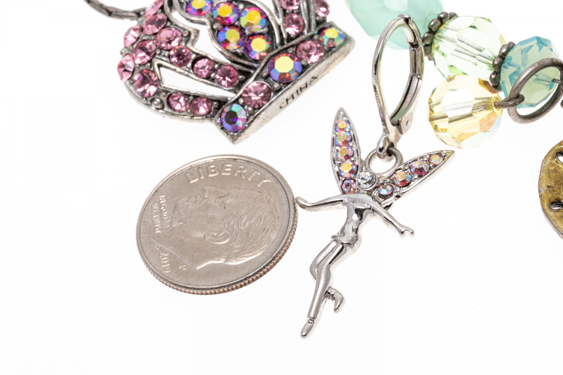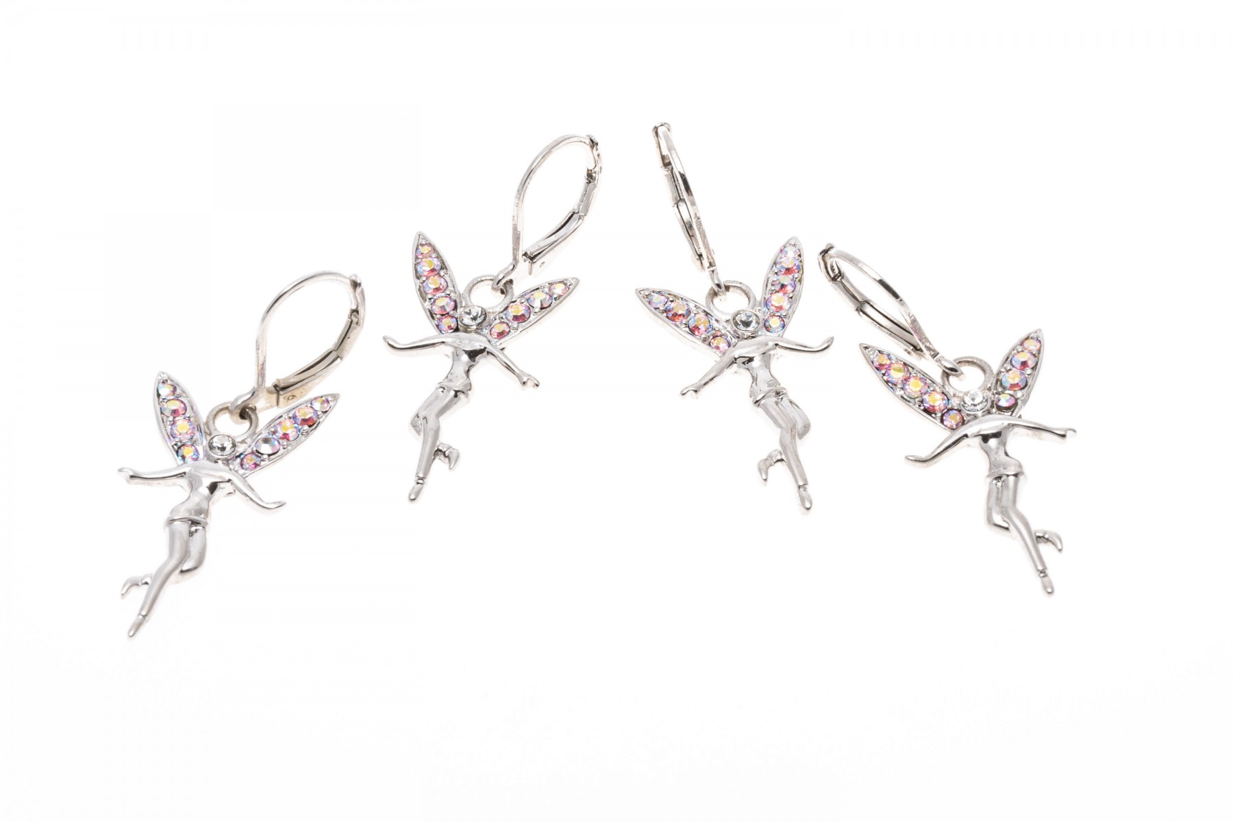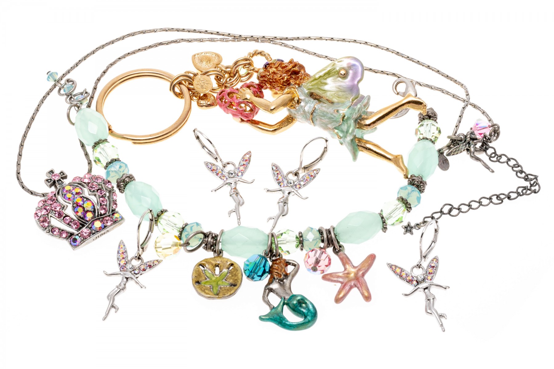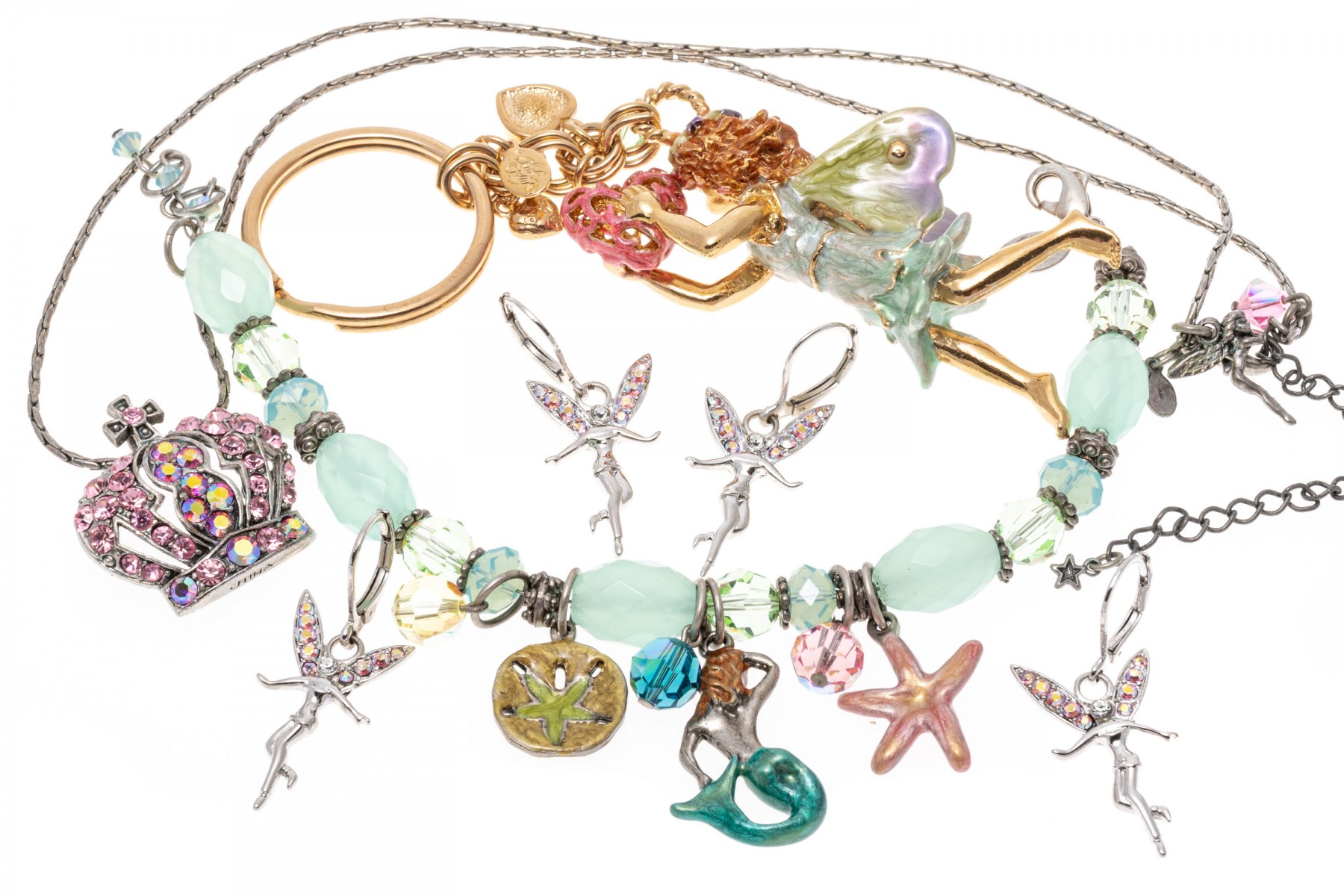 A group of cheerful fairy jewelry. Two pairs of matching earrings display flying fairies with suspended from leaver backings. Pairing with the earrings is a bracelet with fairy charms and a large fairy keychain. Last is a necklace with a pink cubic zirconia set crown pendant.