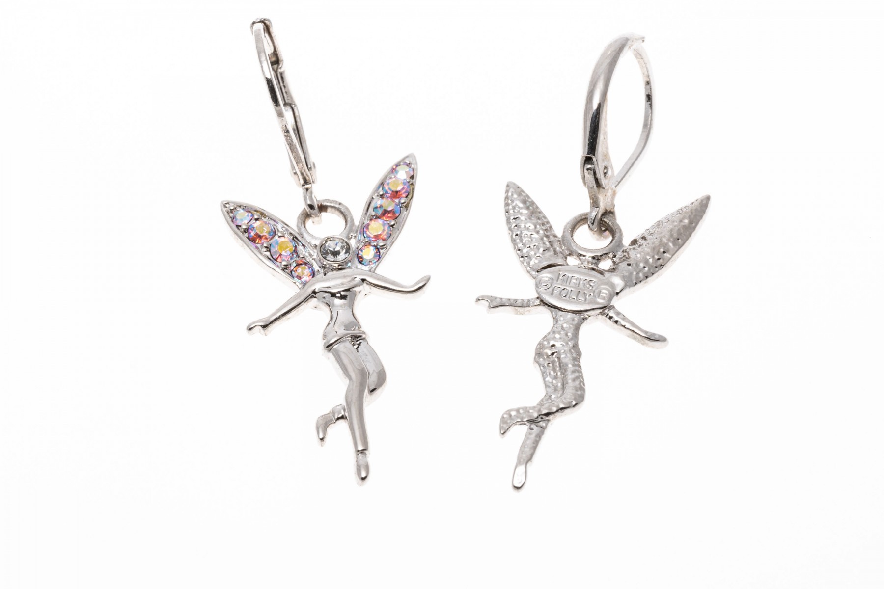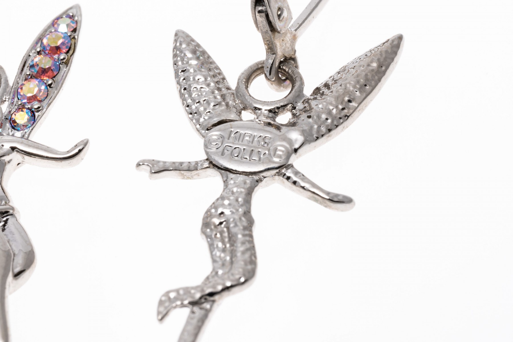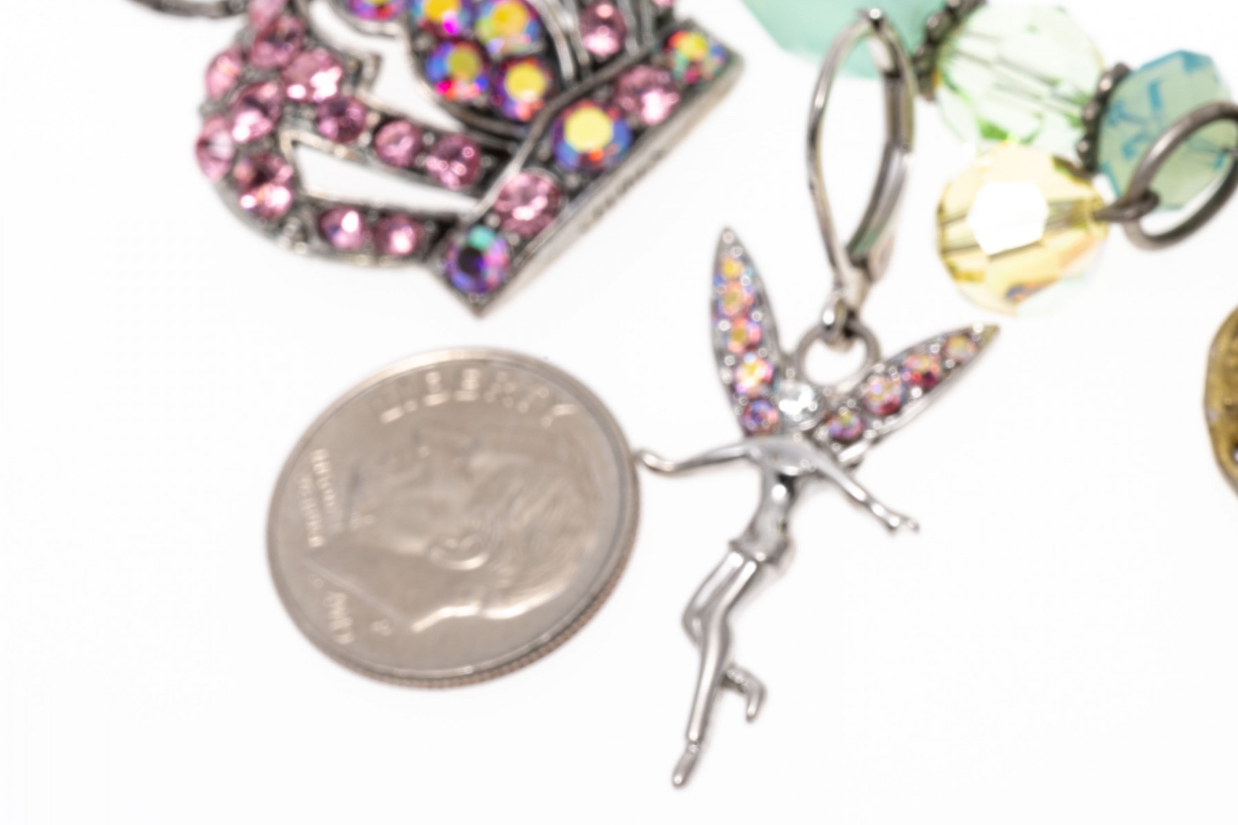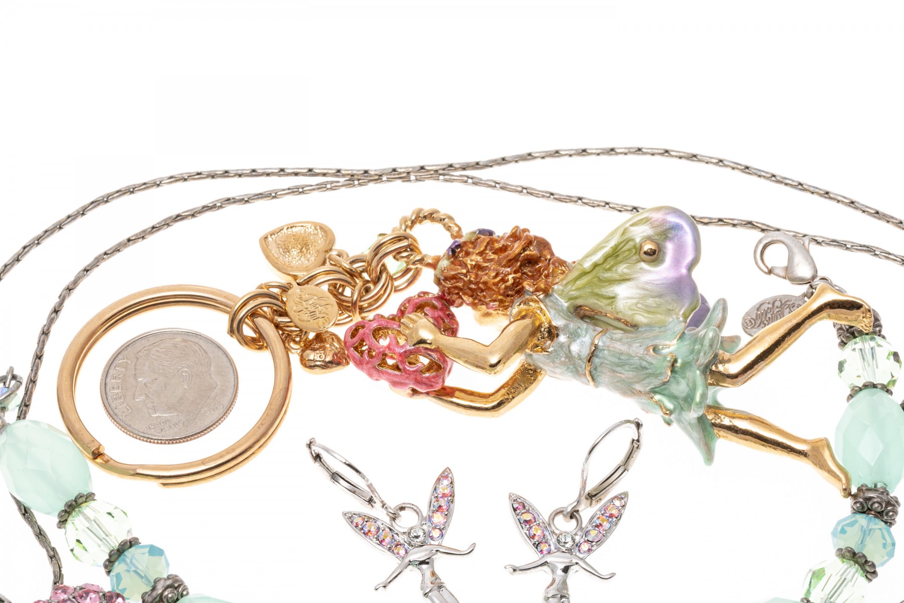 A group of cheerful fairy jewelry. Two pairs of matching earrings display flying fairies with suspended from leaver backings. Pairing with the earrings is a bracelet with fairy charms and a large fairy keychain. Last is a necklace with a pink cubic zirconia set crown pendant.