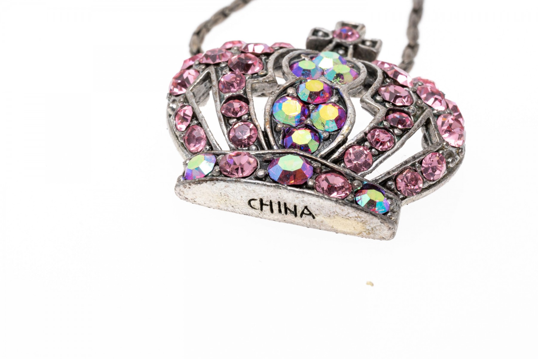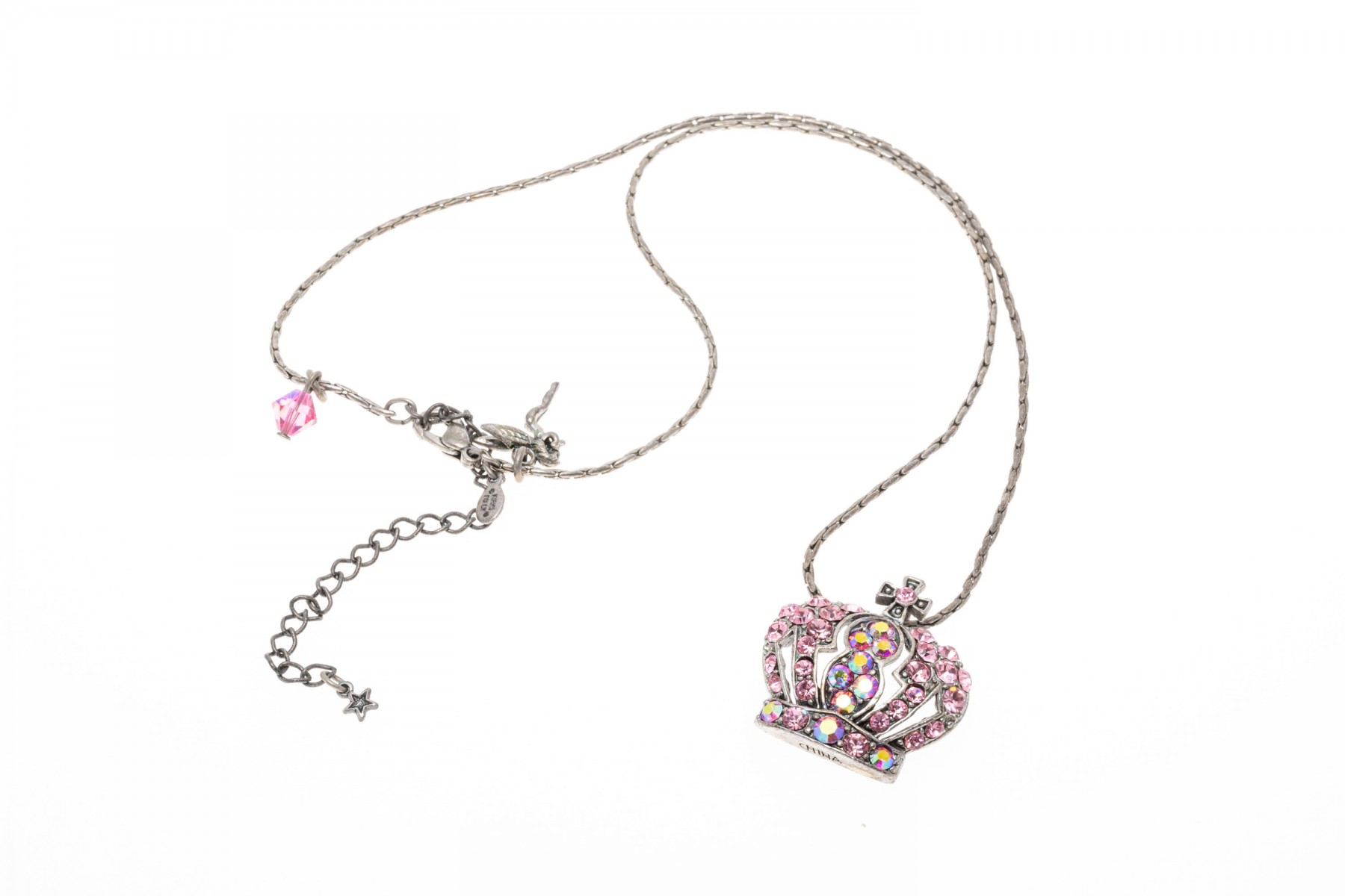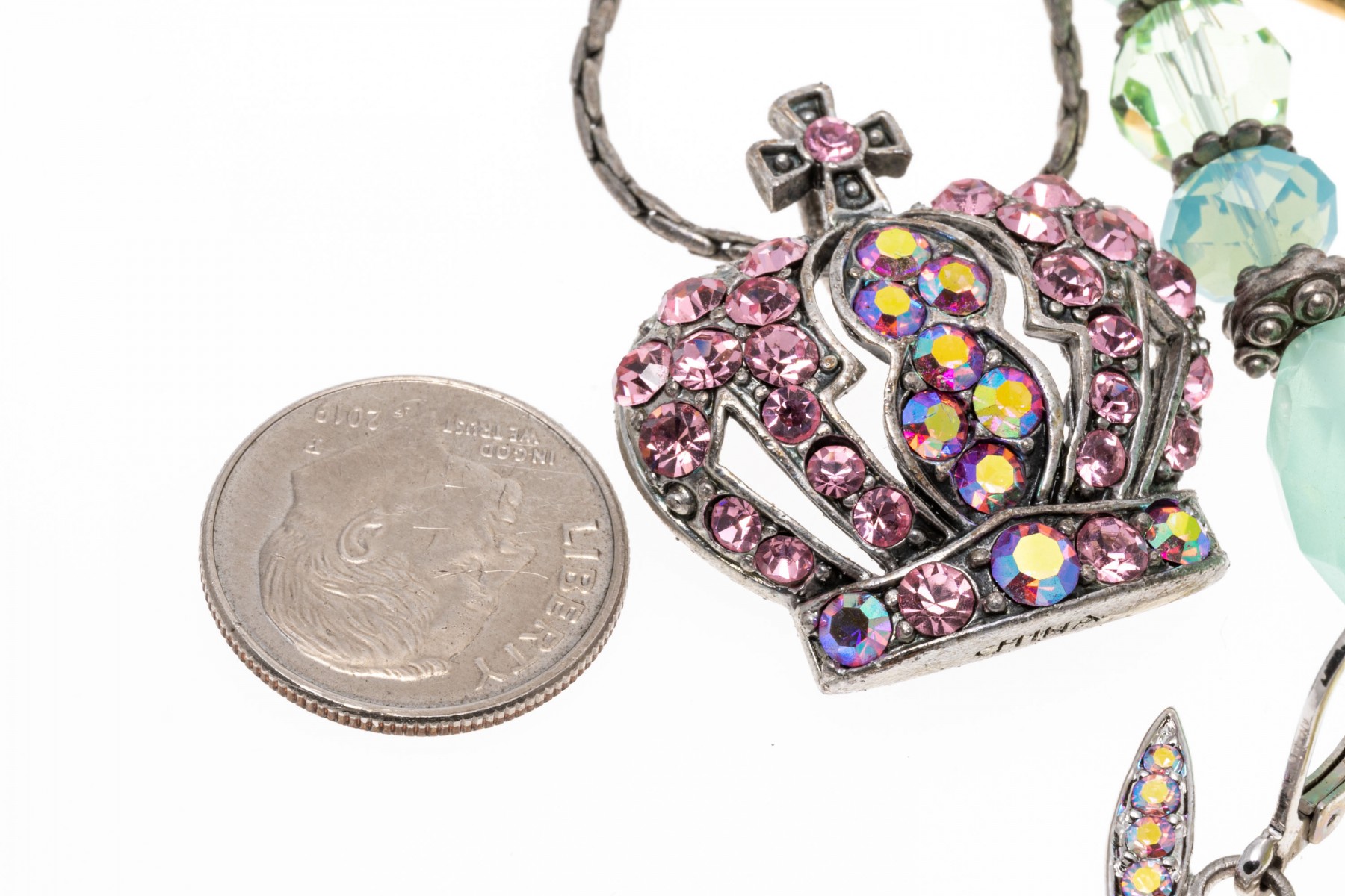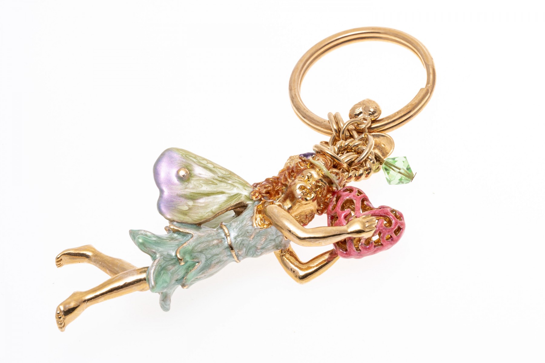 A group of cheerful fairy jewelry. Two pairs of matching earrings display flying fairies with suspended from leaver backings. Pairing with the earrings is a bracelet with fairy charms and a large fairy keychain. Last is a necklace with a pink cubic zirconia set crown pendant.
