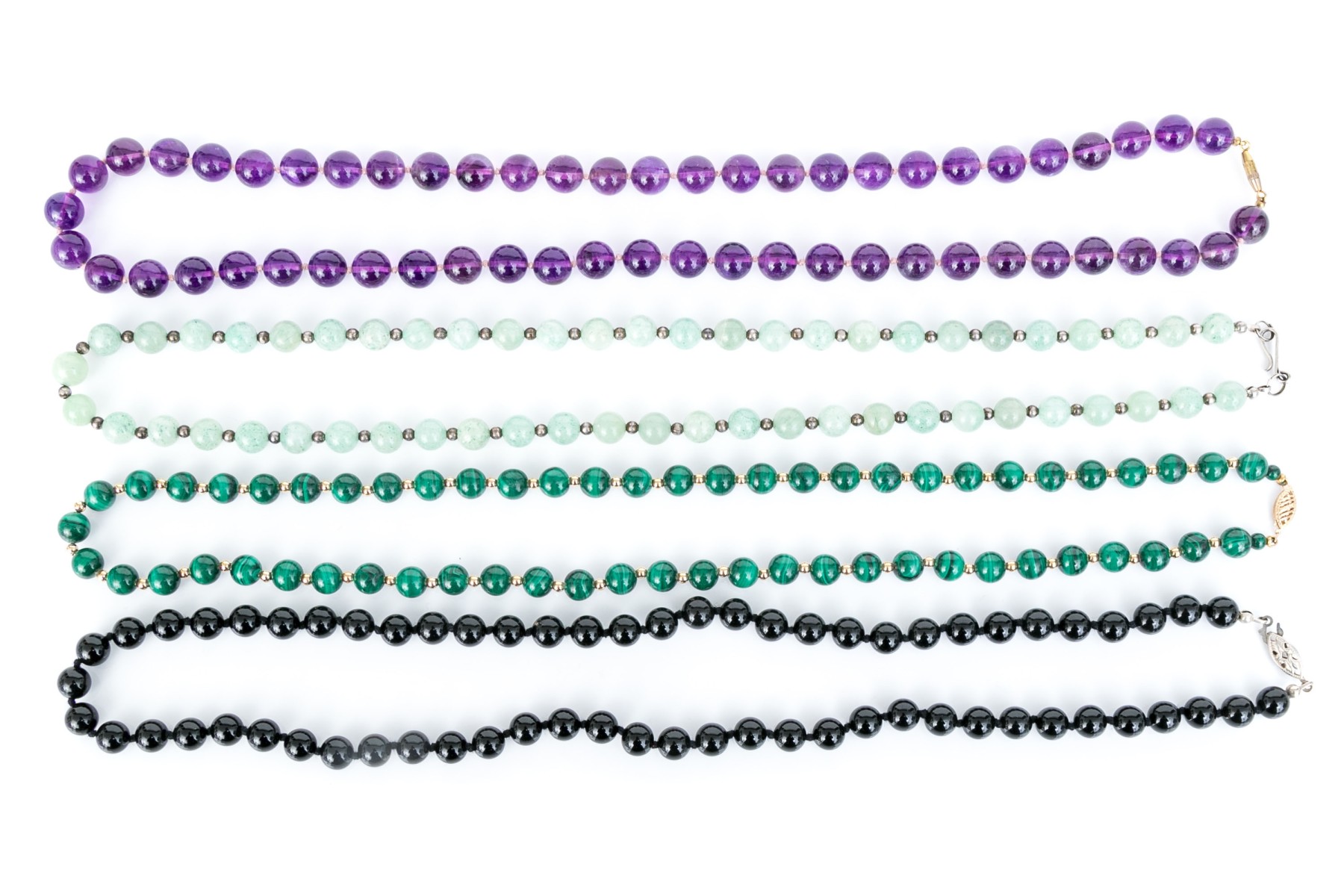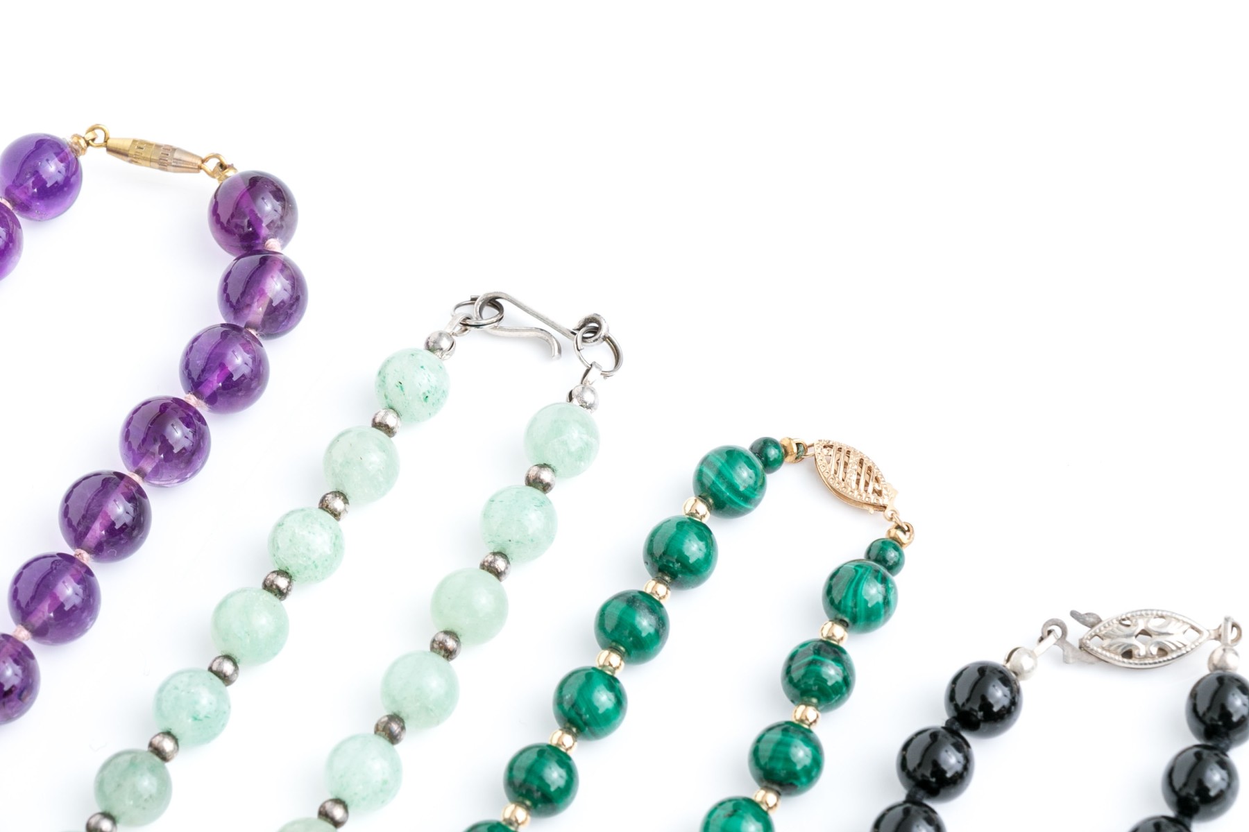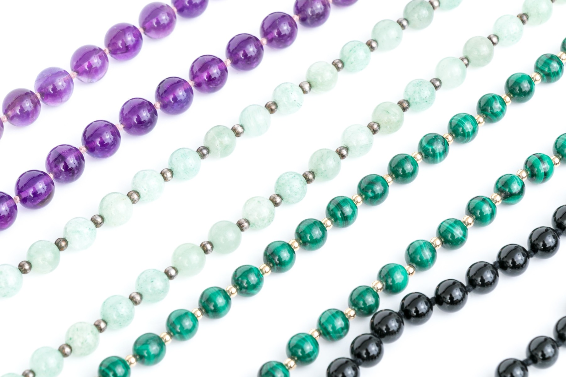 Collection of chic matinee length stone bead necklaces, including amethyst, aventurine quartz, malachite and black onyx stones