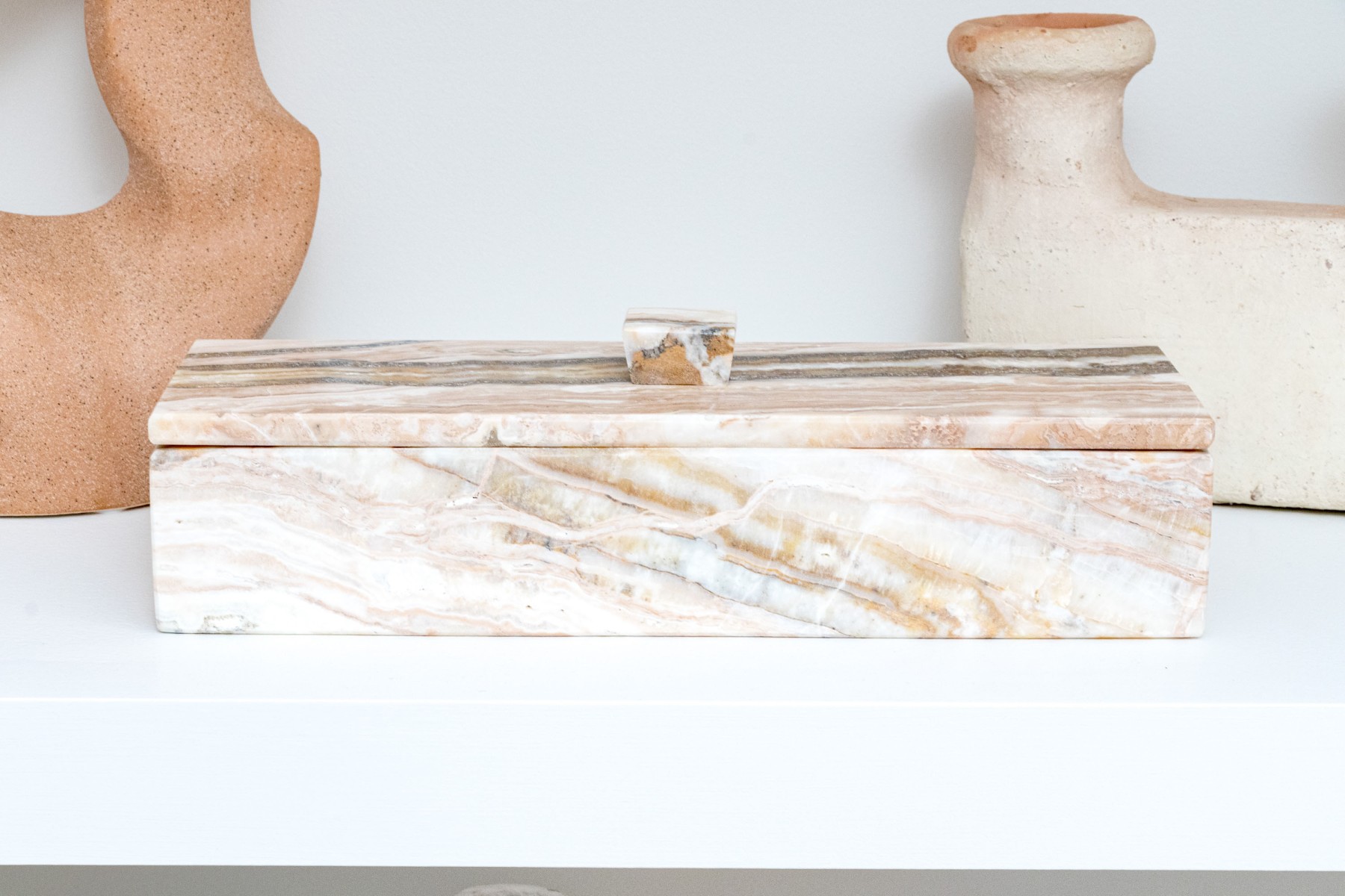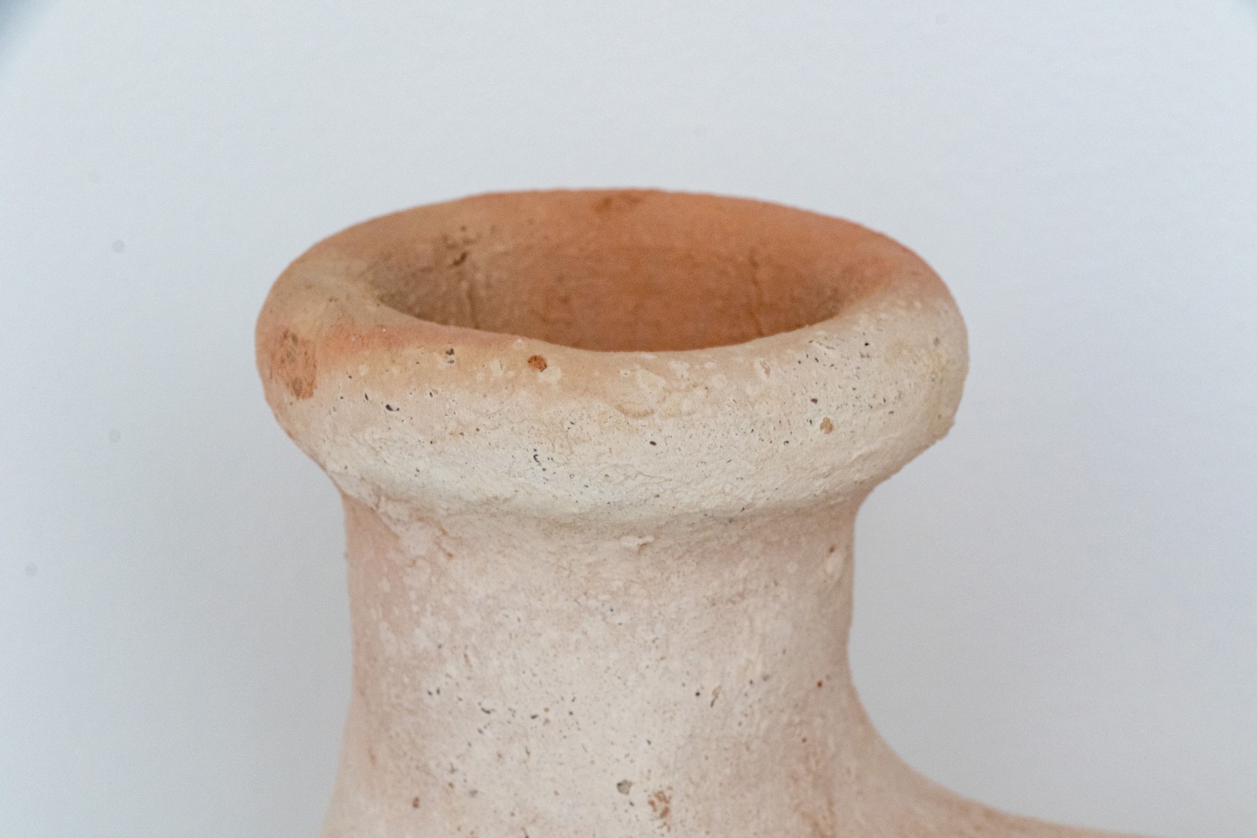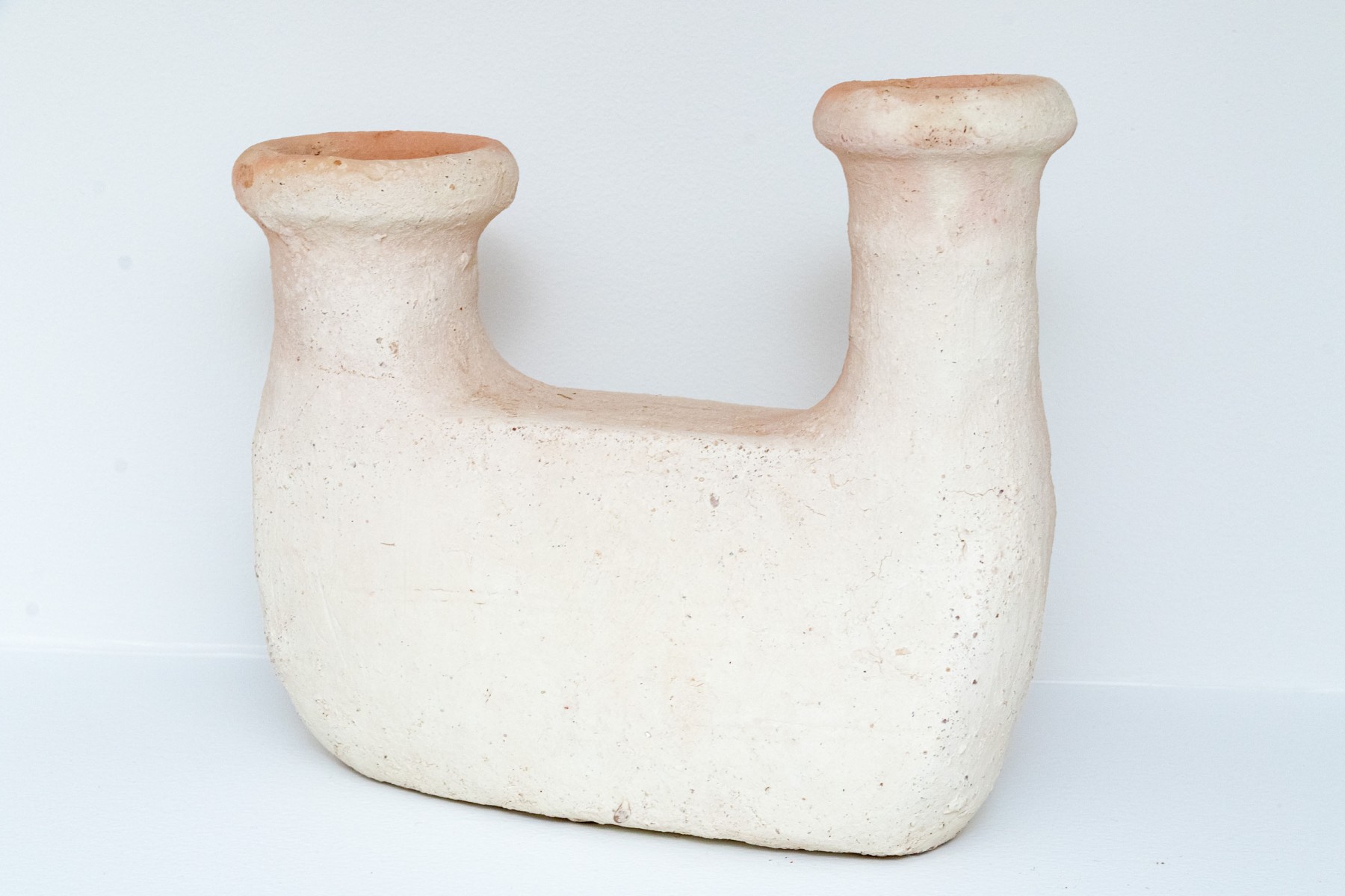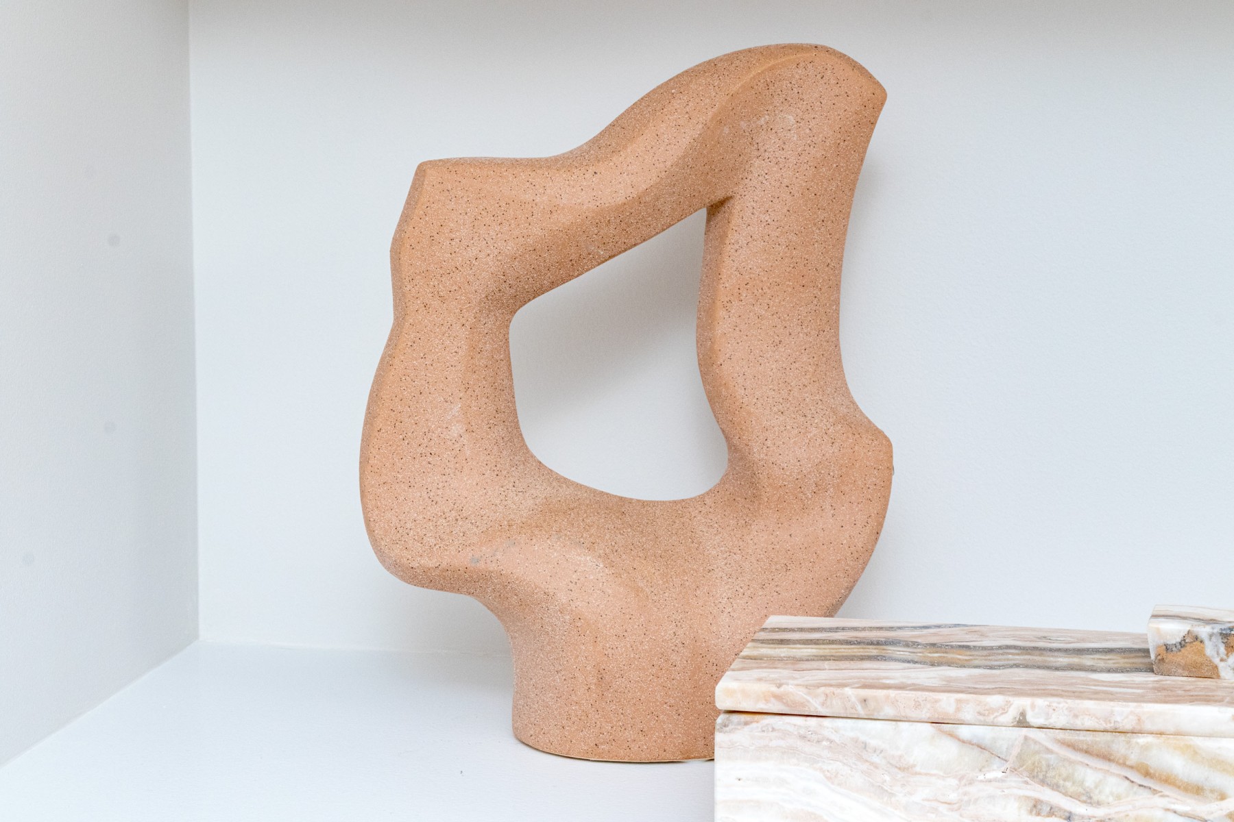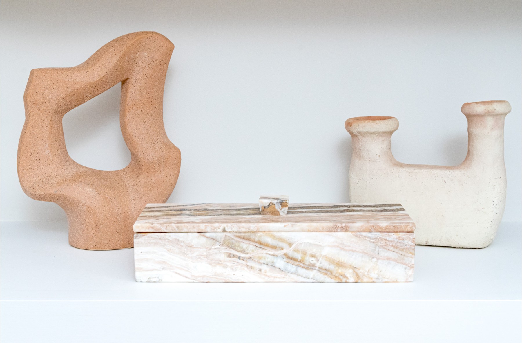 A fabulous collection of chic table decor including a Bloomingvale "Lolla" stoneware sculpture in a peachy terracotta hue with an organic pierced form; a Moroccan style double candle holder in a whitewashed finish.