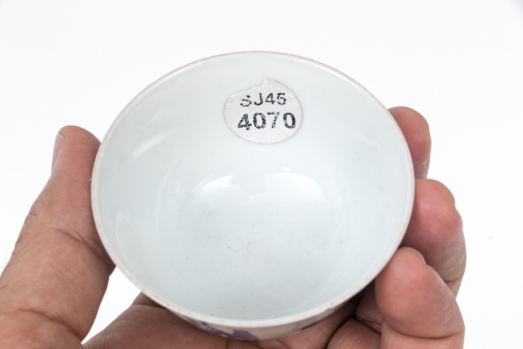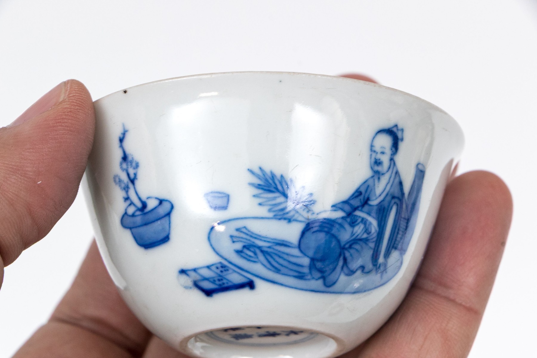 - A Chinese underglaze blue and white porcelain tea bowl, with figural decoration and an apocryphal six character Yongzheng, Qing dynasty reign mark but not of the period. 20th C.