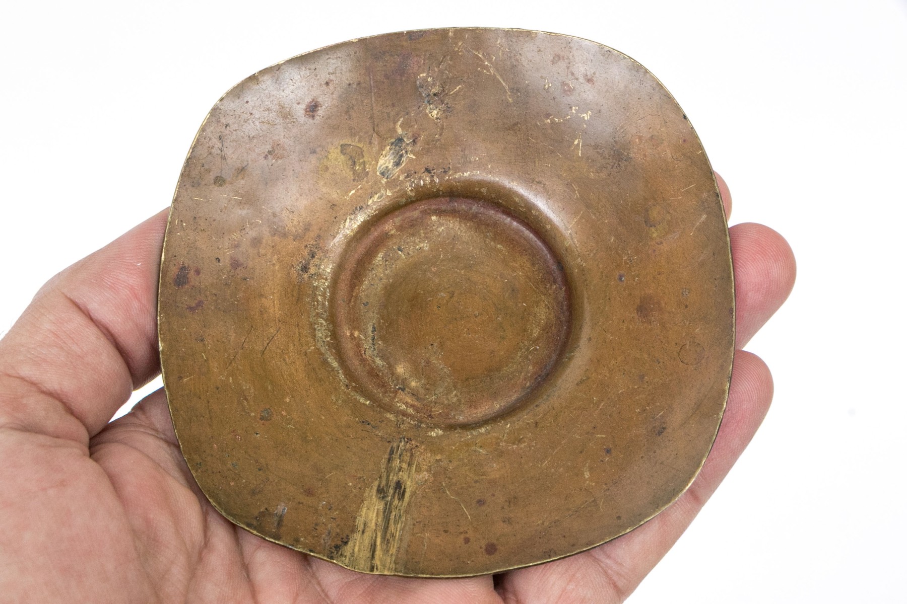 - A brass square form saucer tray with bronzed patina, sporting a decorative calligraphic mark underfoot.