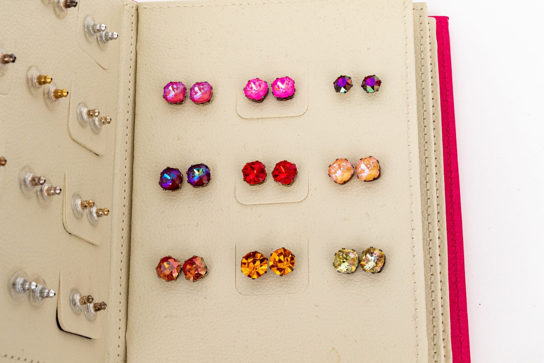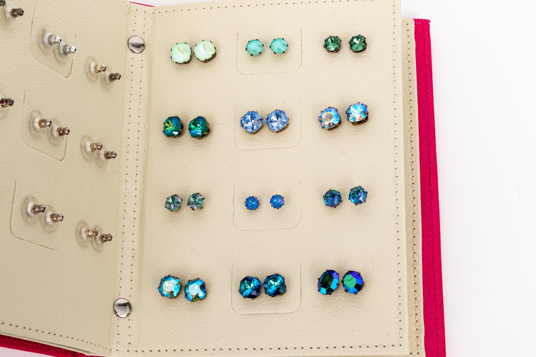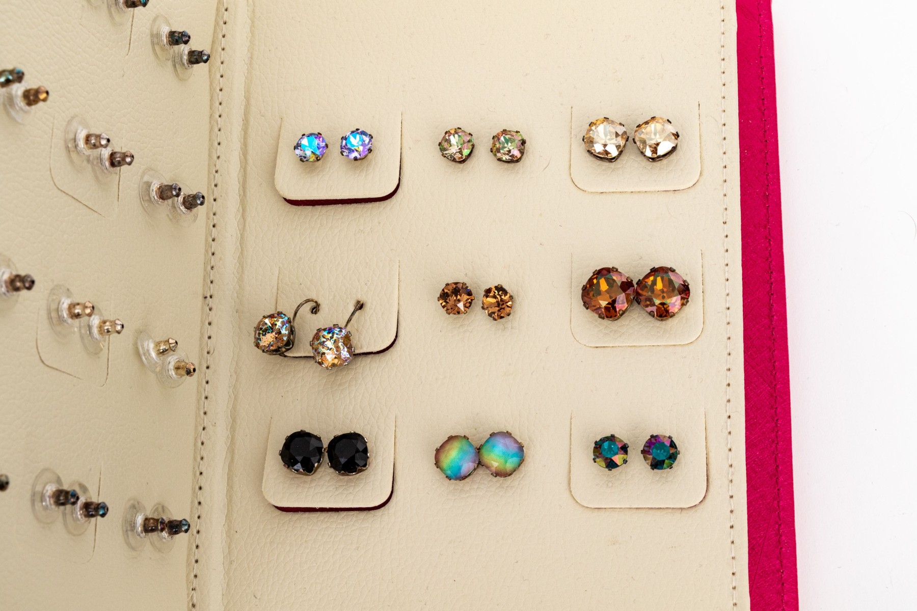 Colorful collection of bejewelled costume jewelry stud earrings, plus one wire and lever back, set with sterling silver posts. Most are displayed in an earrings album.