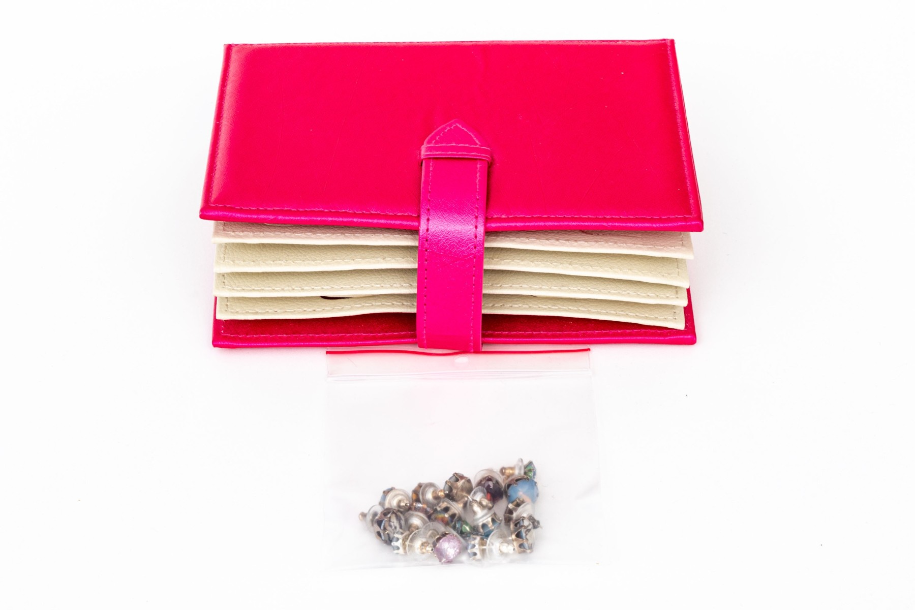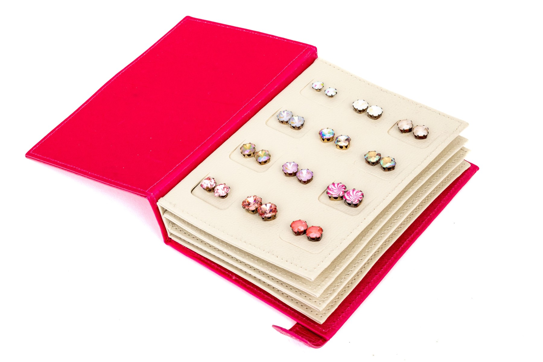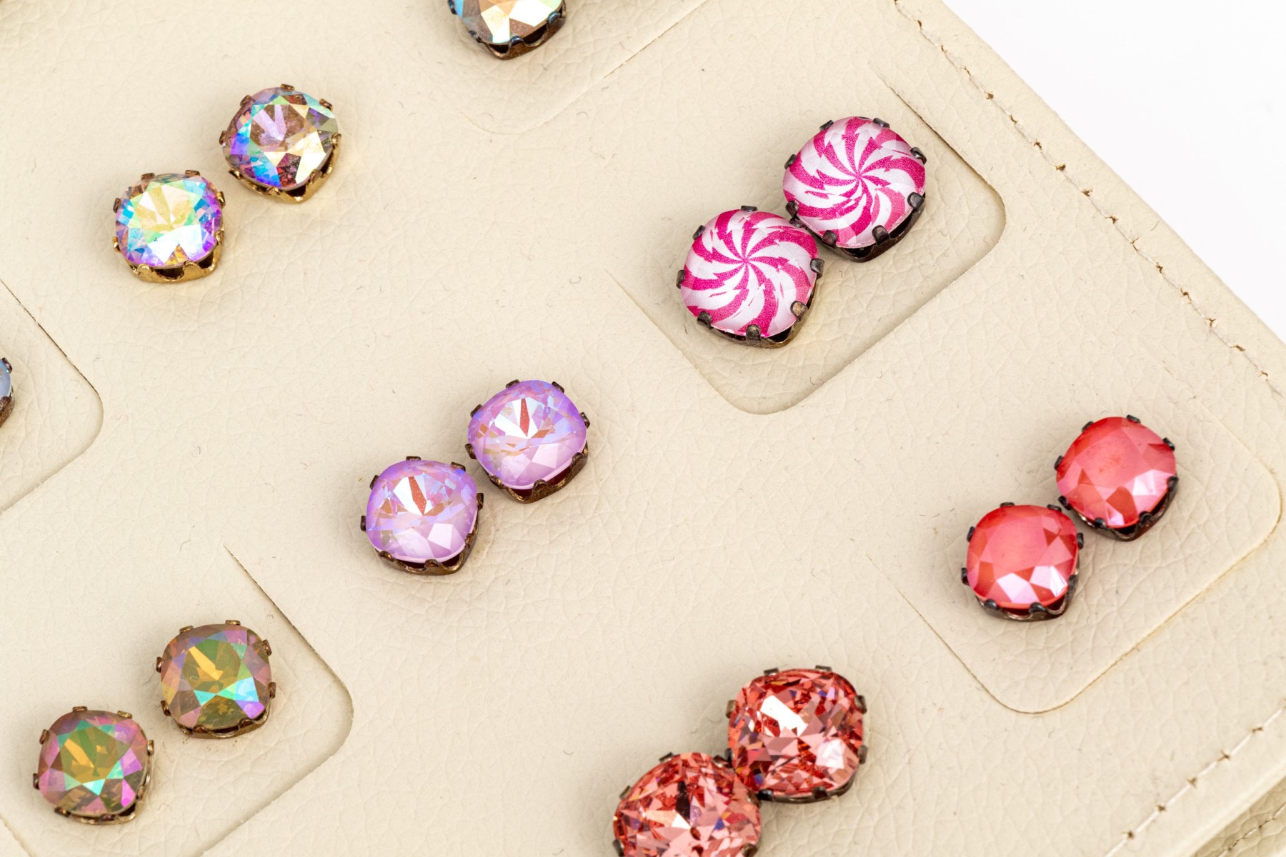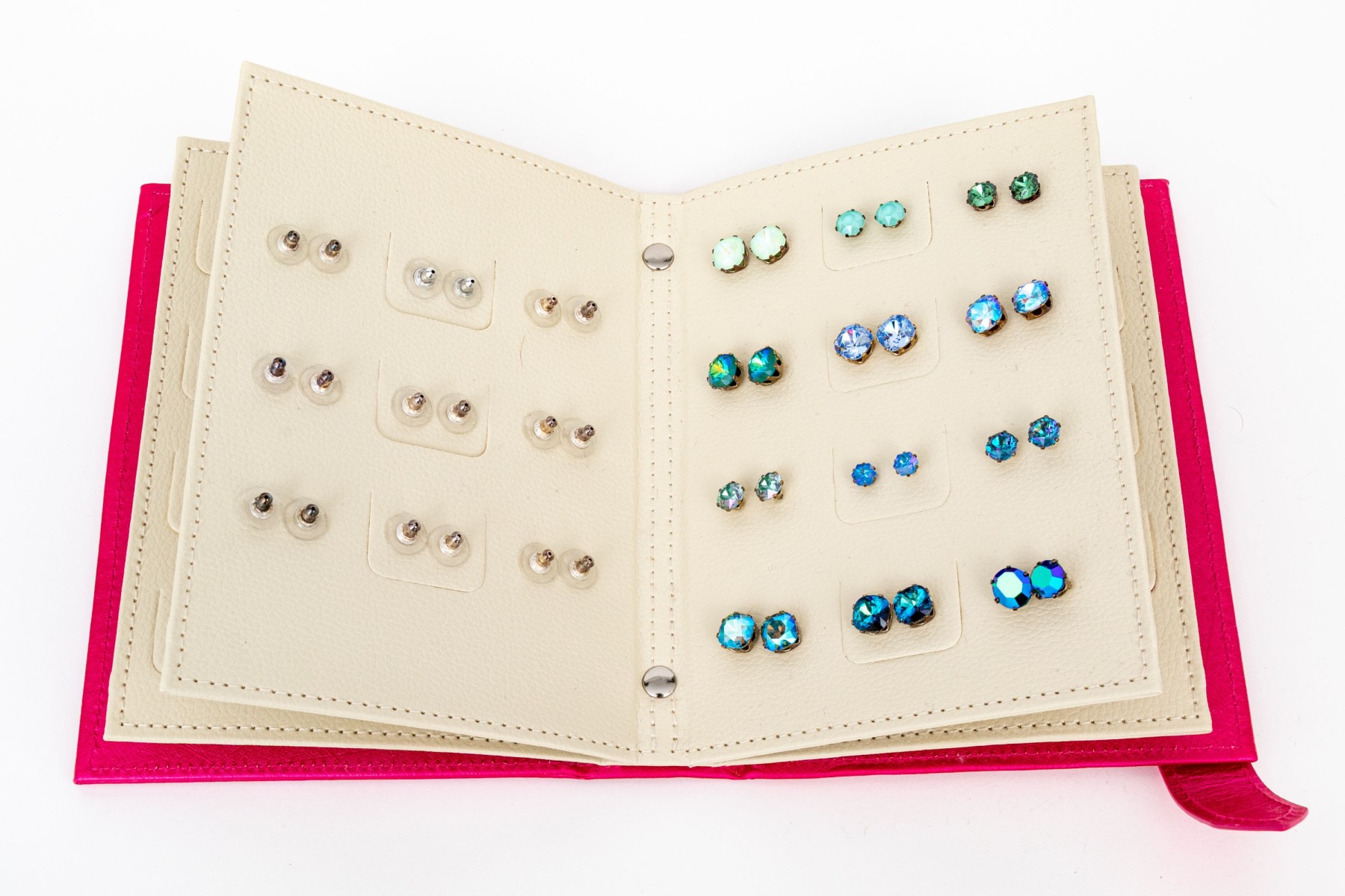 Colorful collection of bejewelled costume jewelry stud earrings, plus one wire and lever back, set with sterling silver posts. Most are displayed in an earrings album.