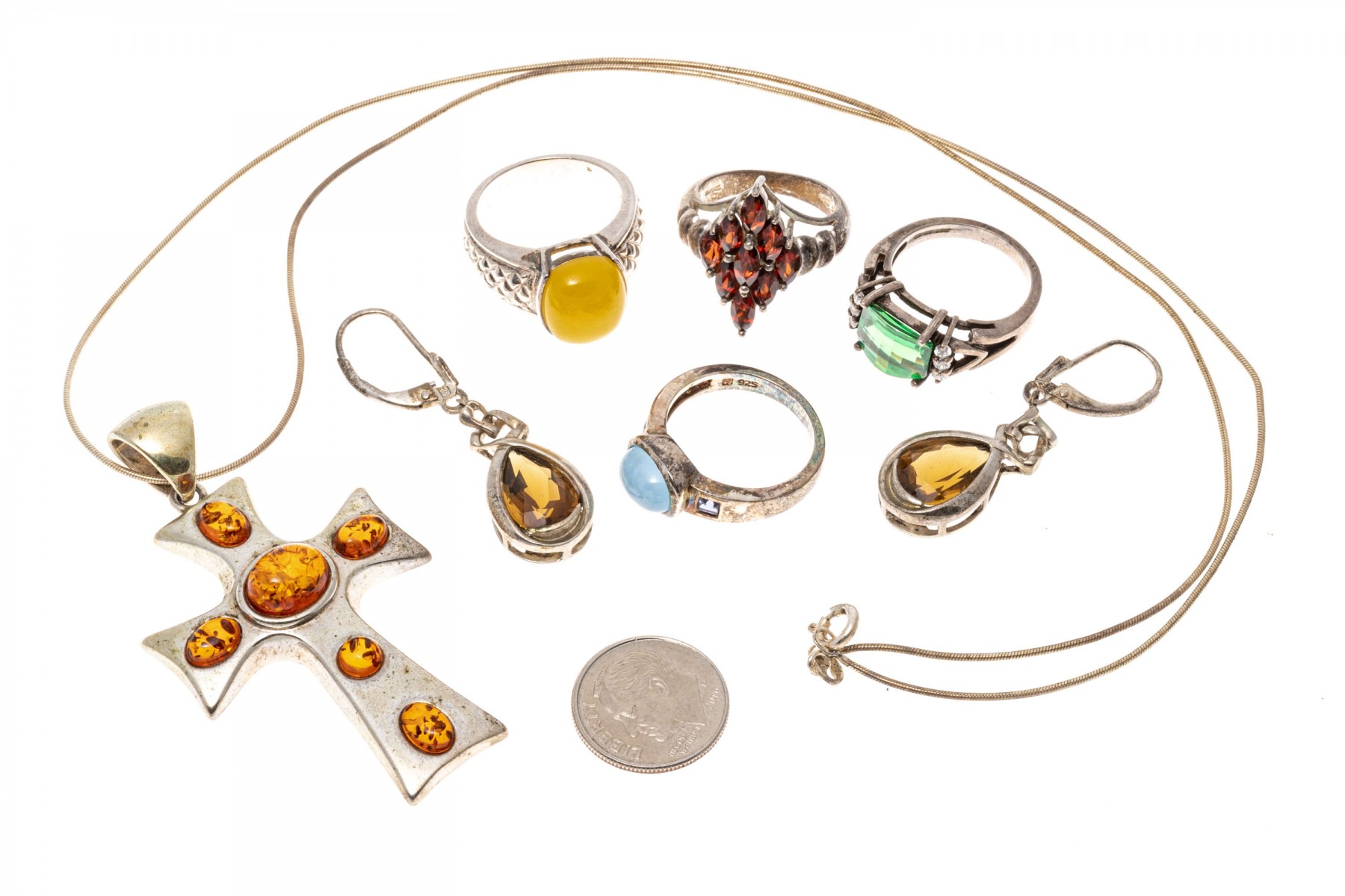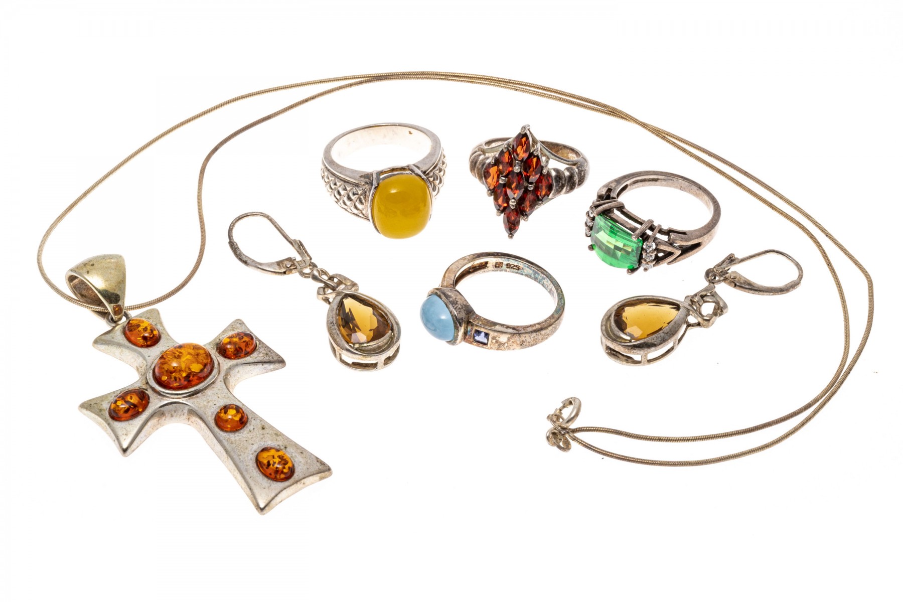 A collection of sterling silver jewelry. Four gemstone rings with garnets, Siberian green quarts with cubic zirconia, blue and yellow chalcodney. A pair of citrine pendant earrings and a necklace with amber set cross pendant.