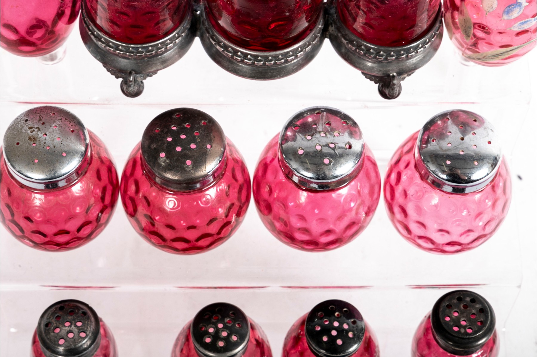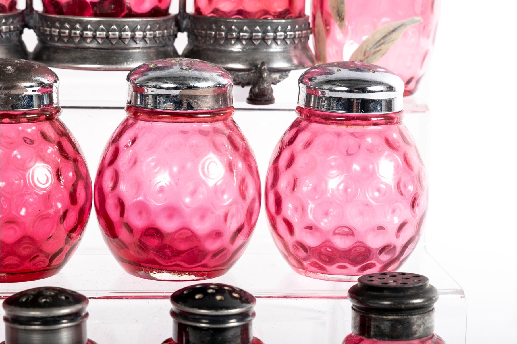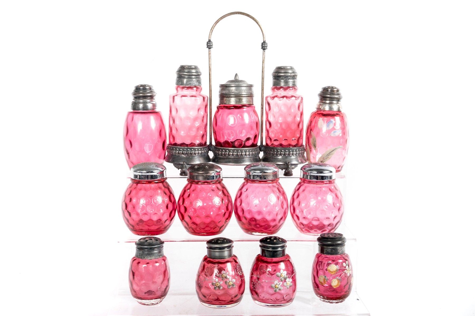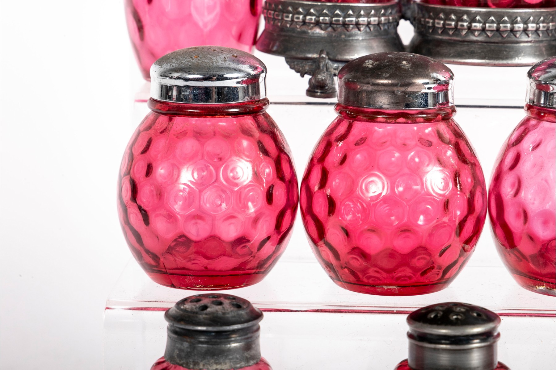 A wonderful assortment of coin patterned cranberry glass salt and pepper shakers, including a cruet set on a silverplated stand.