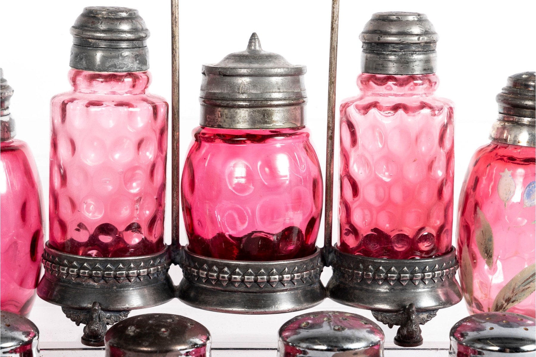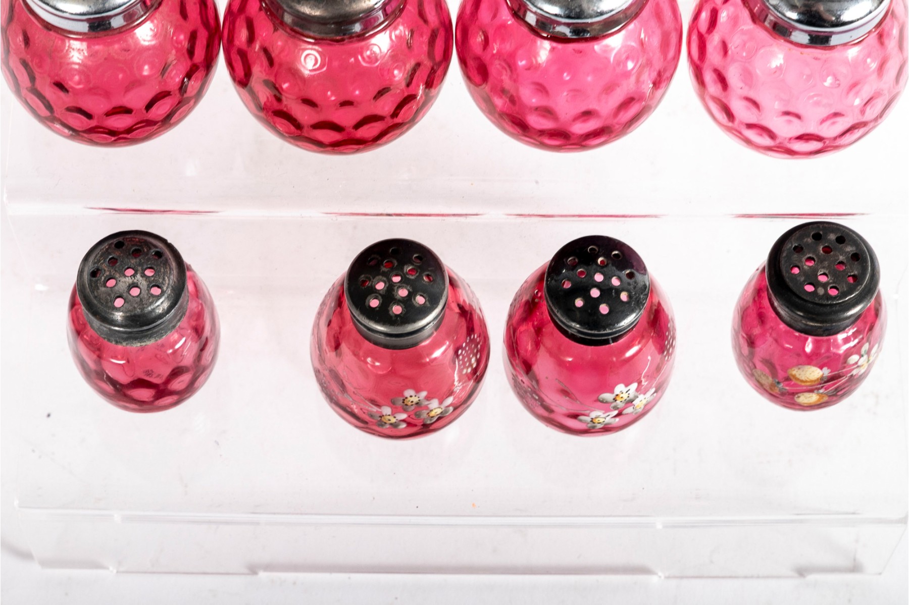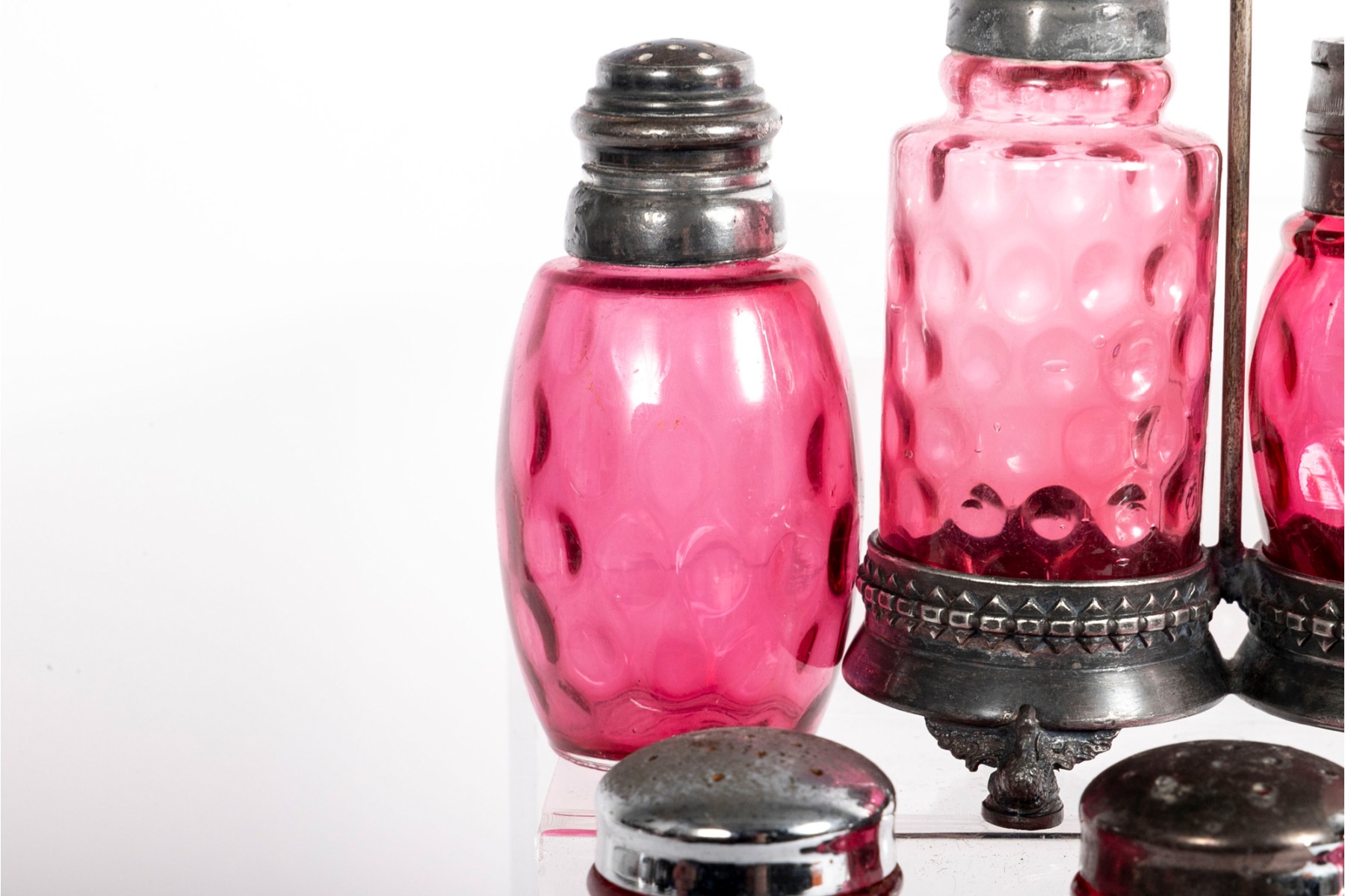 A wonderful assortment of coin patterned cranberry glass salt and pepper shakers, including a cruet set on a silverplated stand.