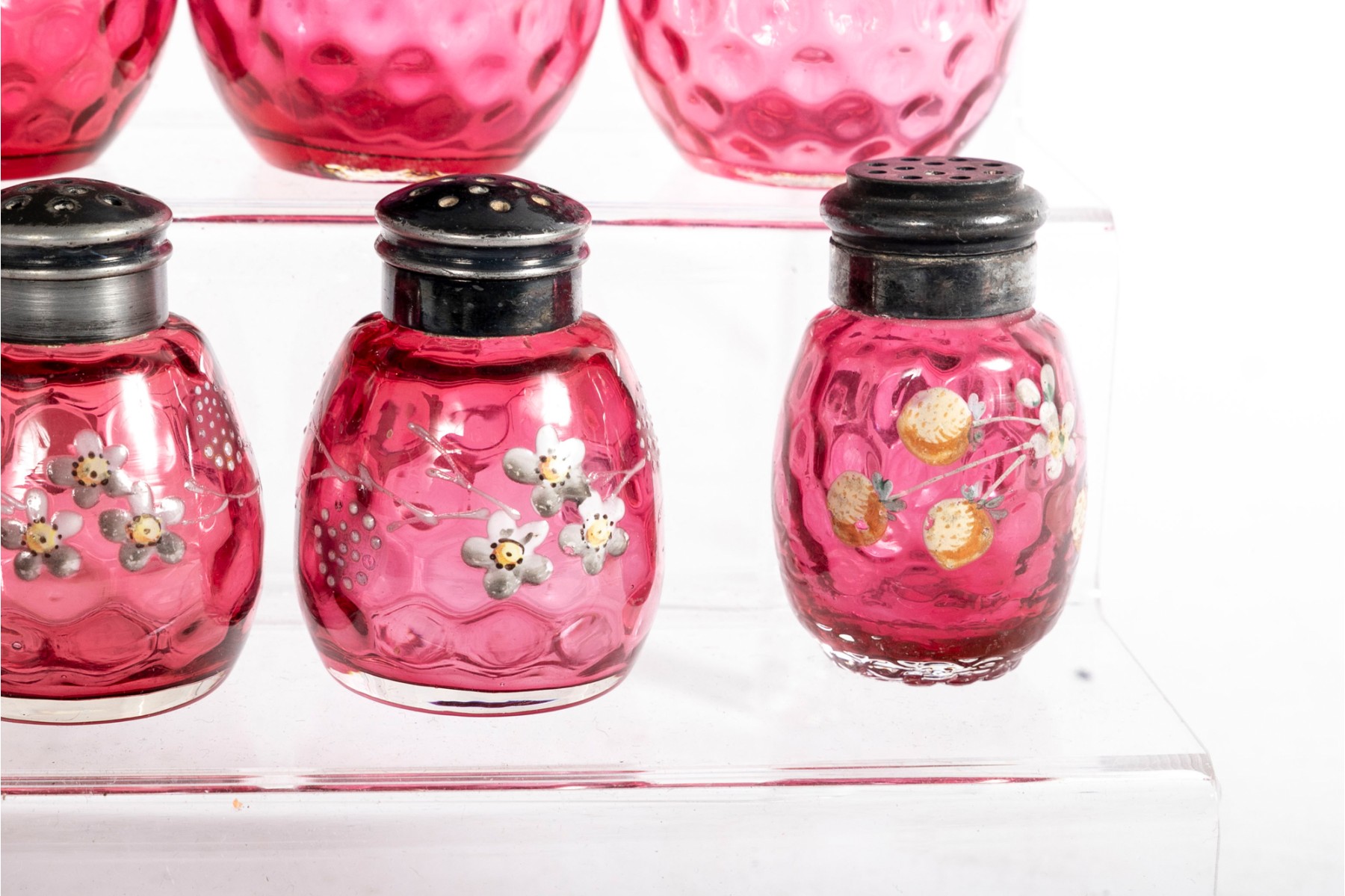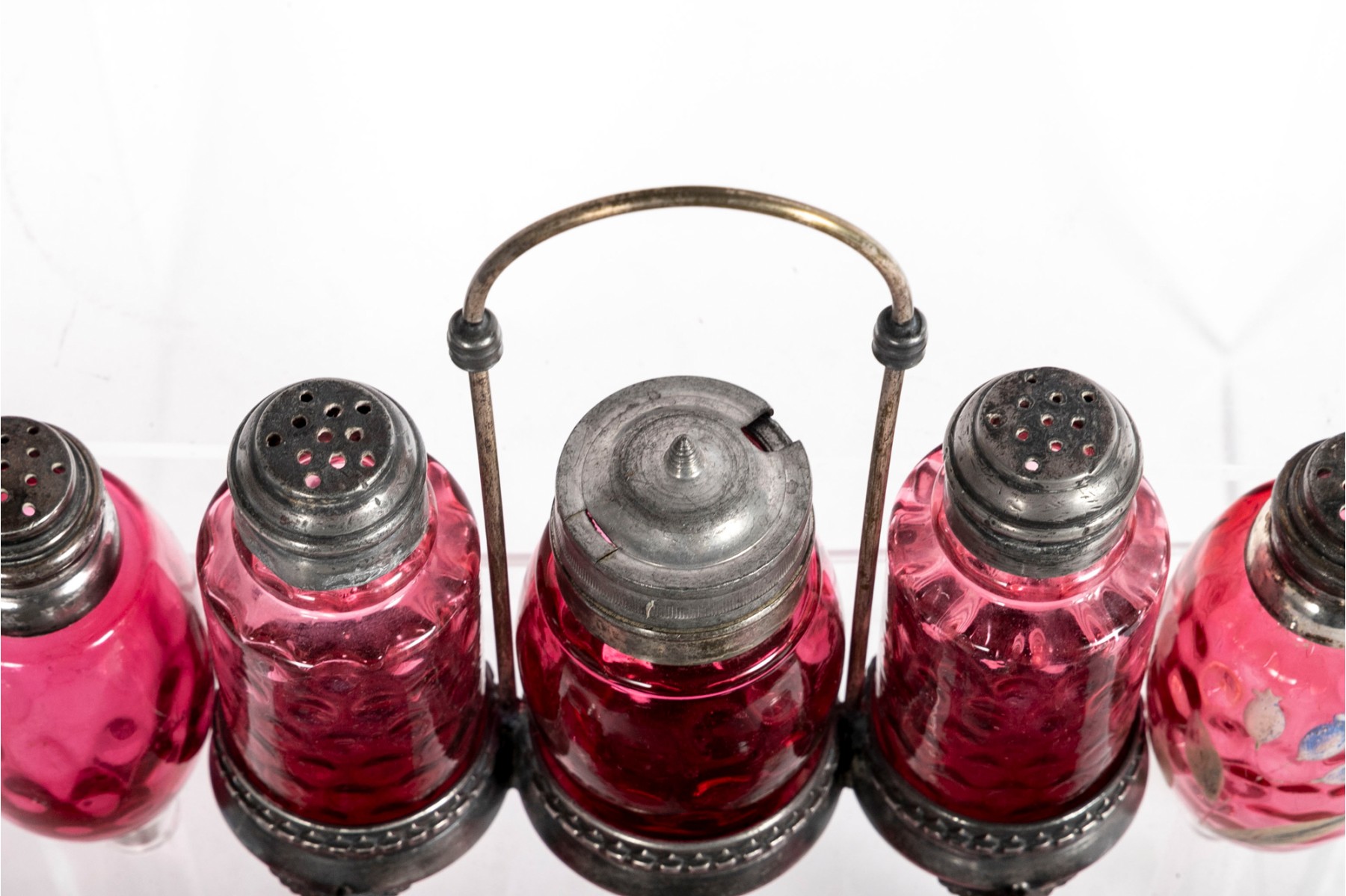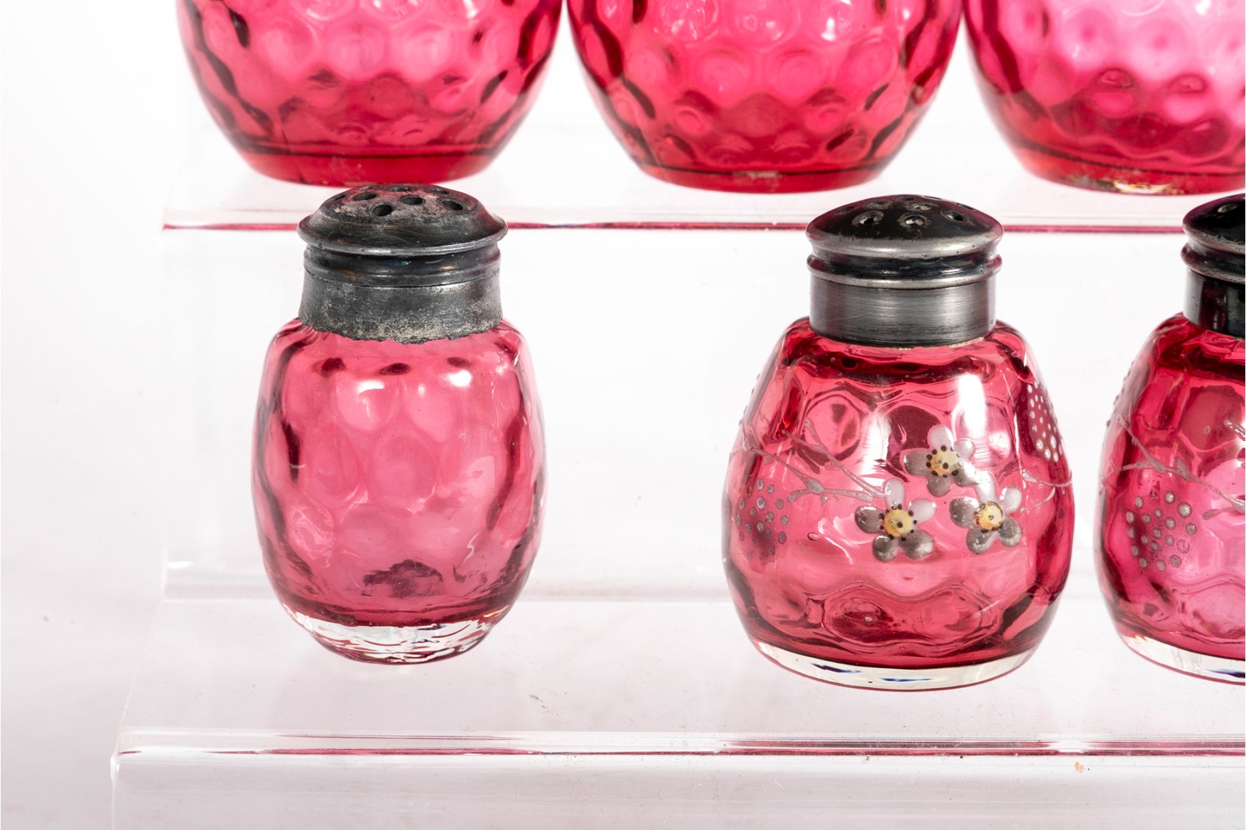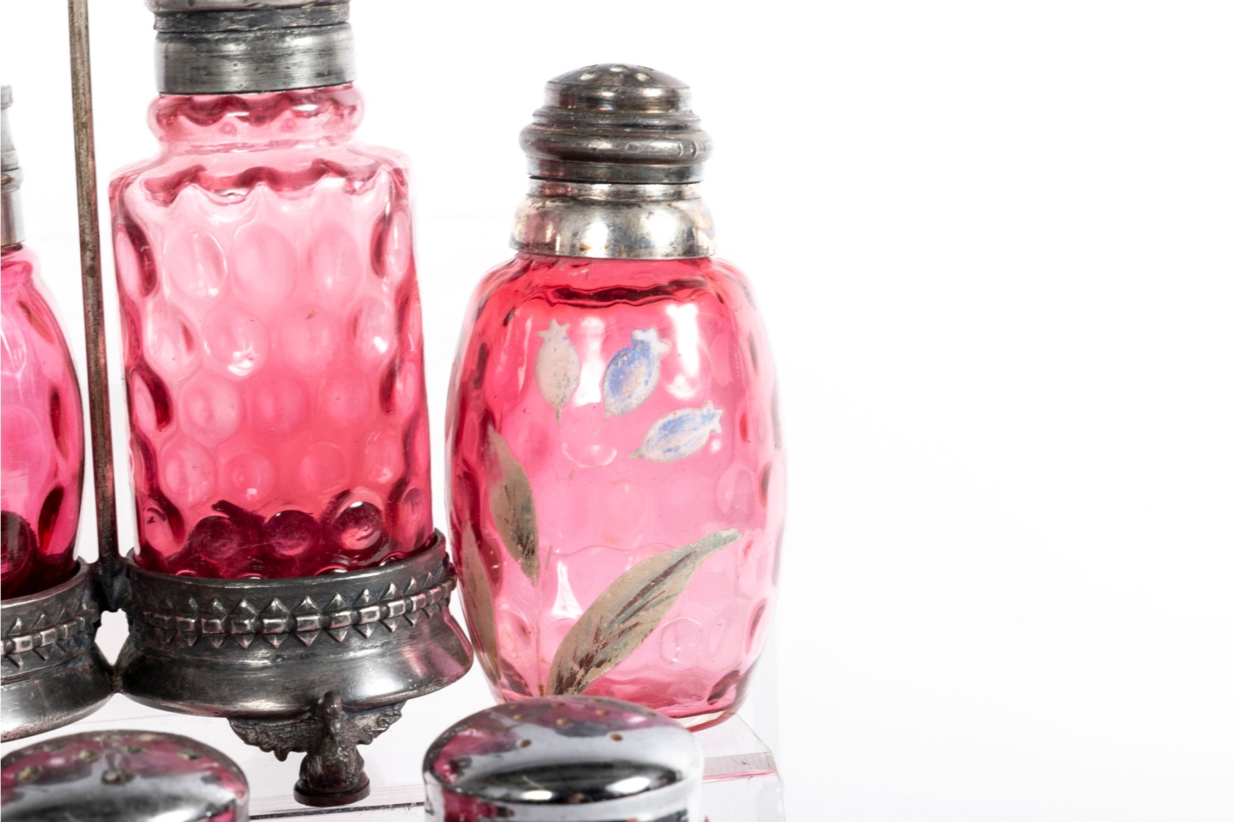 A wonderful assortment of coin patterned cranberry glass salt and pepper shakers, including a cruet set on a silverplated stand.
