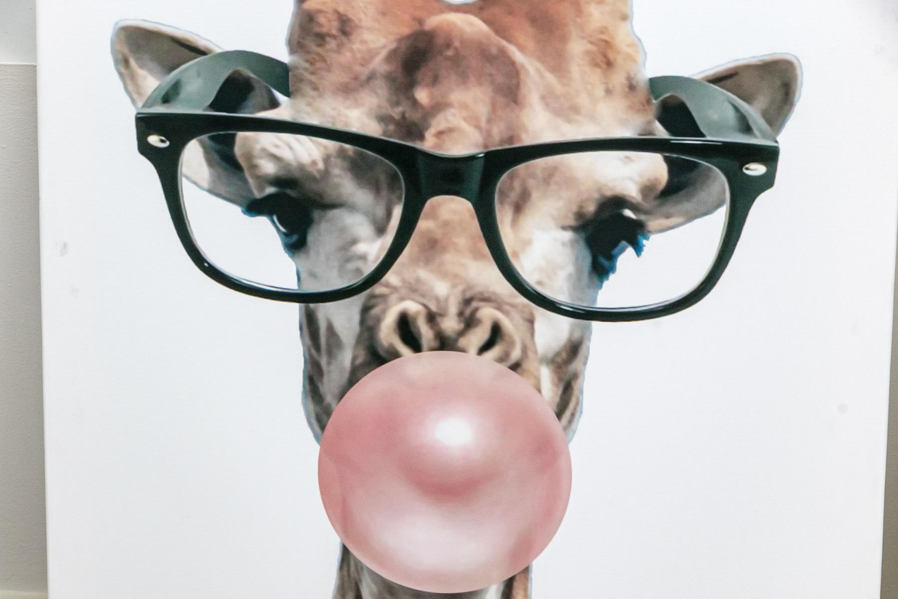 Comprised of four prints mounted on stretcher supports. Including one of a portrait bust of giraffe with glasses blowing bubble gum, together with three printed maps on canvas.