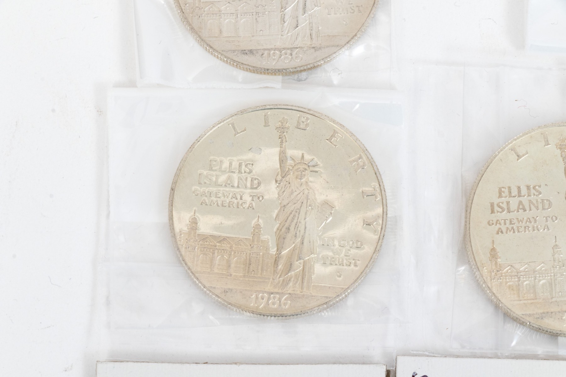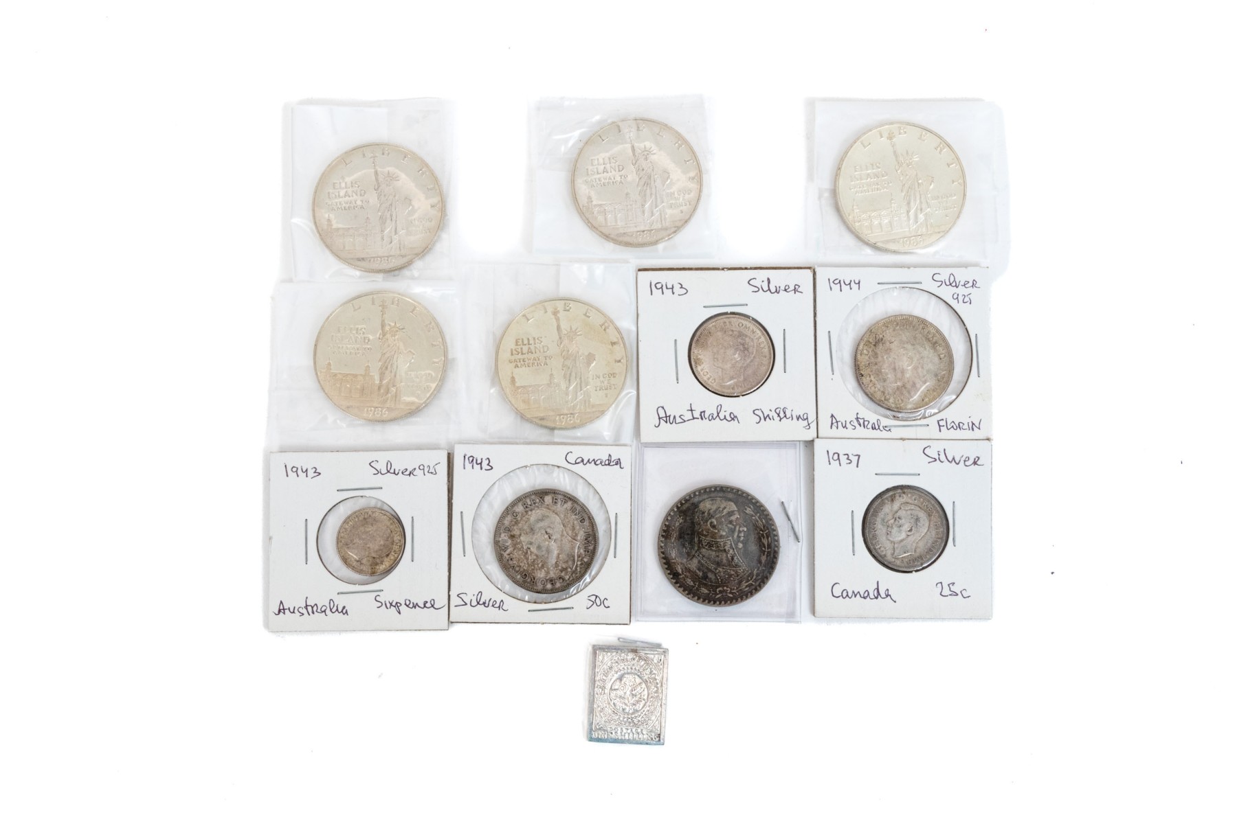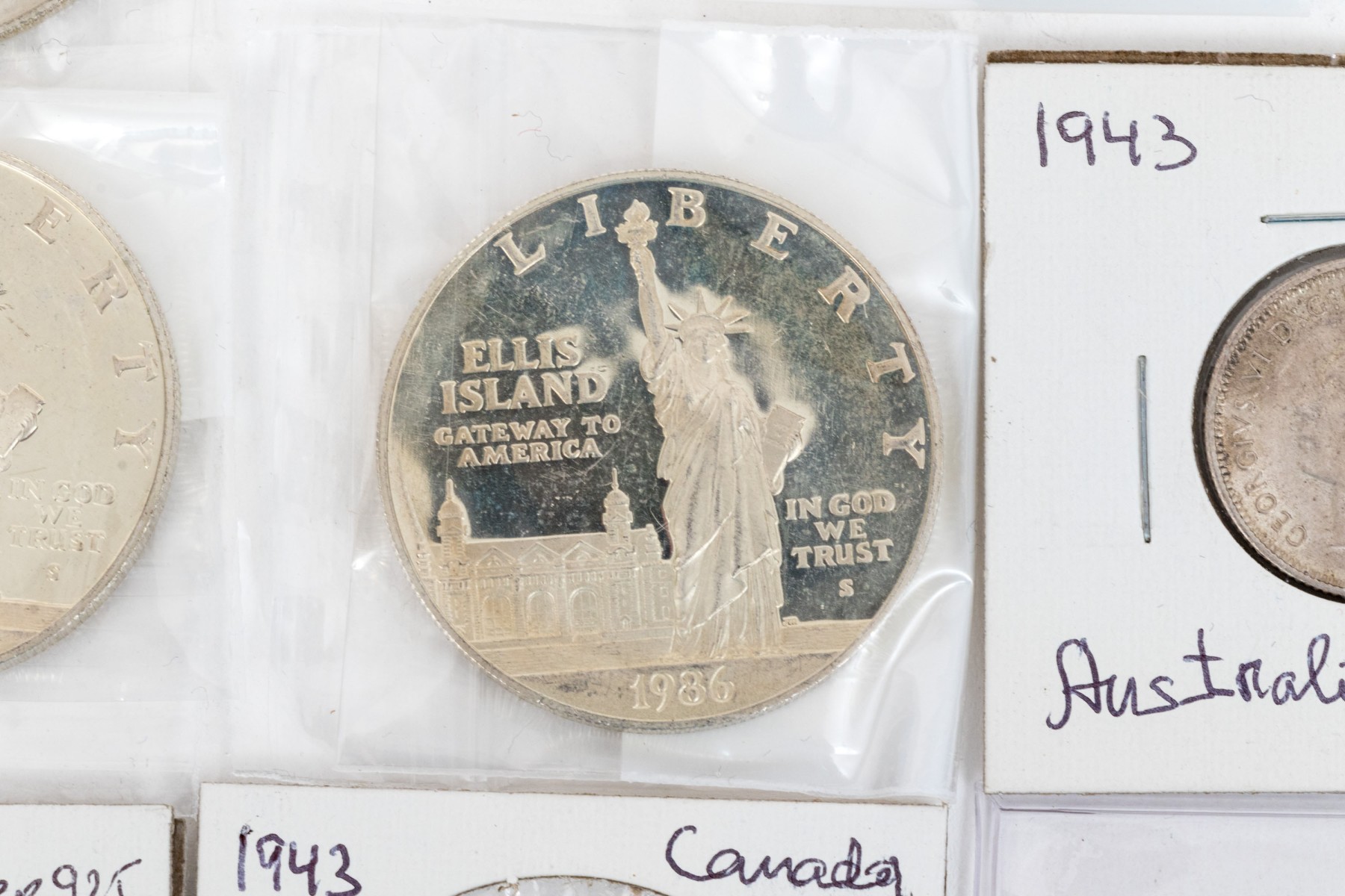 Collection of five United States Ellis Island commemorative coins, six international coins and a sterling silver commemorative stamp.