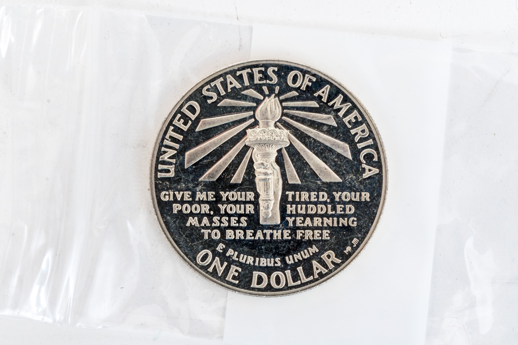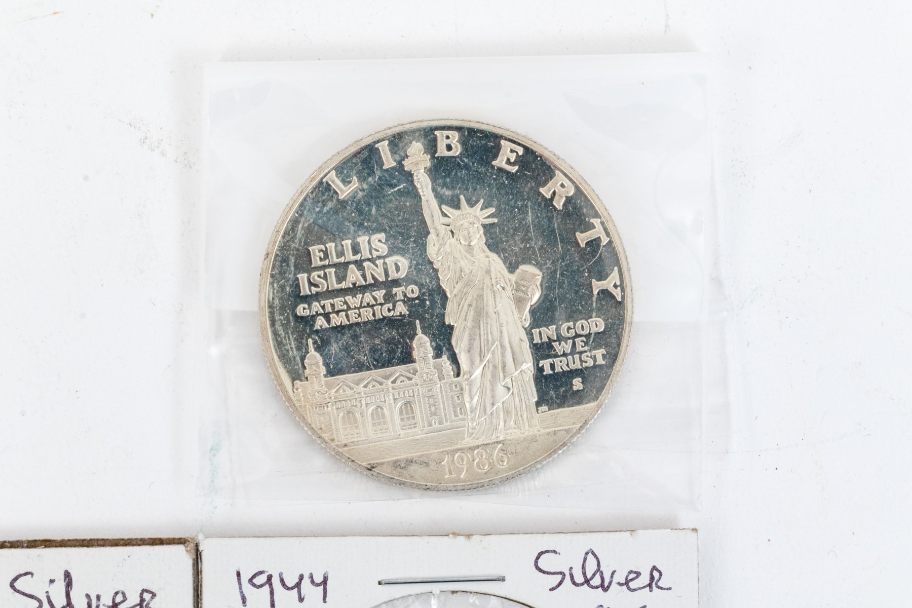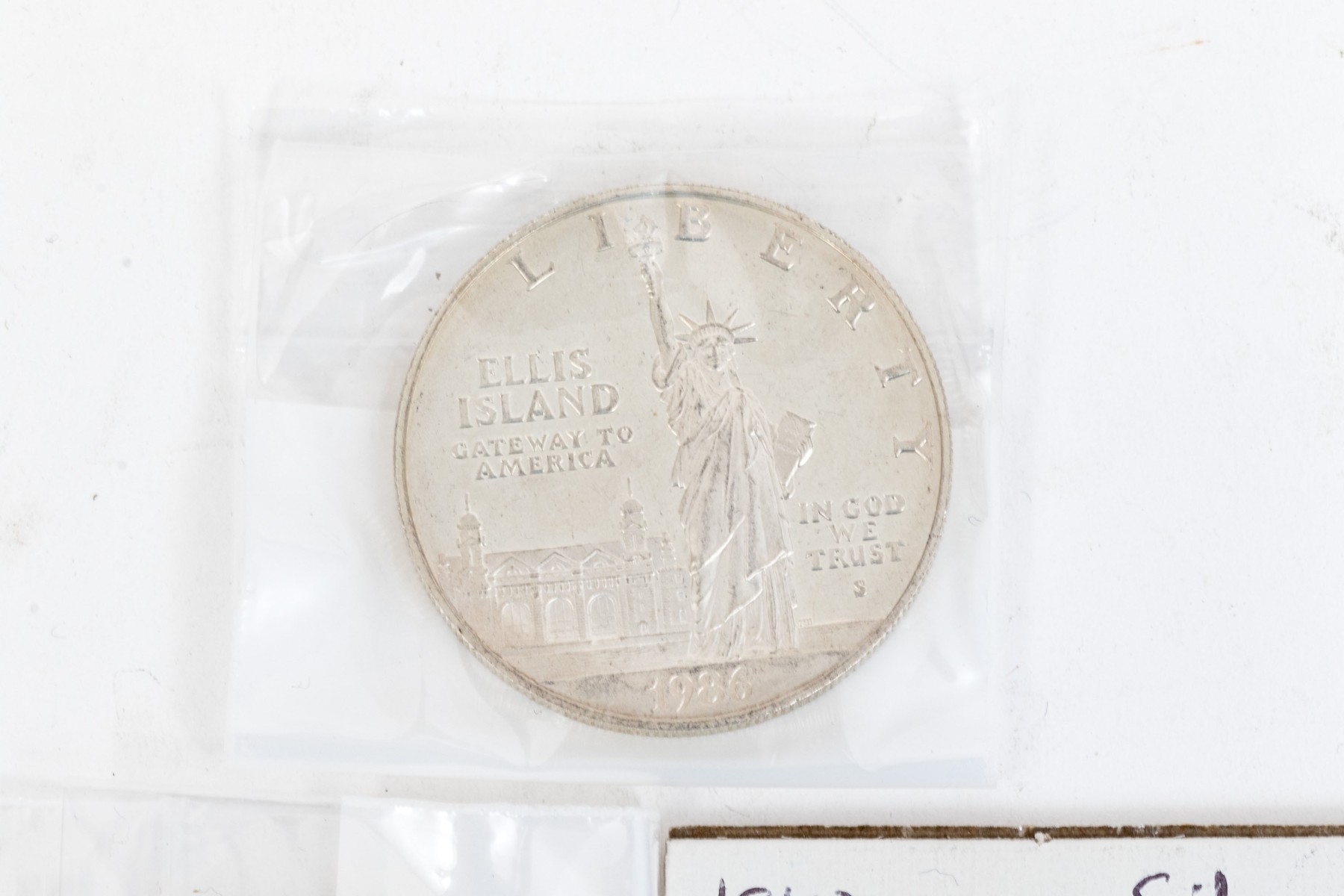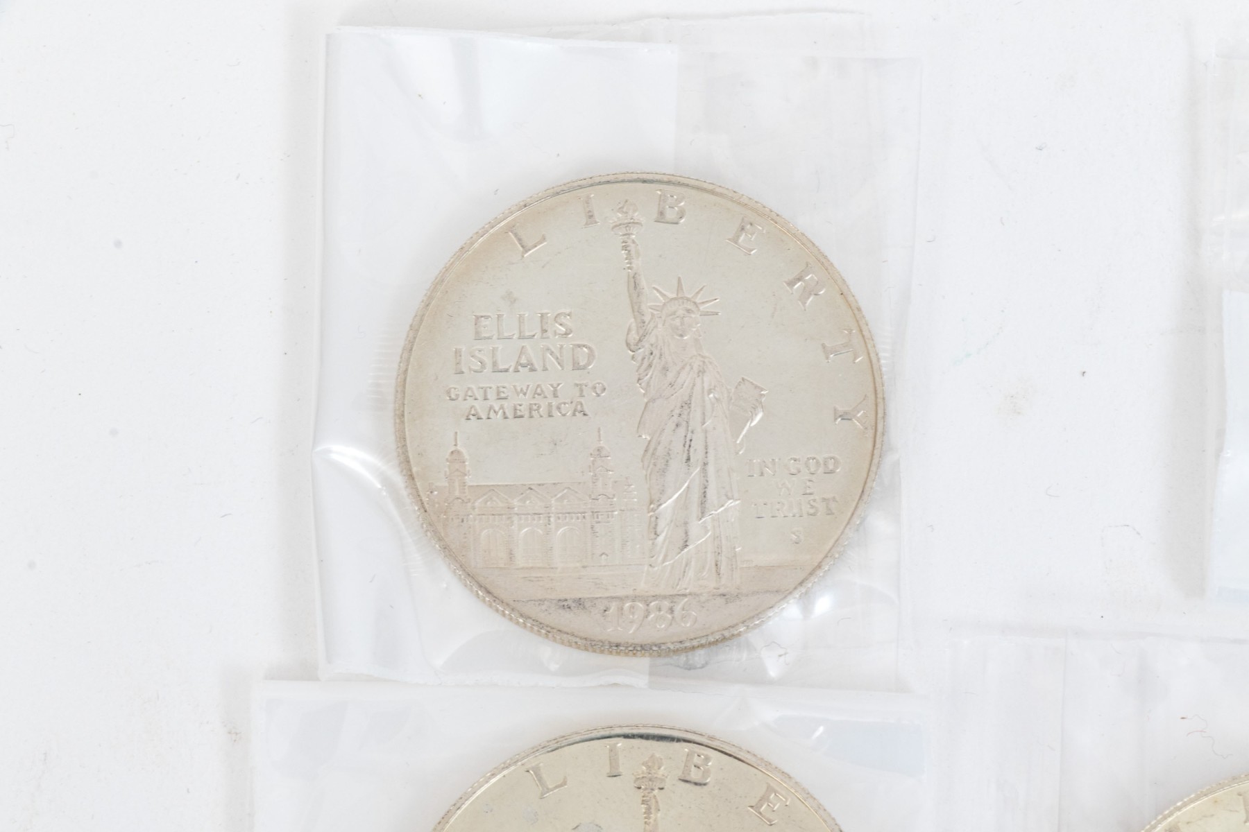 Collection of five United States Ellis Island commemorative coins, six international coins and a sterling silver commemorative stamp.