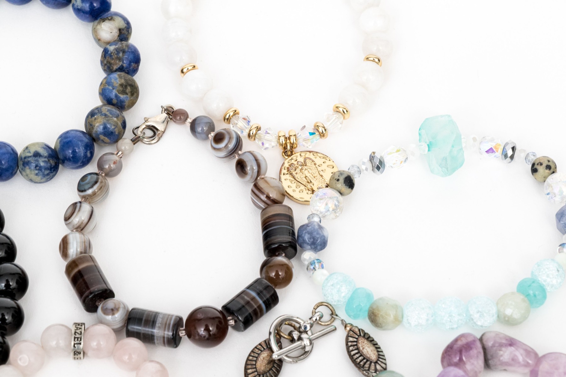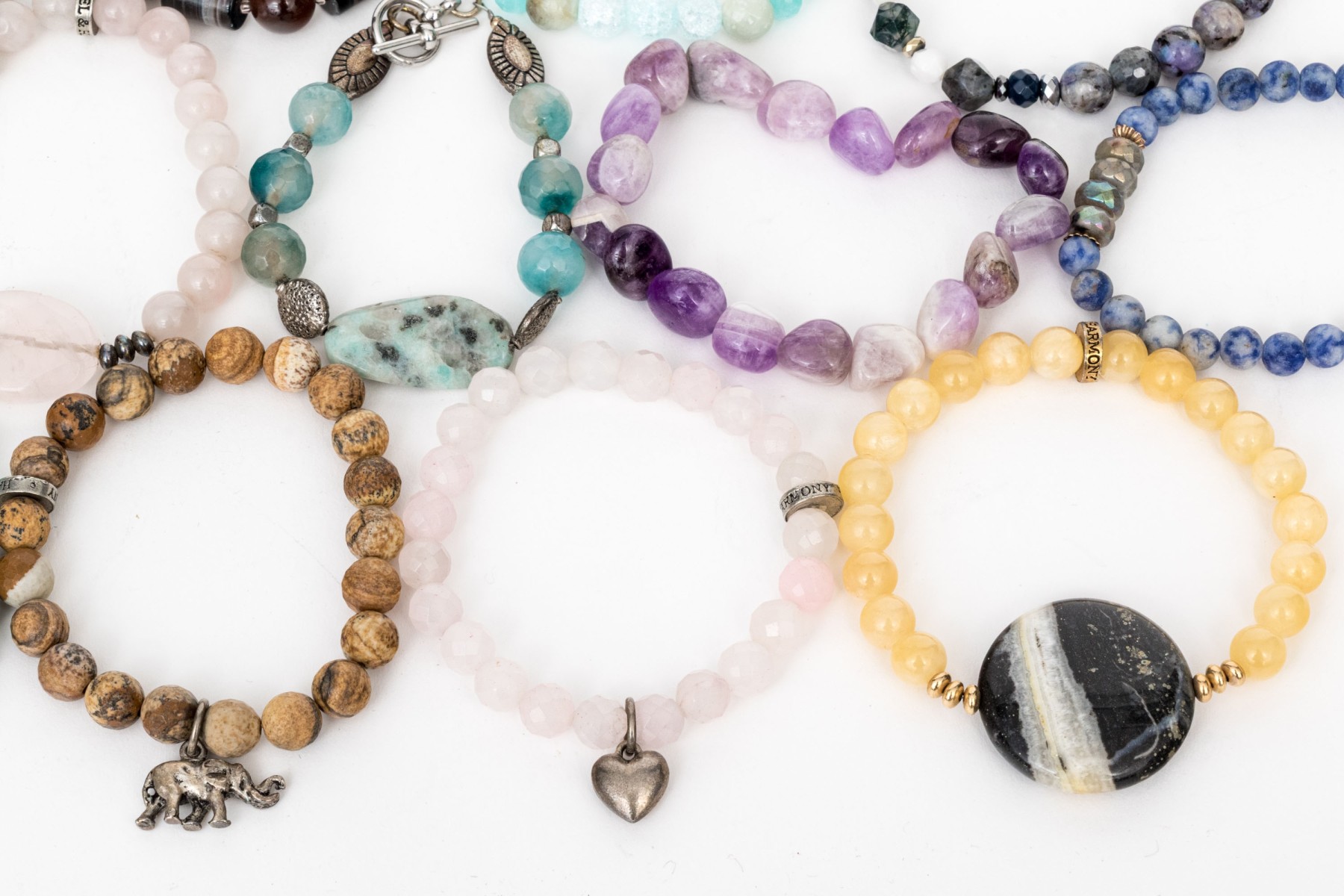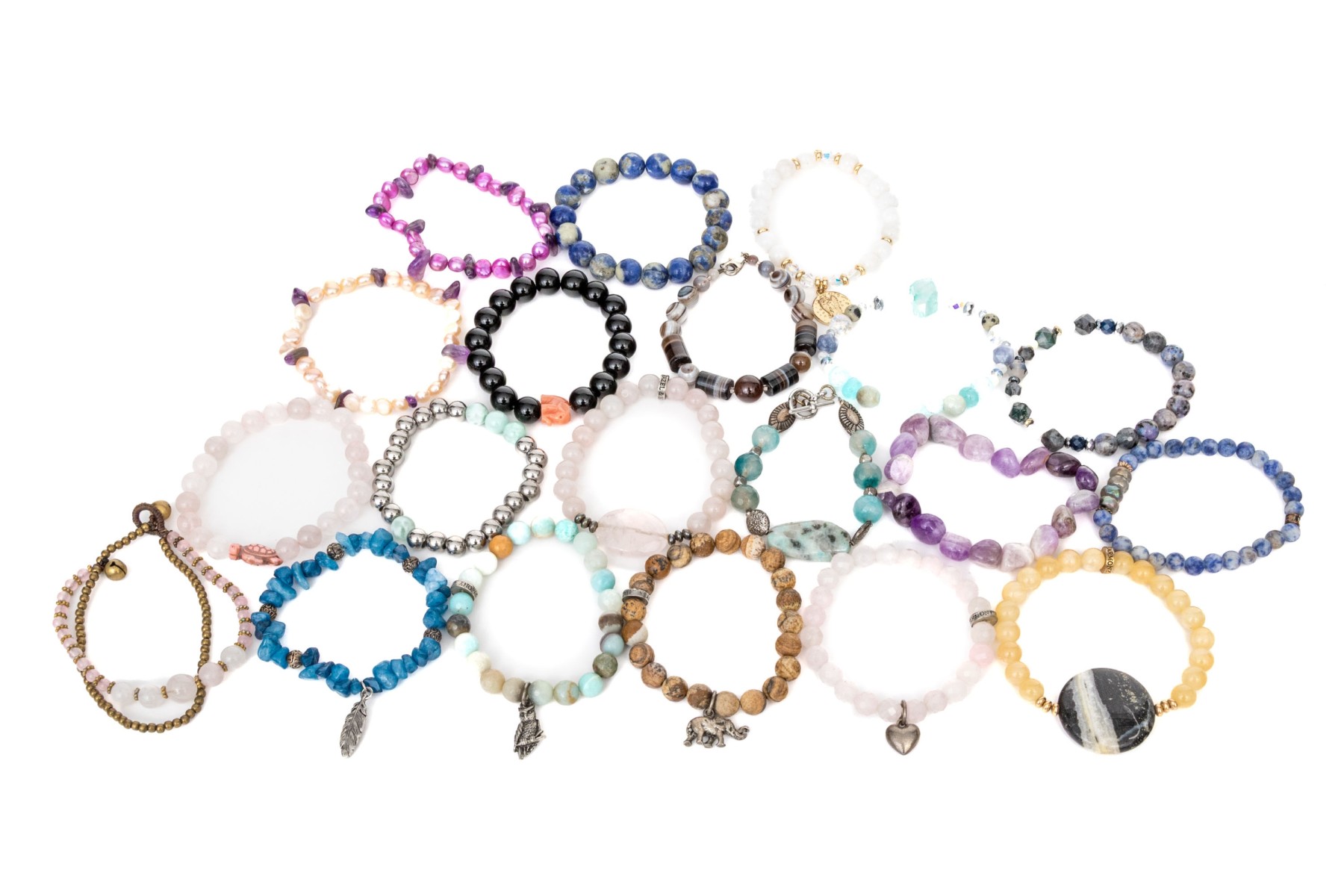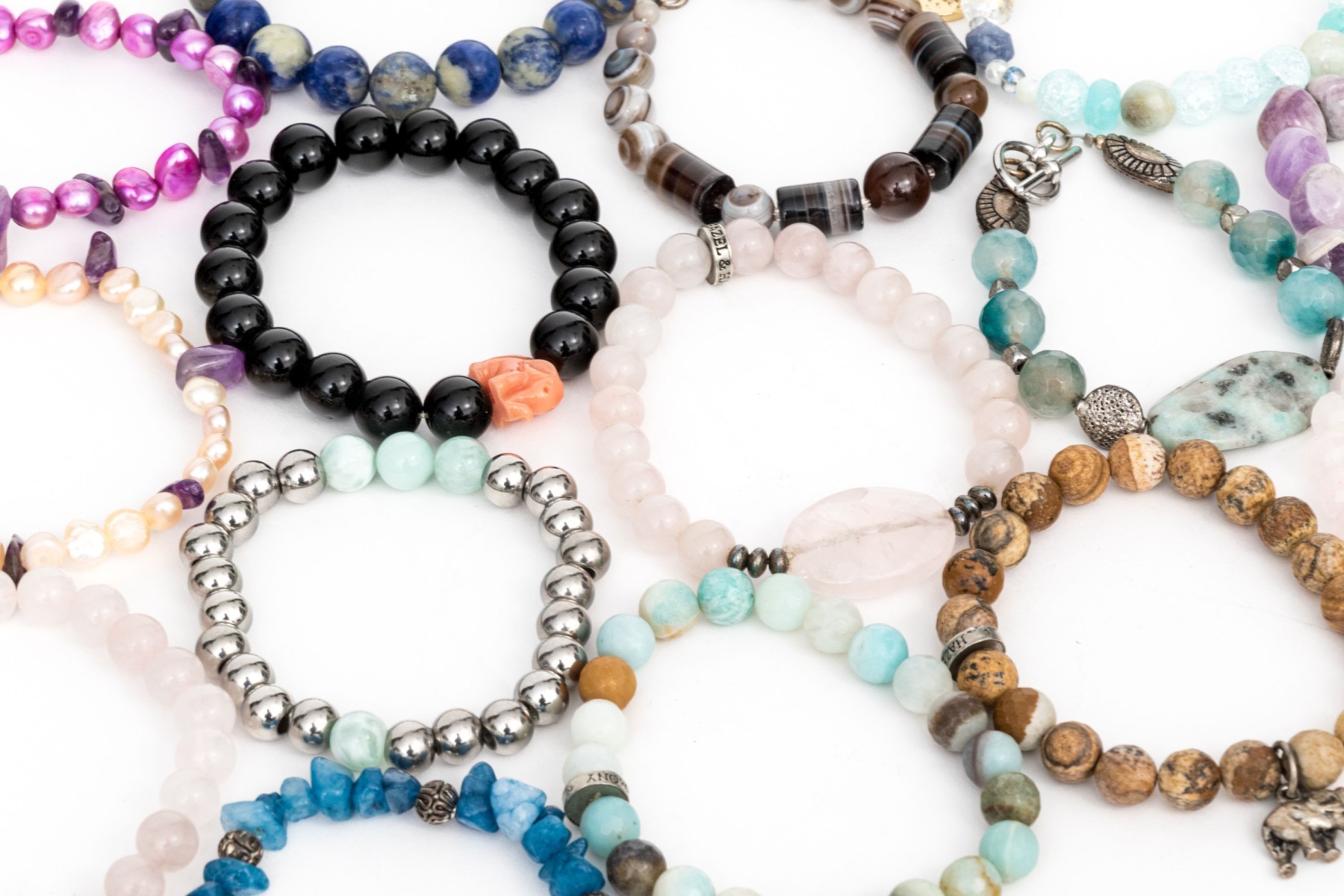 Collection of stretch and link stone bead and cultured freshwater pearl bracelets that includes; one amethyst, one sodalite, one black onyx, one hematite, one labradorite, one dyed blue coral with labradorite, two cultured freshwater pearl, four rose quartz and eight quartz or agate beads (with glass, crystal or other beads also included also within the stones). Finished with toggle, lobster claw, and elastic or fishing wire.
