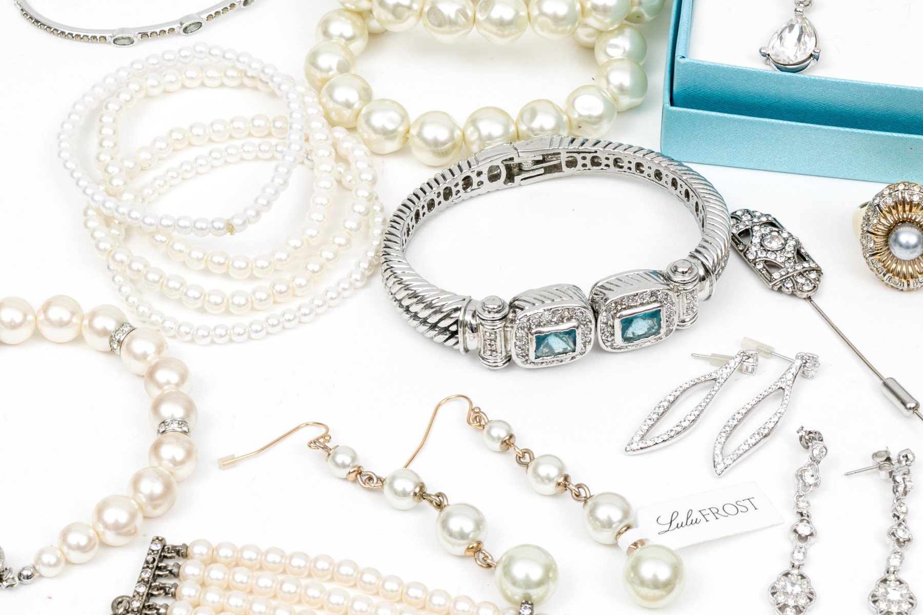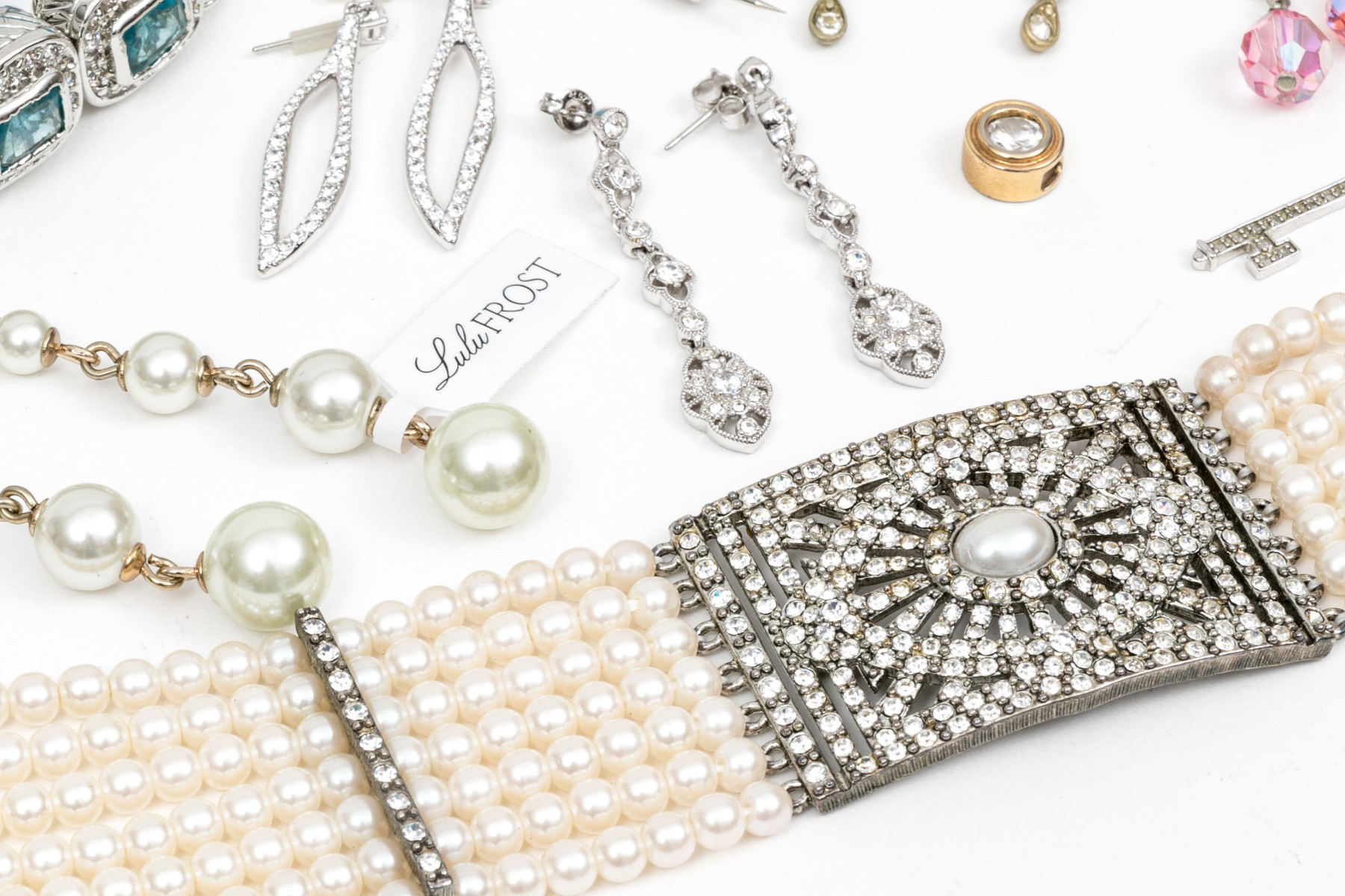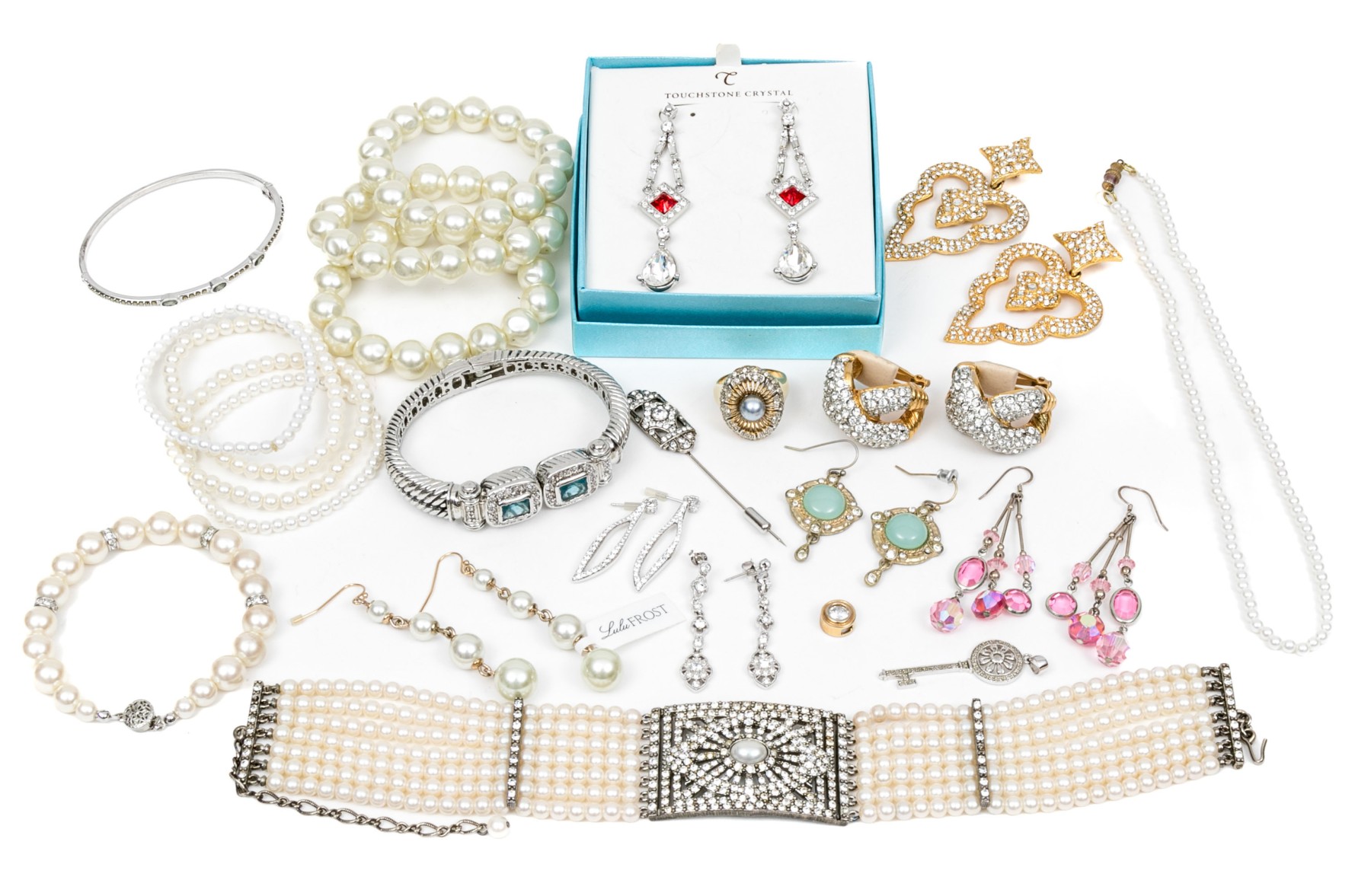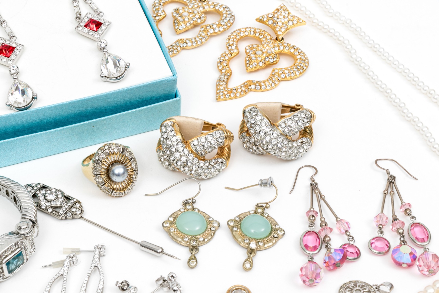 Collection of fashion jewelry including necklaces, bracelets, brooches, earrings and rings.