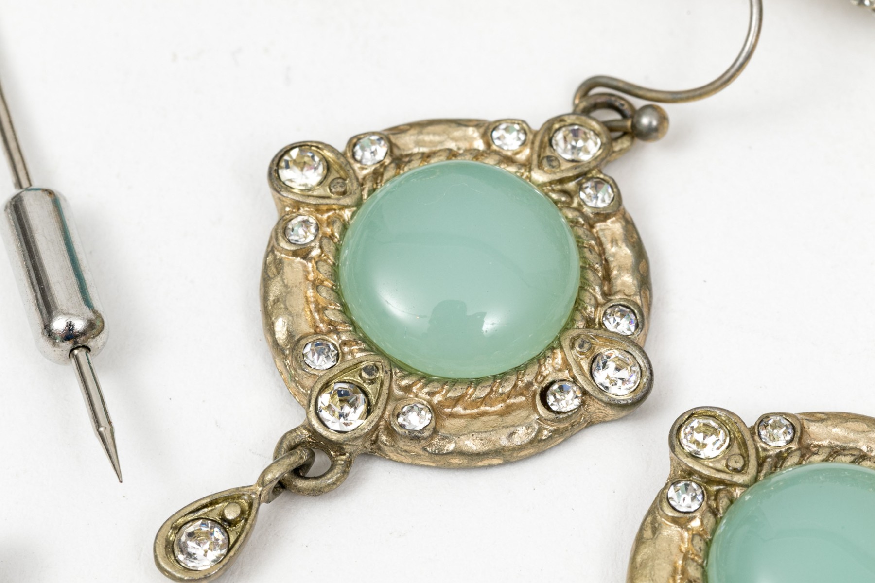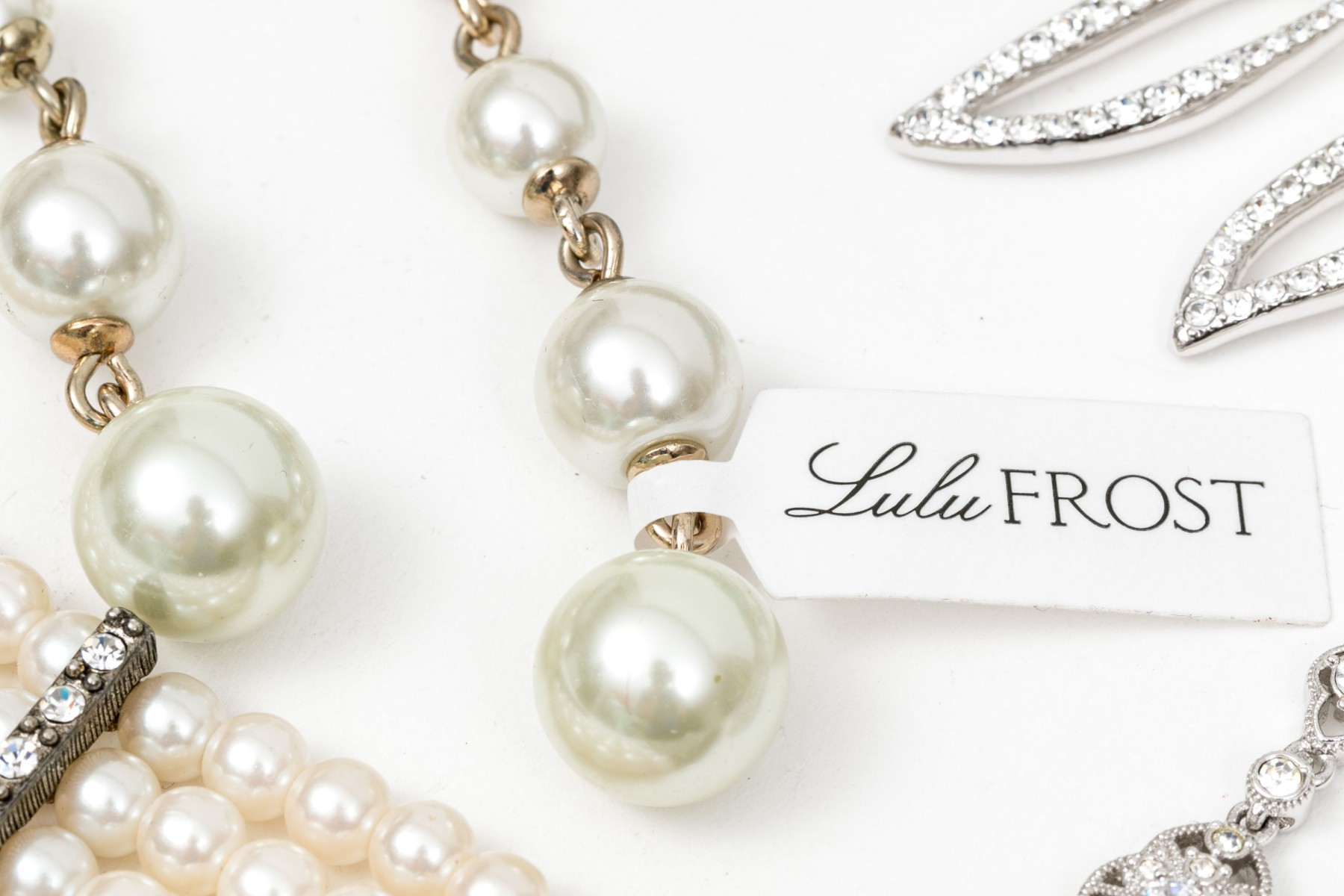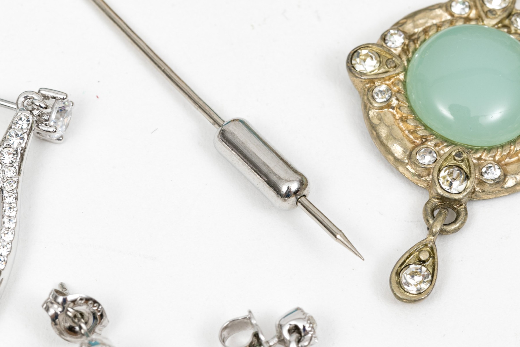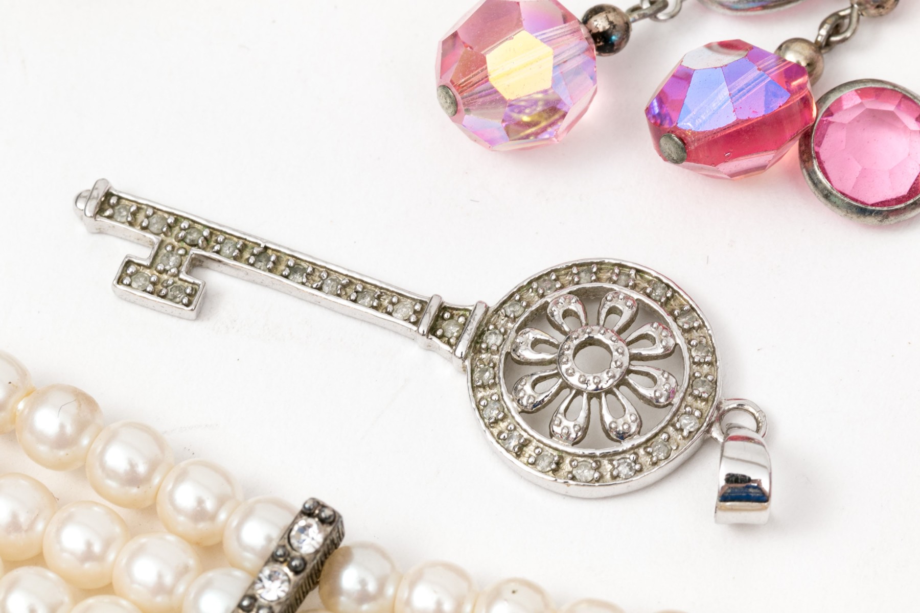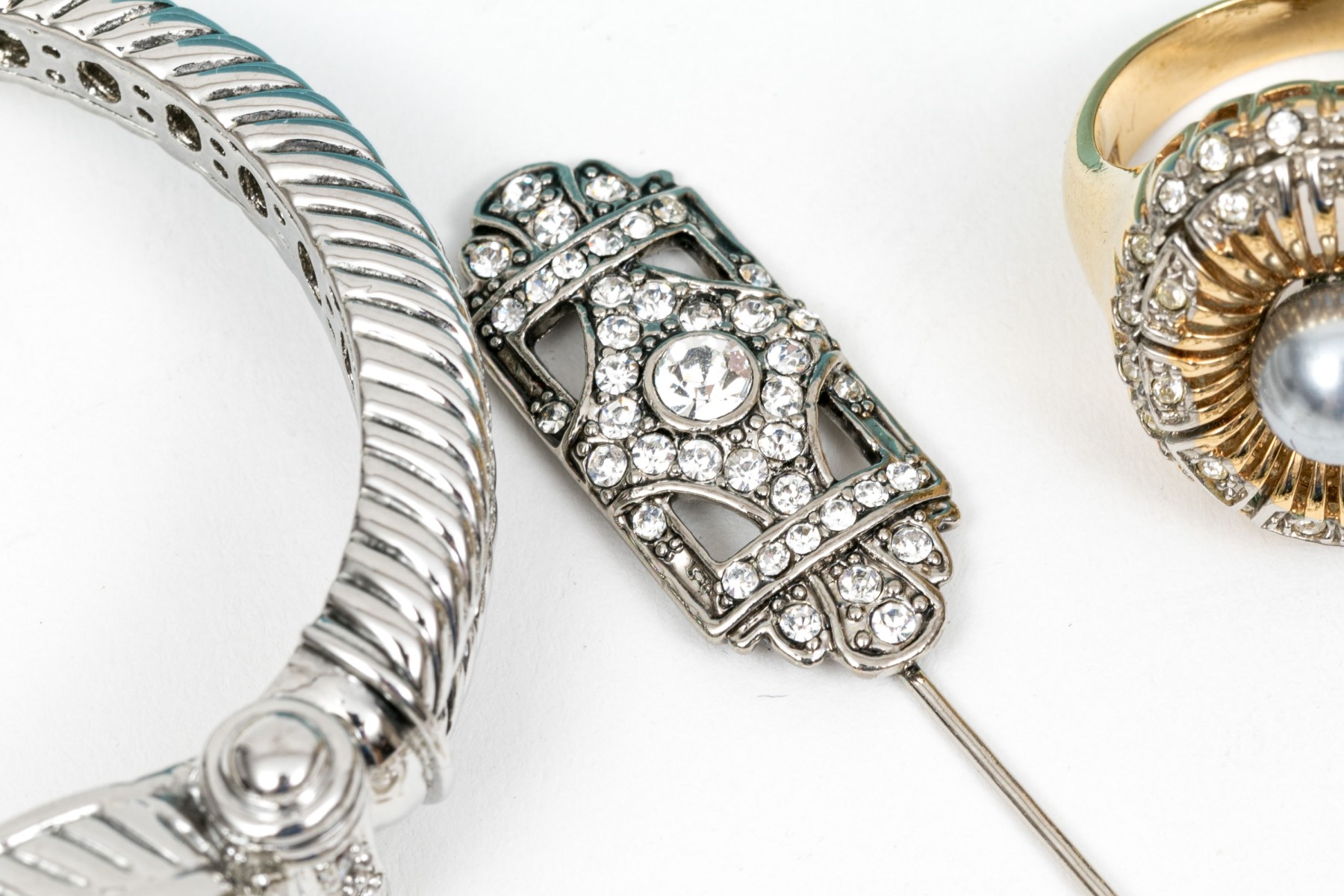 Collection of fashion jewelry including necklaces, bracelets, brooches, earrings and rings.