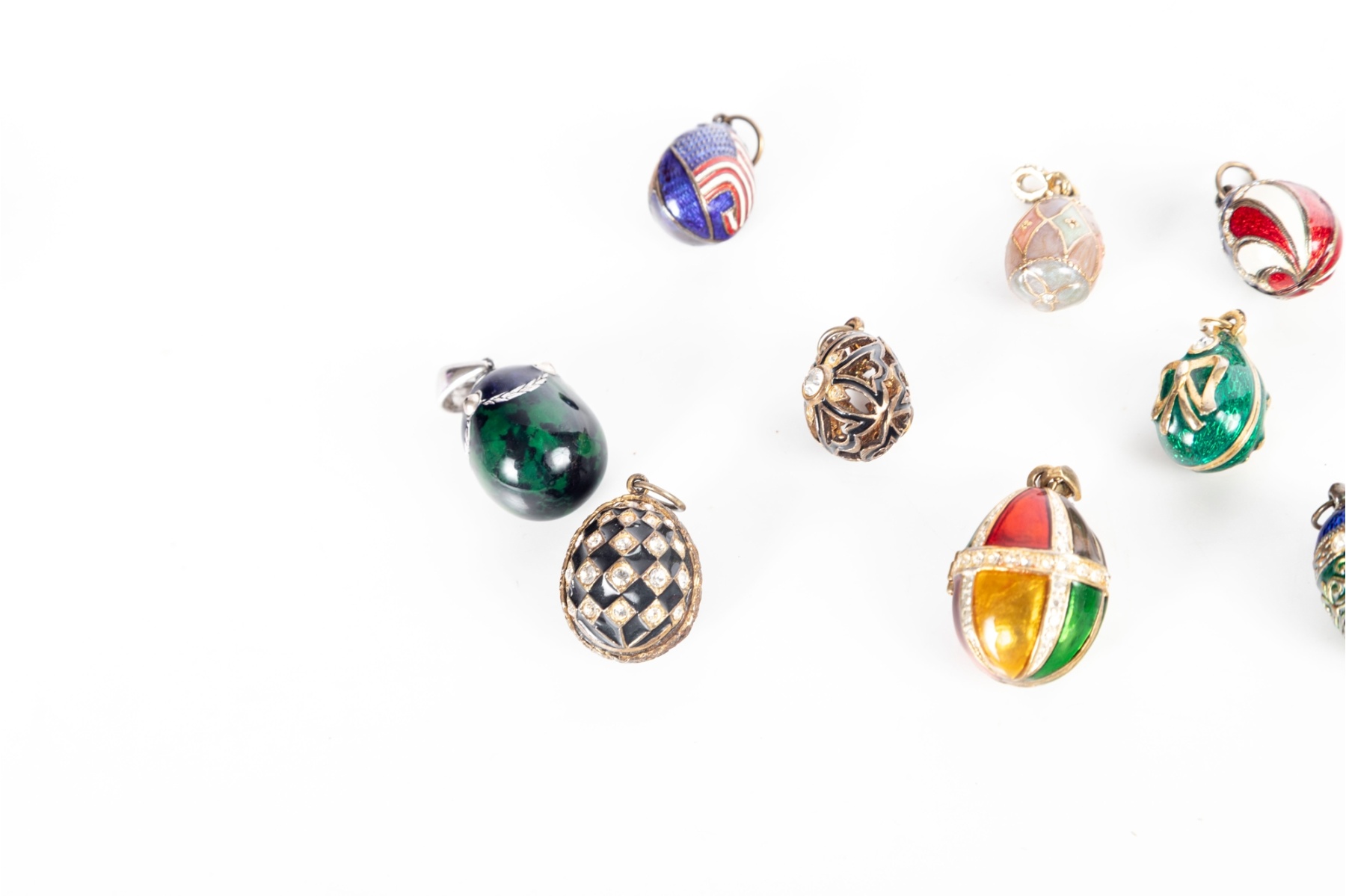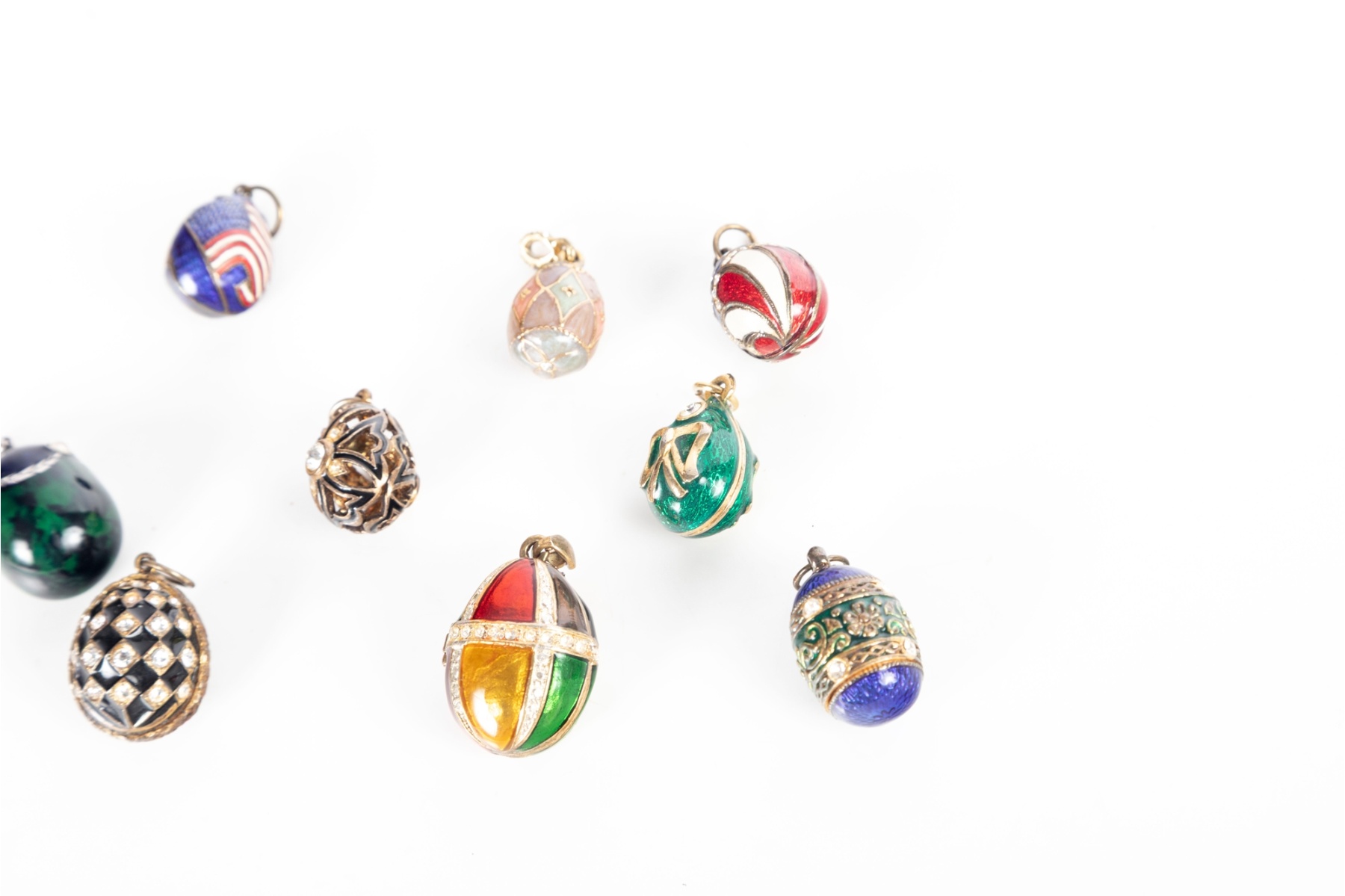 Charming assortment of decorative egg-form pendants inspired by Fabergé designs. This collection features richly colored enamel surfaces, gilt-metal accents, rhinestone embellishments, and a variety of patterns including lattice, bow motifs, florals, and bold geometric panels. All examples are miniature — less than an inch in width/length.