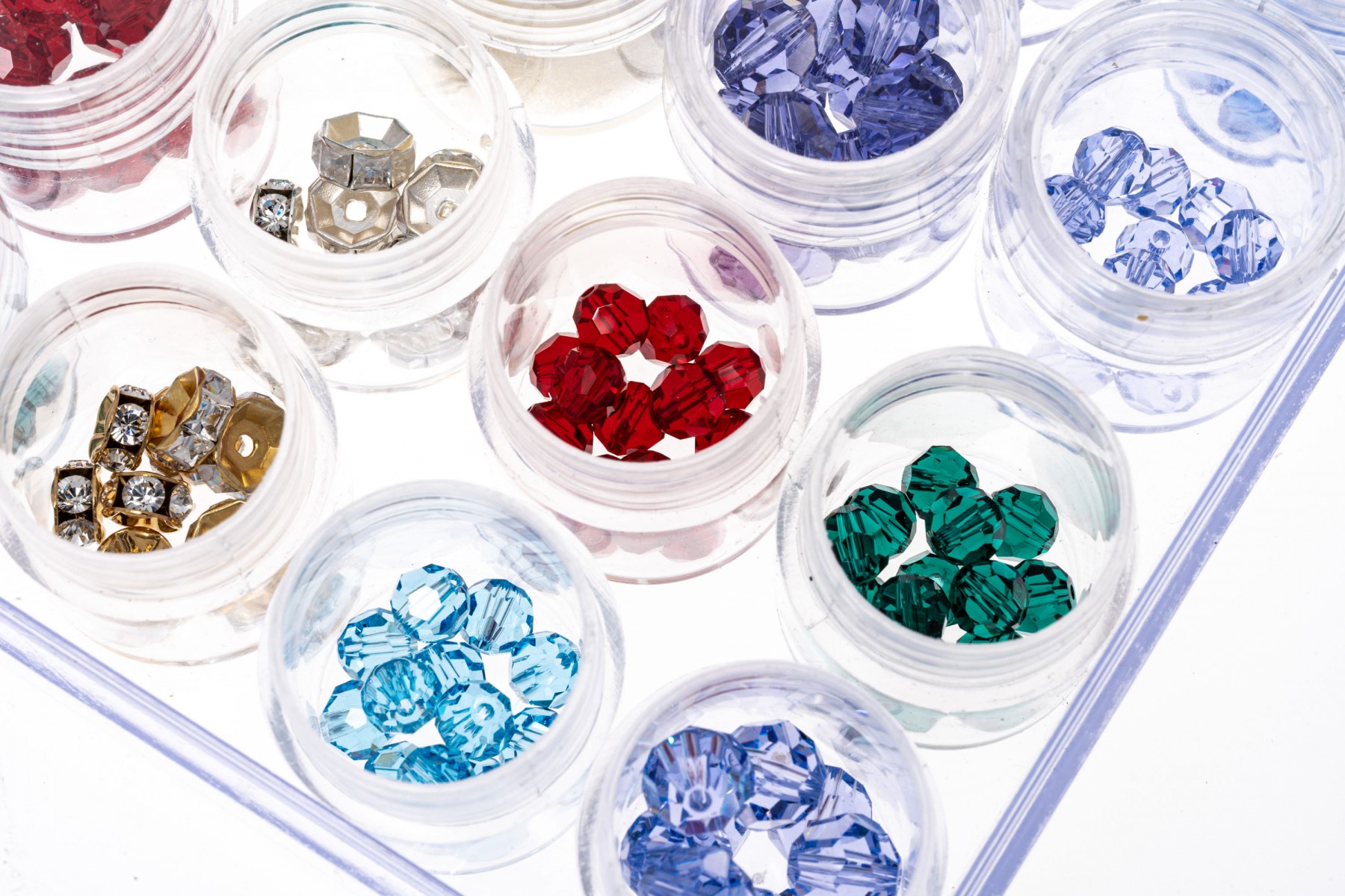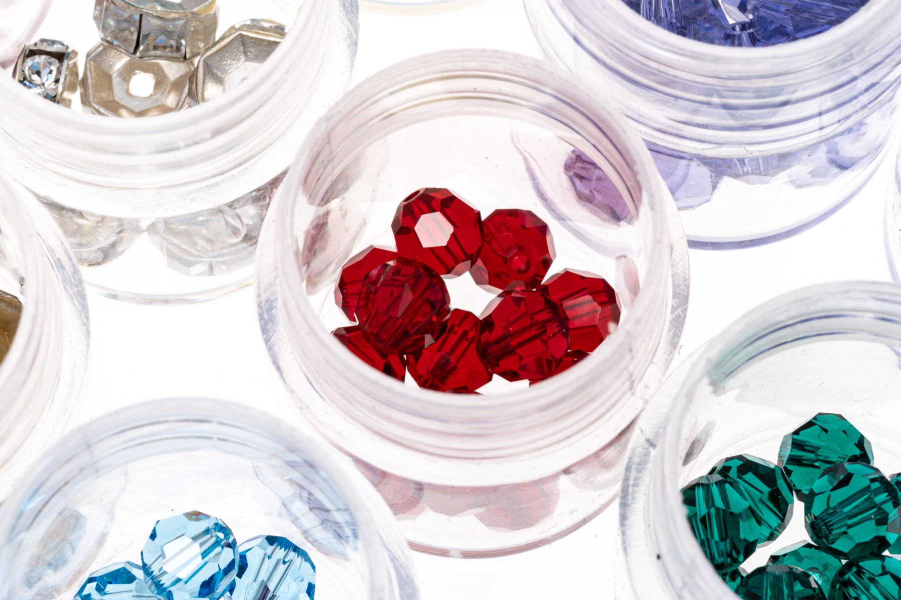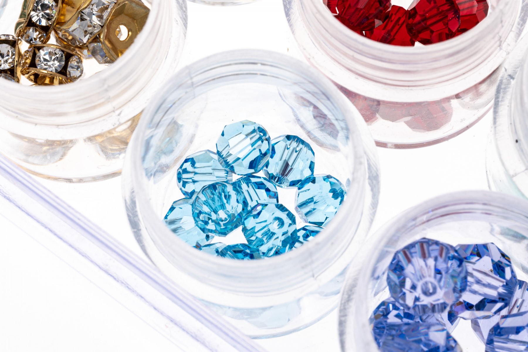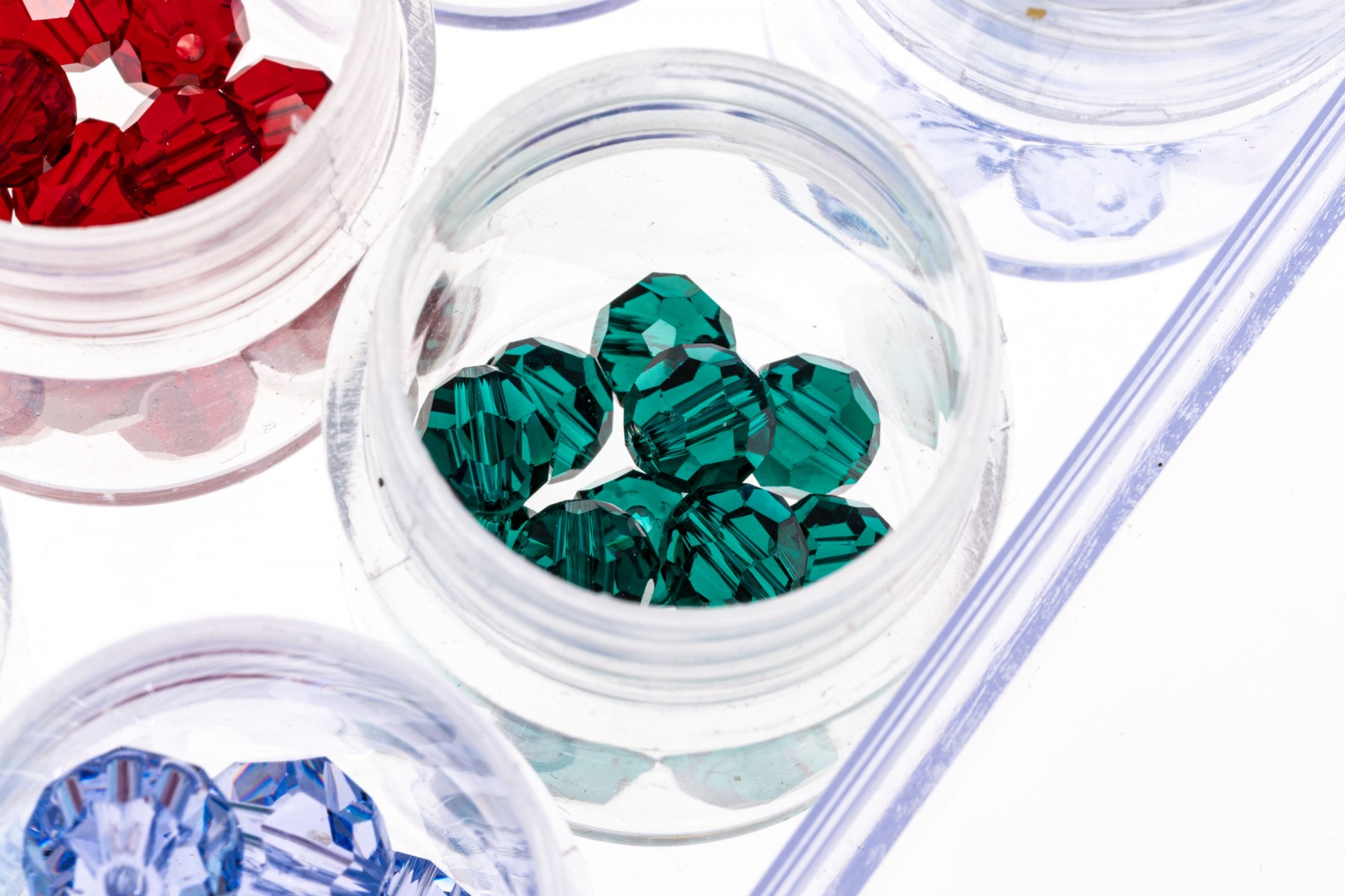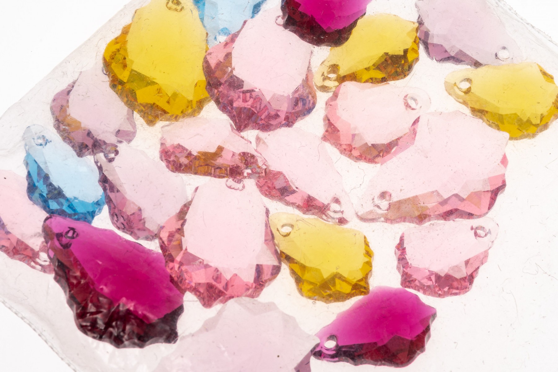 Collection of colorful costume beads. These beads have a faceted design with a variety of shapes.